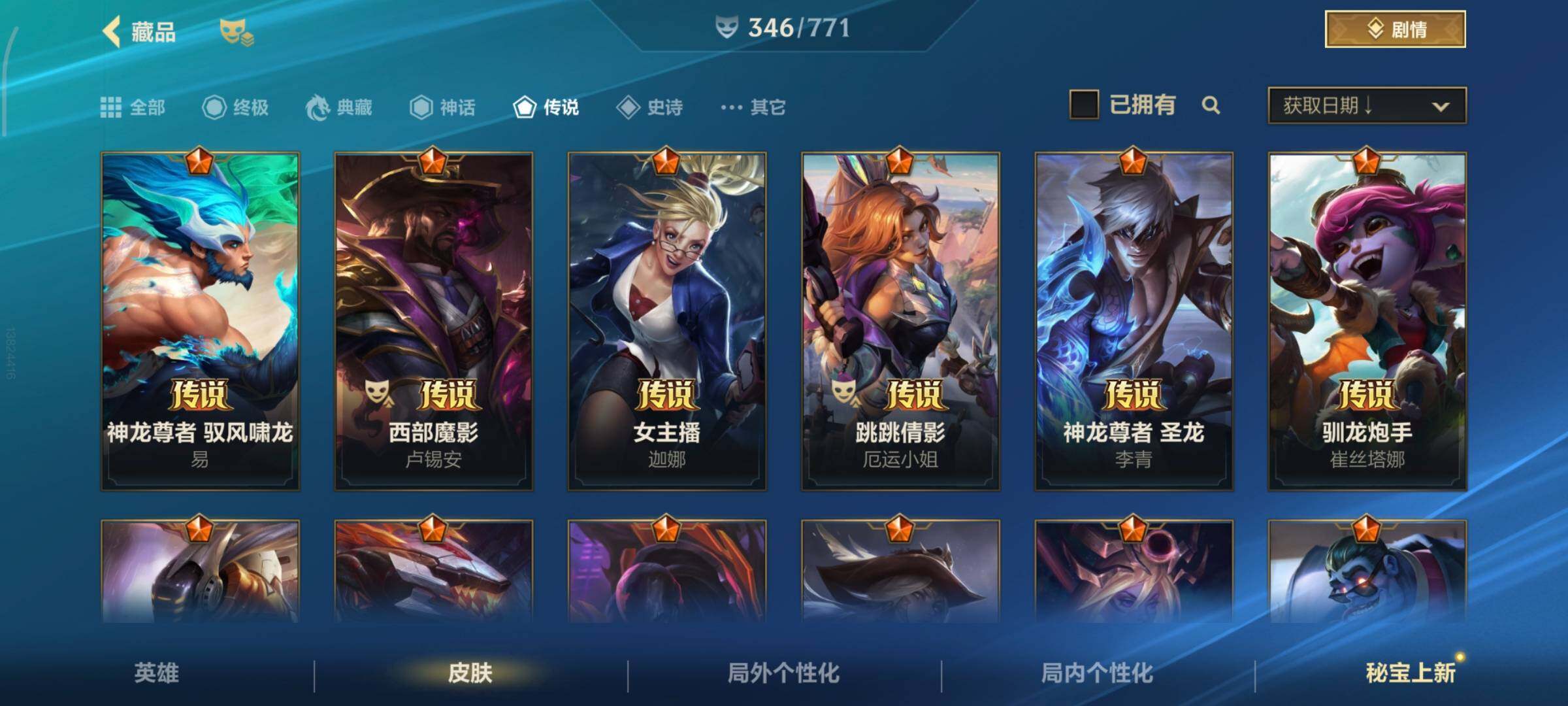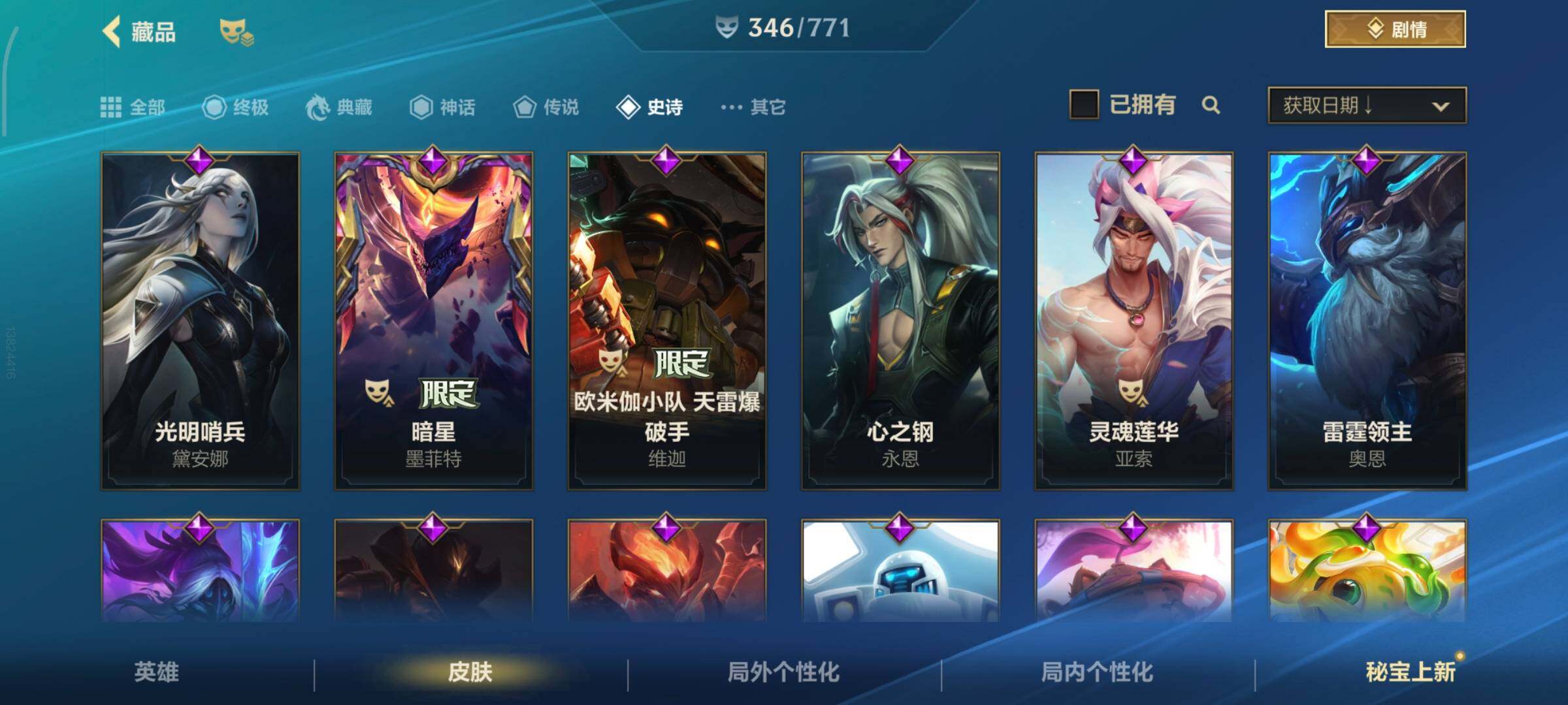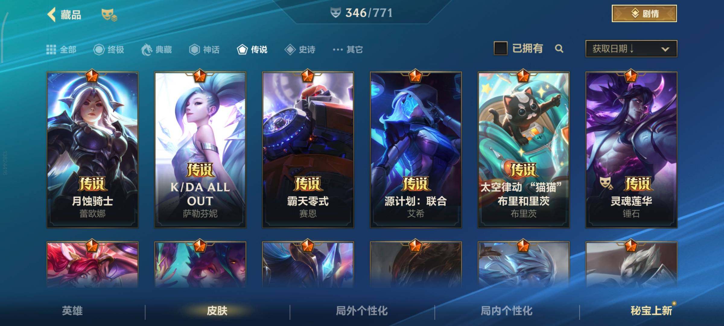 [13378575]有二次!5.6w收藏!346皮肤4神话32传说181史诗!灰烬骑士派克-星守阿狸-星域游侠卡牌-学院白金-张辽吕布-满源计划