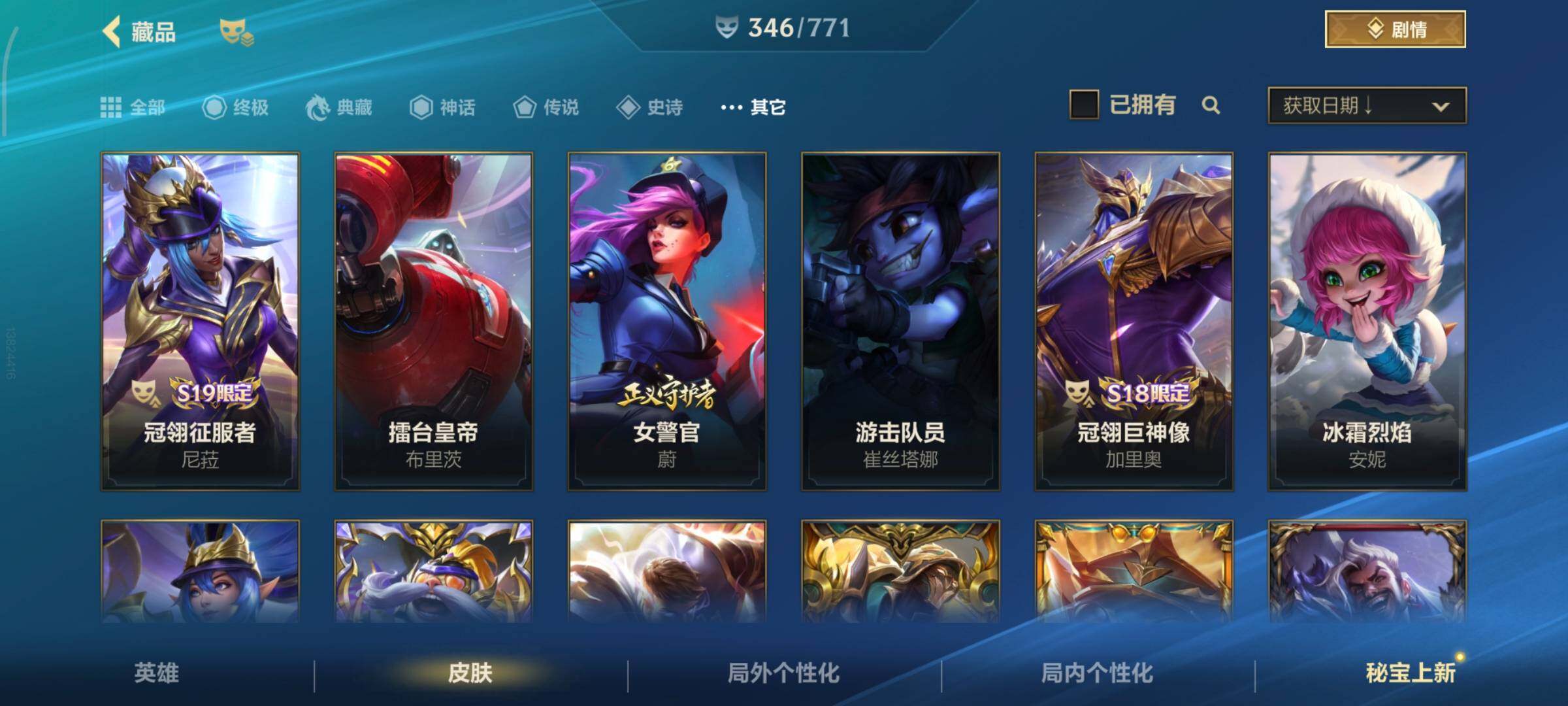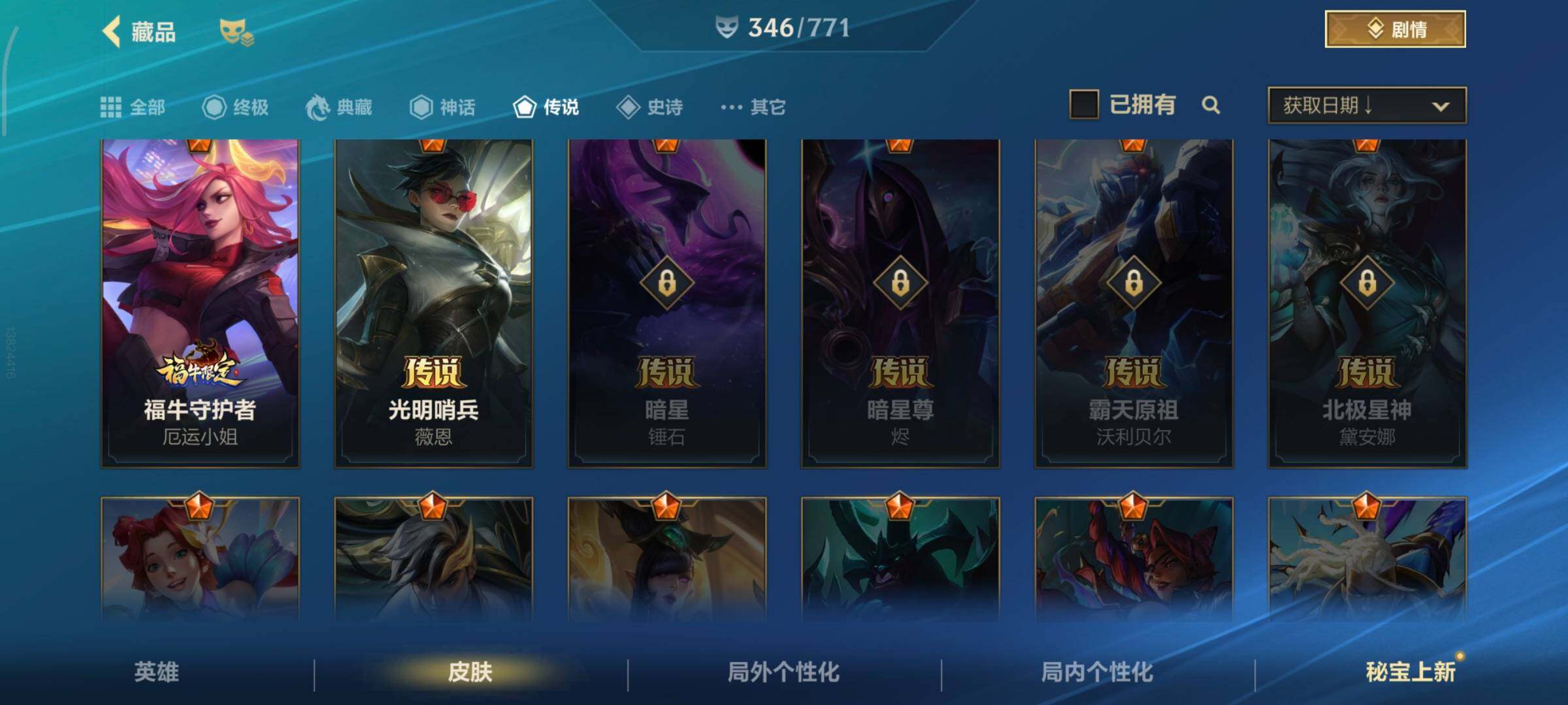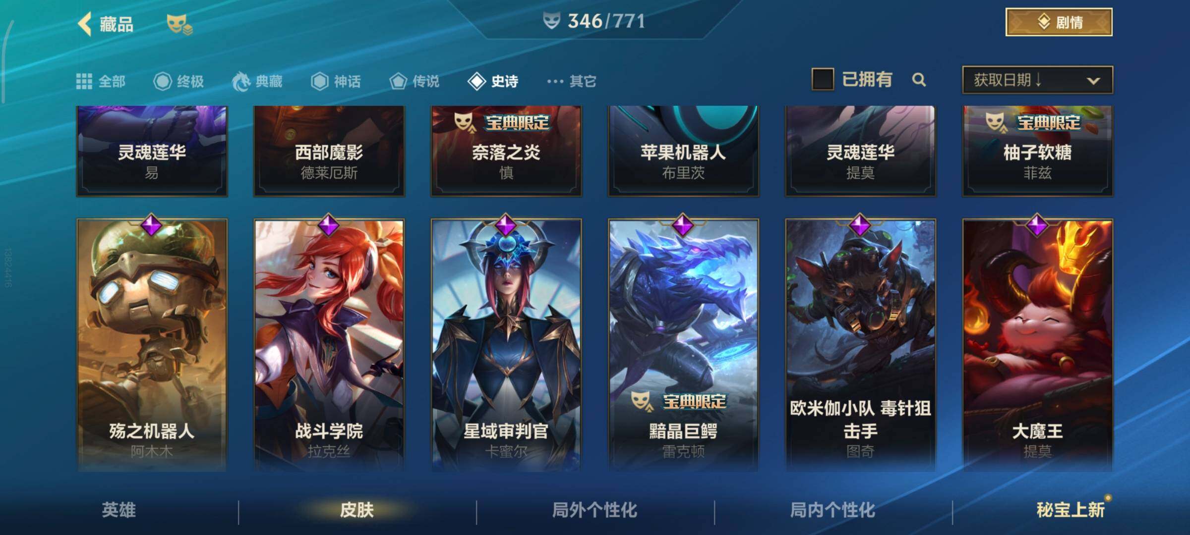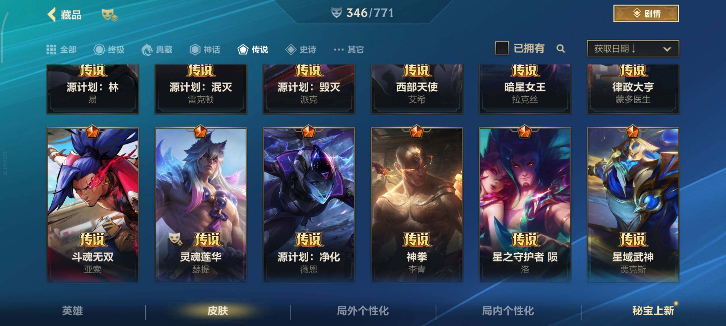 [13378575]有二次!5.6w收藏!346皮肤4神话32传说181史诗!灰烬骑士派克-星守阿狸-星域游侠卡牌-学院白金-张辽吕布-满源计划