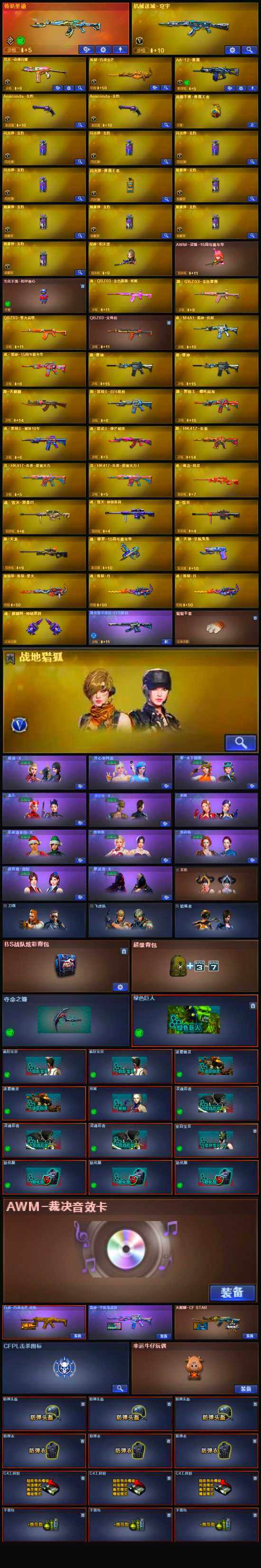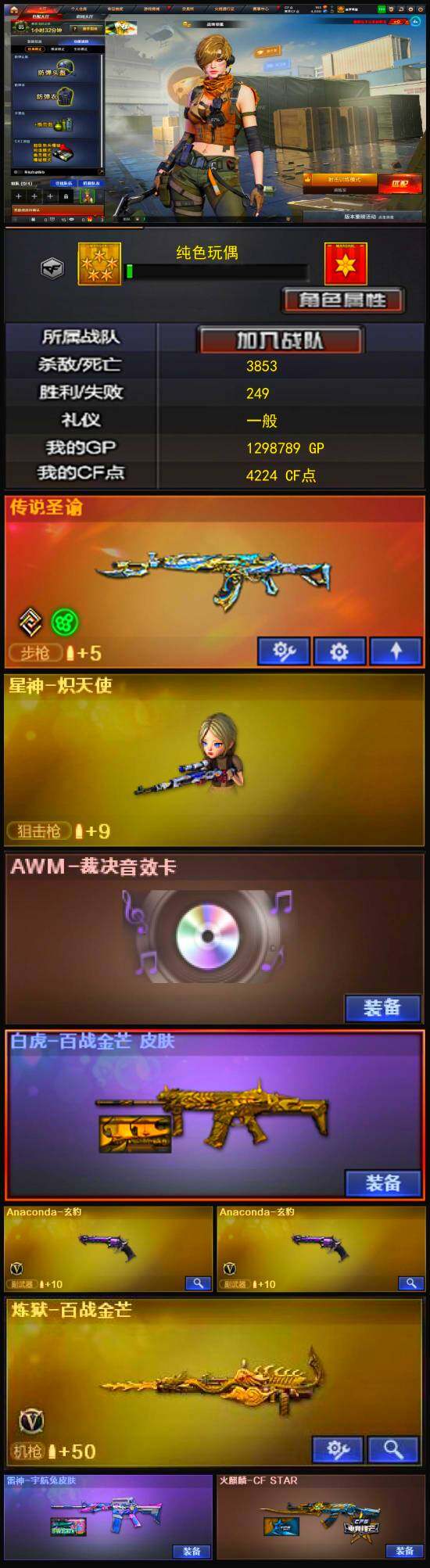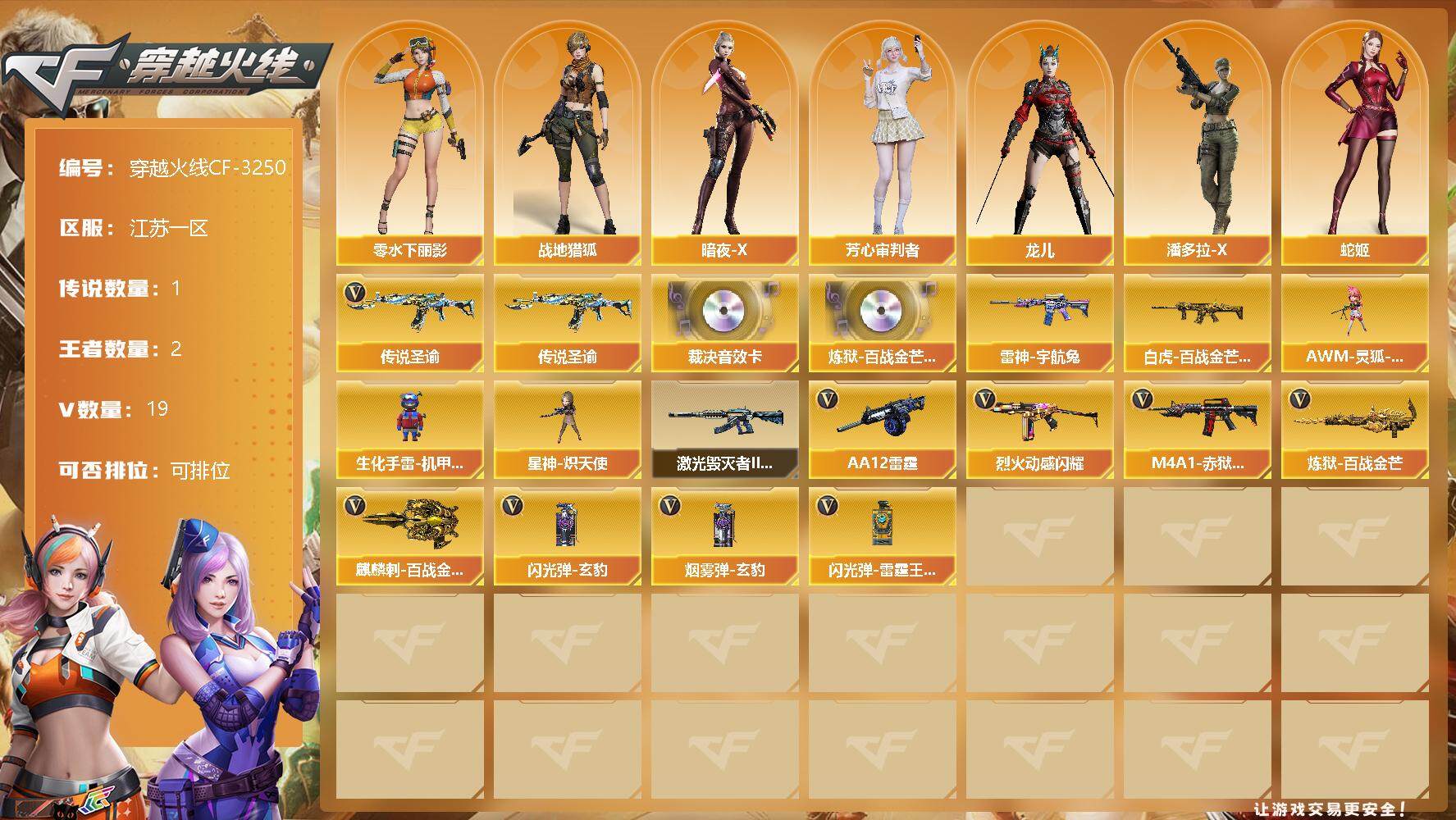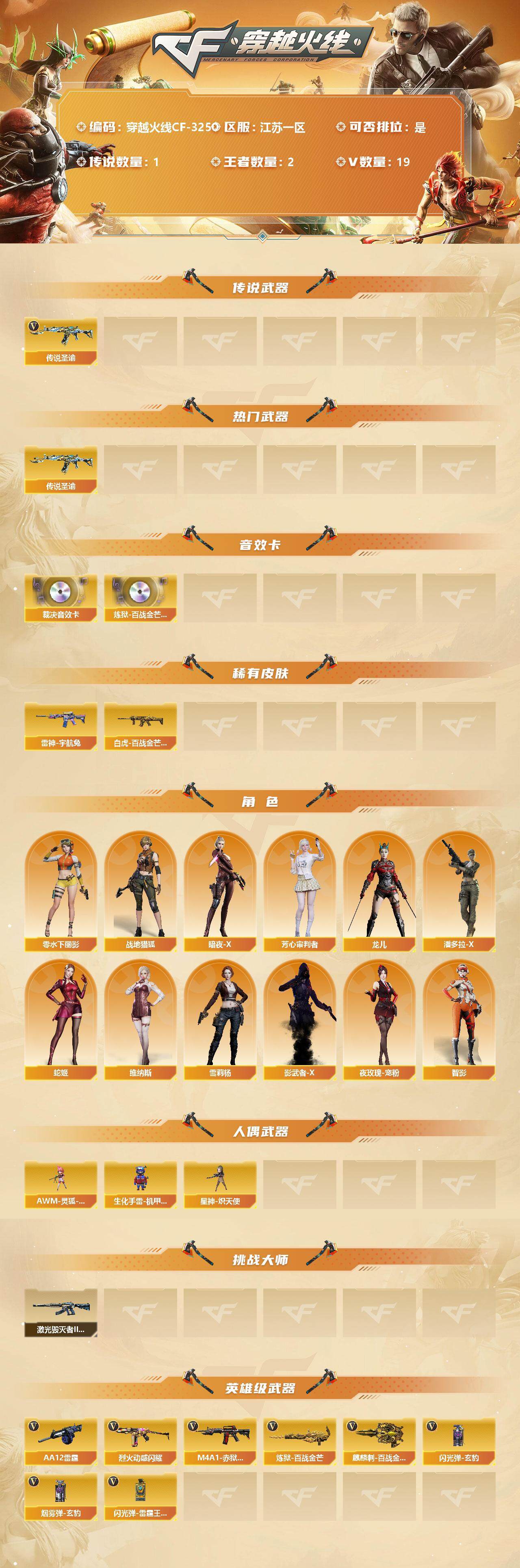 [13368839]江苏一区-19V-2王者-0炫金 【传说武器】:传说圣谕 【热门武器】:传说圣谕 【音效卡】:AWM-裁决音效卡,炼狱-百战金芒-庆典舞曲音效卡 【皮肤】:白虎-百战金芒 皮肤,雷神-宇航兔皮肤,M4A1-再燃火线,火麒麟-雷神,战神-流金岁月皮肤,轻型军用手斧-再燃火线 【角色】:战地猎狐,暗夜-X,芳心审判者,零-水下丽影,龙儿,潘多拉-X,蛇姬,维纳斯,雪莉杨,夜玫瑰-宠粉,影武者-X,智影 【人偶武器】:星神-炽天使,AWM-灵狐-15周年嘉年华,生化手雷-机甲核心 【挑战大师】:激光毁灭者III-白马银枪 【英雄级武器】:烈火-动感闪耀,炼狱-百战金芒,AA-12-雷霆,麒麟刺-百战金芒,闪光弹-玄豹*4,闪光弹-雷霆王者-觉醒版,烟雾弹-玄豹*5,M4A1-赤狱骑士 【道具】:BS战队炫彩背包,亚洲杯纪念炫彩背包,百战金芒炫彩背包,超级背包,女皇终结者-魔龙之吻,救世主-黑桃战神,绿色巨人,灵魂忍者*3,变异宝贝,妖姬,迷雾幽灵*2,夺命之镰,防化服*3,流光-鎏金之域,流光-再燃火线,枪王排位29赛季金色流光,语音特效-盛典烟火,萌萌小葵表情,CFPL选手表情-第1套,防弹头盔*3,防弹衣*3,C4工具钳*3,手雷包*3 【特殊枪械】: