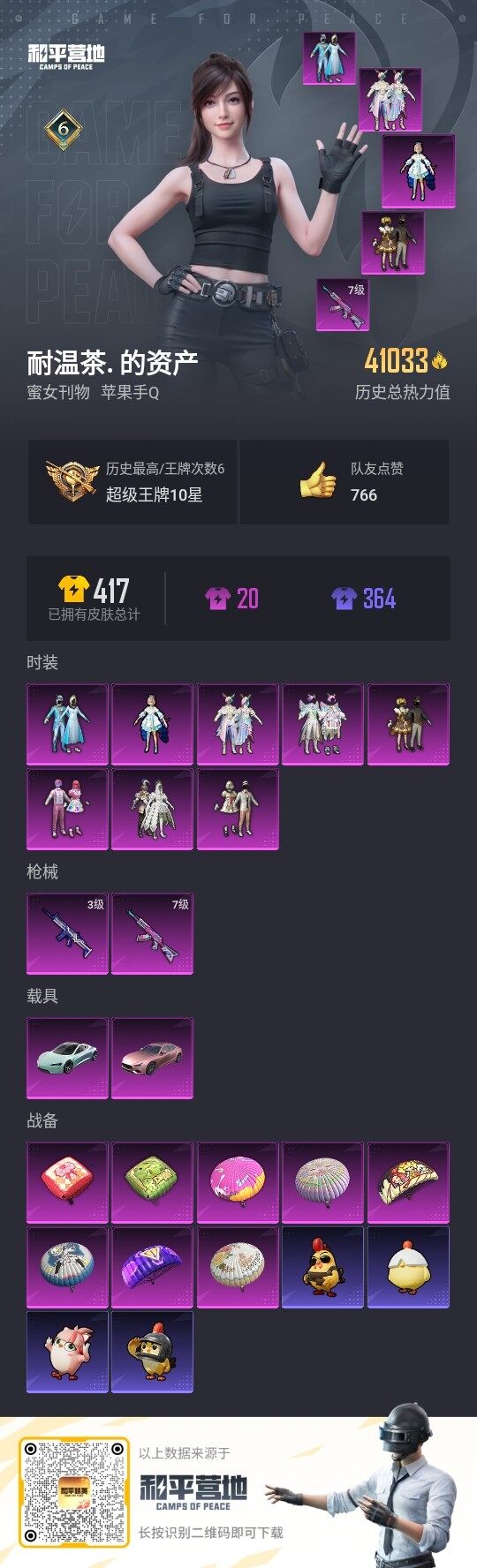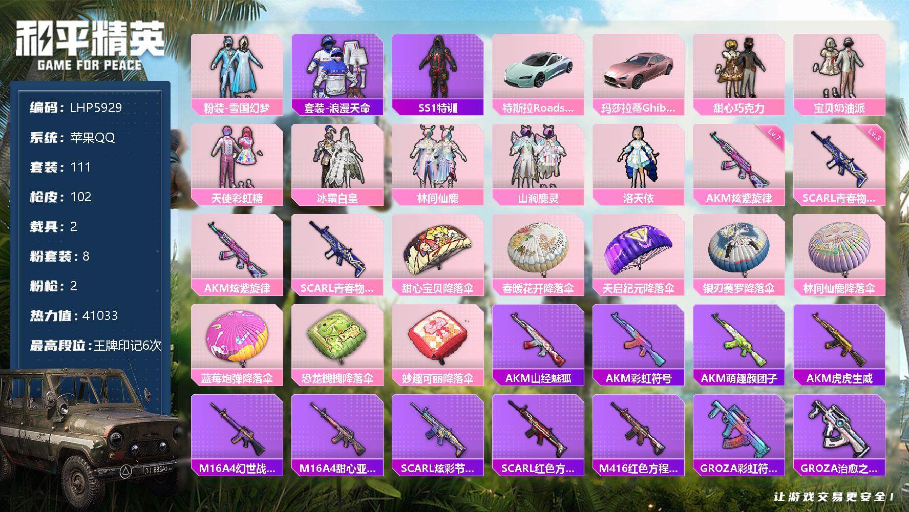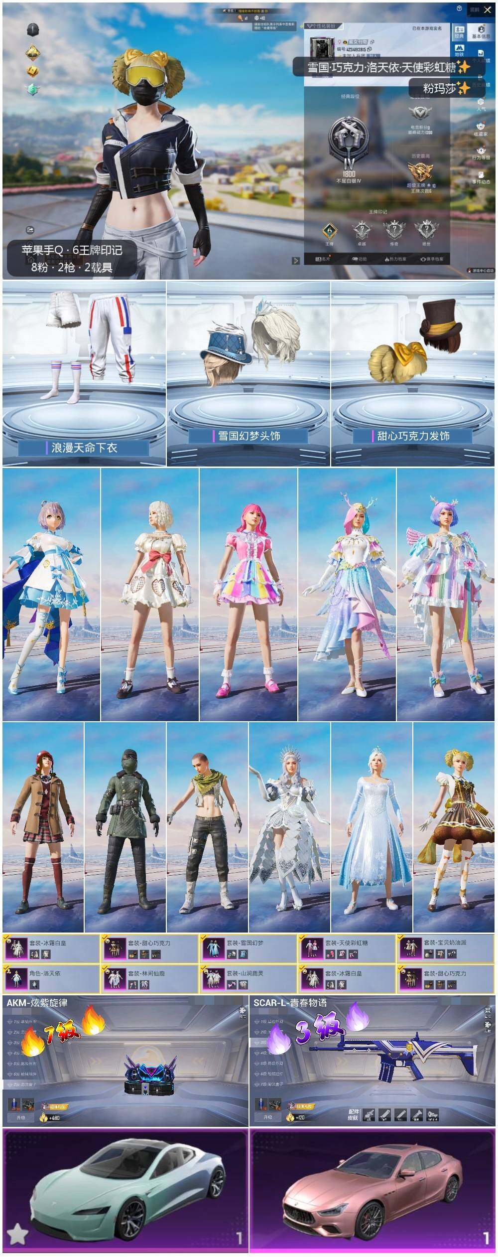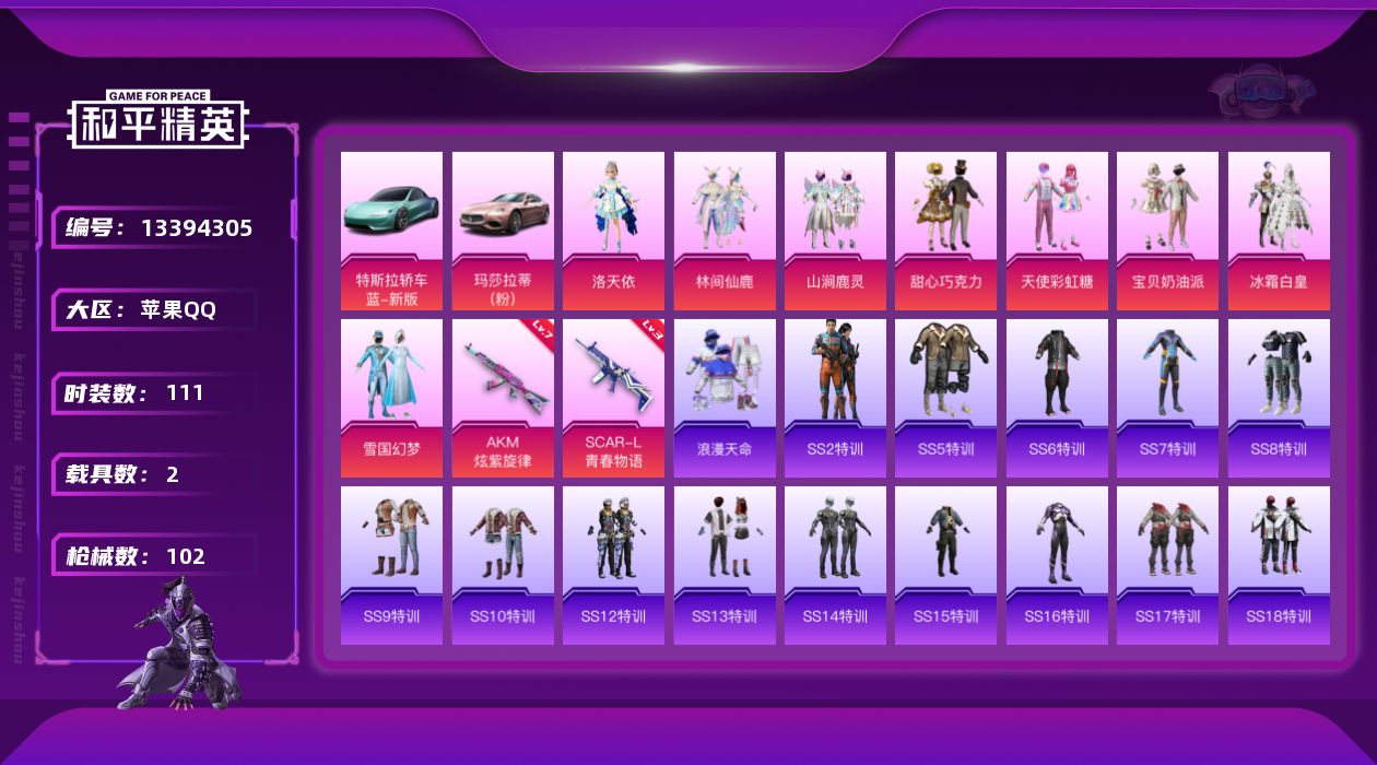 [13394305]连体王者贵族7级 素材身法号 苹果 手Q-8粉装-2特效枪-2载具-4.1w热力值-6王牌印记-111套装-102枪皮【热门品类】:粉装-雪国幻梦,套装-浪漫天命,套装-SS1特训【粉色载具】:特斯拉Roadster(水滴蓝),玛莎拉蒂Ghibli(粉)【粉色套装】:粉装-甜心巧克力,粉装-宝贝奶油派,粉装-天使彩虹糖,粉装-雪国幻梦,粉装-冰霜白皇,粉装-林间仙鹿,粉装-山涧鹿灵,角色-洛天依【粉色枪皮等级】:AKM-炫紫旋律(七级),SCAR-L-青春物语(三级)