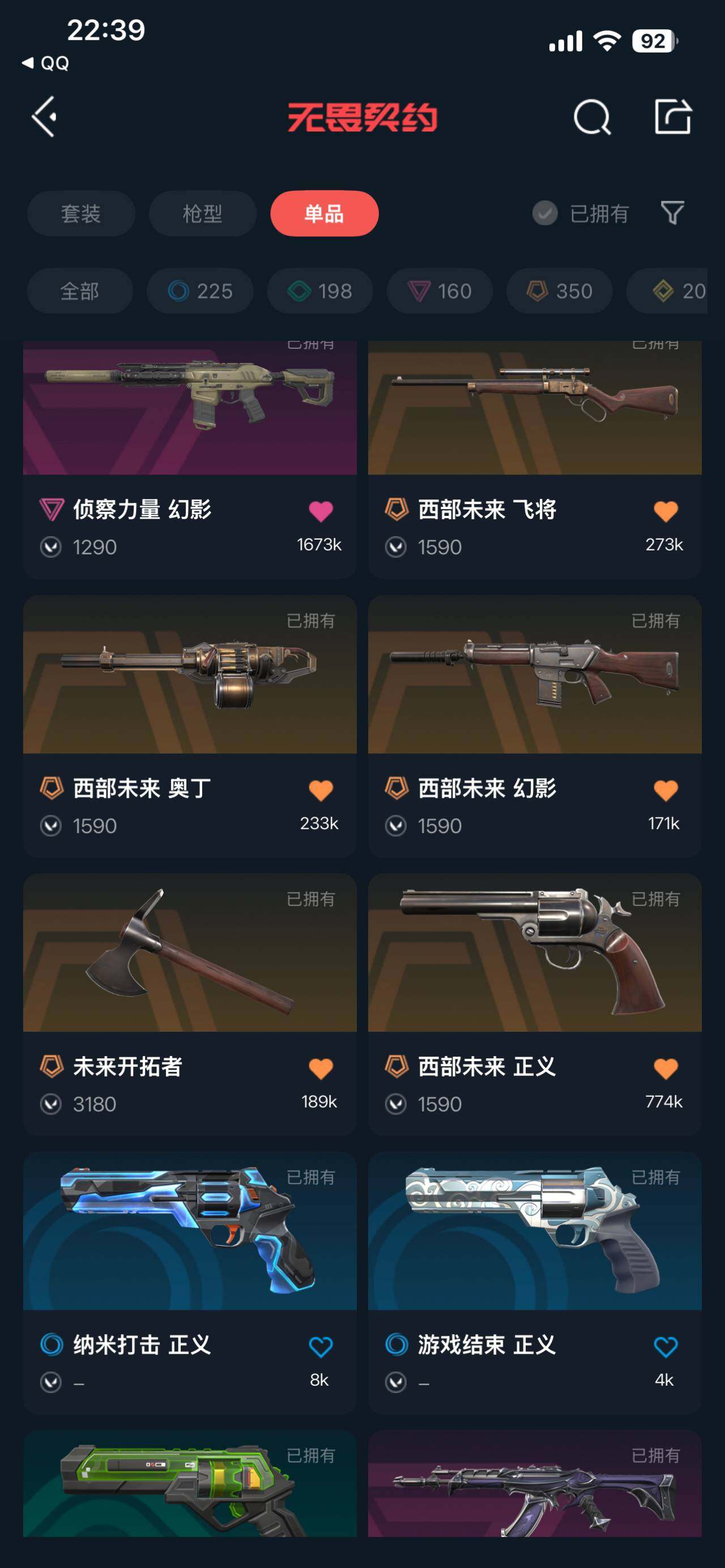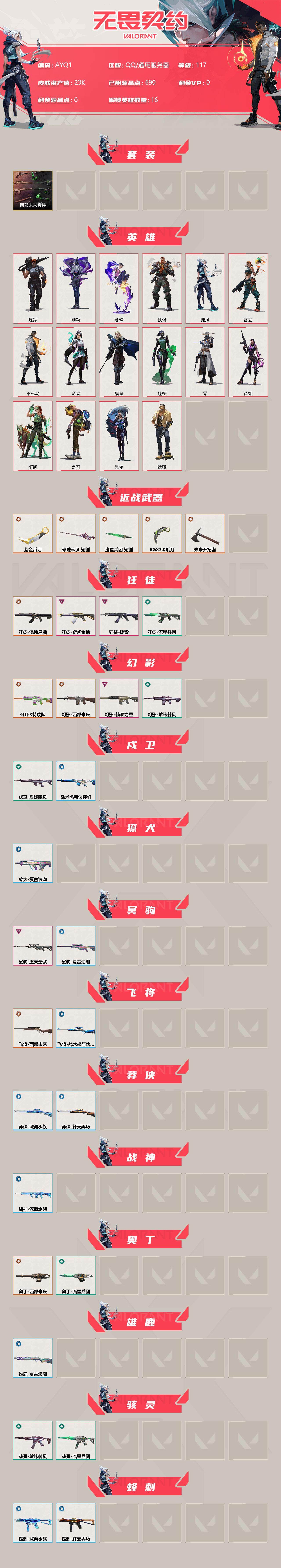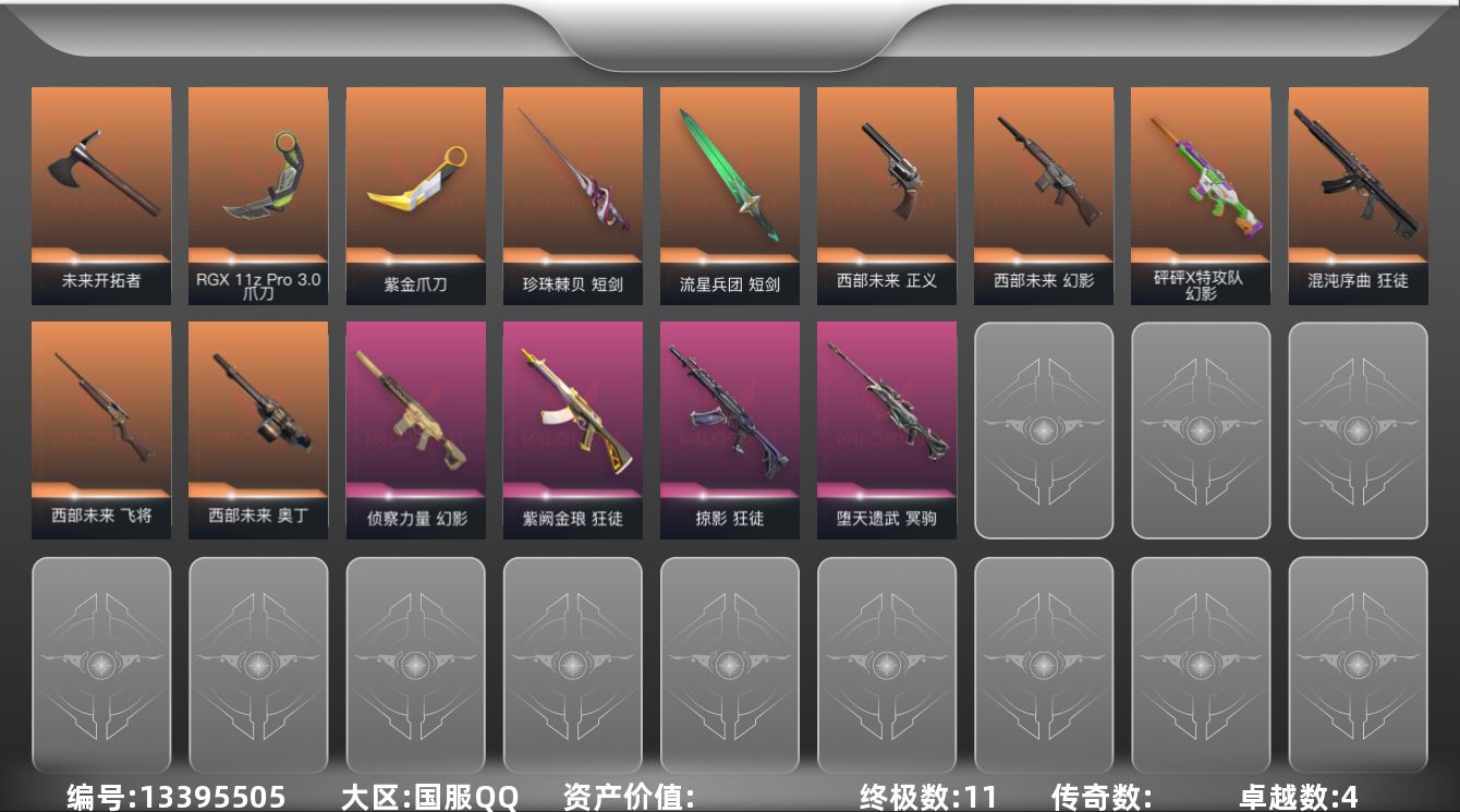 [13395505]皮肤资产价值23640【套装】:西部未来套装 【英雄】:炼狱,维斯,暮蝶,钛狐,铁臂,捷风,雷兹,不死鸟,贤者,猎枭,蝰蛇,零,芮娜,斯凯,盖可,黑梦 【近战 武器】:近战武器-紫金爪刀,近战武器-RGX 11z Pro//3.0 爪刀,近战武器-未来开拓者,近战武器-珍珠棘贝 短剑,近战武器-流星兵团 短剑 【狂徒】:狂徒-混沌序曲,狂徒-掠影,狂徒-紫阙金琅,狂徒-流星兵团 【幻影】:幻影-砰砰X特攻队,幻影-西部未来,幻影-侦察力量,幻影-珍珠棘贝,幻影-西部未来 【戍卫】:戍卫-珍珠棘贝,戍卫-战术熊与伙伴们 【獠犬】:獠犬-复古浪潮 【冥驹】:冥驹-堕天遗武,冥驹-复古浪潮 【飞将】:飞将-西部未来,飞将-战术熊与伙伴们 【莽侠】:莽侠-深海水族,莽侠-纤云弄巧 【战神】:战神-深海水族 【奥丁】:奥丁-西部未来,奥丁-流星兵团 【雄鹿】:雄鹿-复古浪潮 【骇灵】:骇灵-流星兵团,骇灵-珍珠棘贝 【蜂刺】:蜂刺-深海水族,蜂刺-纤云弄巧 【标配】:标配-超能偶像,标配-战术熊与伙伴们 【正义】:正义-西部未来,正义-超限闪存,正义-复古浪潮,正义-纳米打击,正义-纤云弄巧,正义-游戏结束 【鬼魅】:鬼魅-流星兵团,鬼魅-宿怨 【狂怒】:狂怒-珍珠棘贝,狂怒-战术熊与伙伴们 【短炮】:短炮-深海水族,短炮-纤云弄巧 【卡面】:终章:激斗汉堡 卡面,进入射程 卡面,《双城之战》拥抱 卡面,精灵大战 卡面,欢迎来到底城 卡面,南瓜盛典 卡面,VCT CN首冠 卡面,修车达人 卡面,热舞环节 卡面,正义的化身 卡面,终章:生意人麦宝 卡面,铁之华 卡面,时间到 卡面,最高舞台 卡面,音熊登场 卡面,树懒大作战 卡面,声感陷阱设计图 卡面,Clutch 卡面,霓帧牛蛙 卡面,梦幻奶茶 卡面,终章:打造专属狂徒 卡面,趁热吃 卡面,西装暴徒 卡面,失控边缘 卡面,哨卫者之领域 卡面,艺无止境//全球冠军赛 卡面,暮蝶工牌 卡面,战术熊与伙伴们 卡面,源能反应 卡面,流星兵团 卡面,纤云弄巧 卡面,暂别喧嚣 卡面,打造专属狂徒 卡面,零点嗅探设计图 卡面,终章:瓦娃脸雪糕 卡面,表象之下 卡面,虹吸式咖啡壶 卡面,源能者美容 卡面,脚踝终结者 卡面 ,夜班 卡面,瓦娃脸雪糕 卡面 ,沙雕爆能器 卡面,无畏契约GO!第一卷:芮娜 卡面,深海水族 卡面,珍珠棘贝 卡面,复