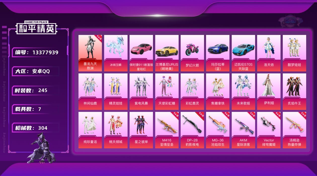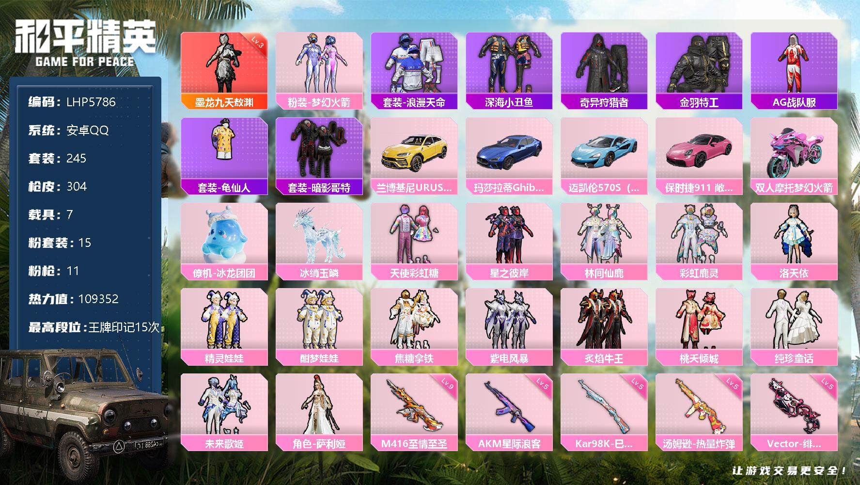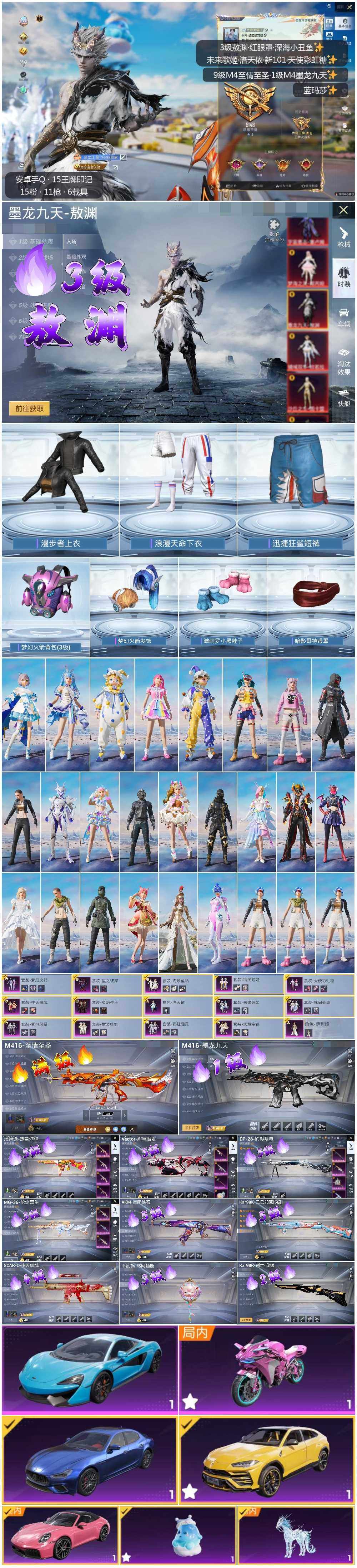 [13377939]【店主推荐捡漏号!可直接换绑】素材身法号/M416-至情至圣(九级) 安卓 手Q-1神装-15粉装-11特效枪-7载具-7粉色飞行器-10.9w热力值-15王牌印记-245套装-304枪皮【红色神装等级】:墨龙九天-敖渊(三级)【热门品类】:粉装-梦幻火箭,套装-浪漫天命,套装-深海小丑鱼,套装-奇异狩猎者,套装-金羽特工,套装-AG战队服,套装-龟仙人,套装-暗影哥特【粉色载具】:兰博基尼URUS(明艳黄),玛莎拉蒂Ghibli(蓝),迈凯伦570S(天际蓝),保时捷911 敞篷版(星珀红),双人摩托-梦幻火箭,僚机-冰龙团团,冰绡玉鳞【粉色套装】:粉装-天使彩虹糖,粉装-梦幻火箭,粉装-星之彼岸,粉装-林间仙鹿,粉装-彩虹鹿灵,角色-洛天依,粉装-精灵娃娃,粉装-酣梦娃娃,粉装-焦糖拿铁,粉装-紫电风暴,粉装-炙焰牛王,粉装-桃夭倾城,粉装-纯珍童话,粉装-未来歌姬,角色-萨利娅【粉色枪皮等级】:AKM-星际浪客(五级),SCAR-L-桃夭倾城(四级),M416-至情至圣(九级),M416-墨龙九天(一级),Vector-绯穹魔姬(五级),汤姆逊-热量炸弹(五级),Kar98K-创世·救赎(二级),Kar98K-巳巳如意(五级),DP-28-豹影疾电(五级),MG-36-沧焰双生(五级),平底锅-林间仙鹿(三级)【粉色飞行器】:梦幻火箭飞行器,太空嘟嘟飞行器,桃夭倾城飞行器,龙翔九天飞行器,灵猫魔法师飞行器,灵珠游龙飞行器