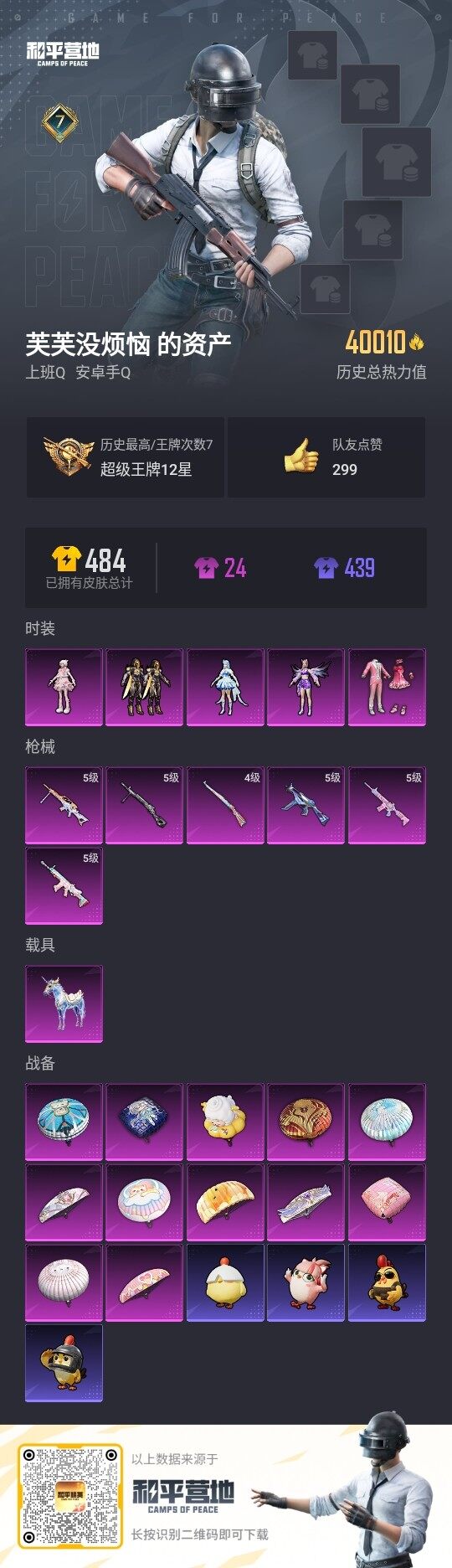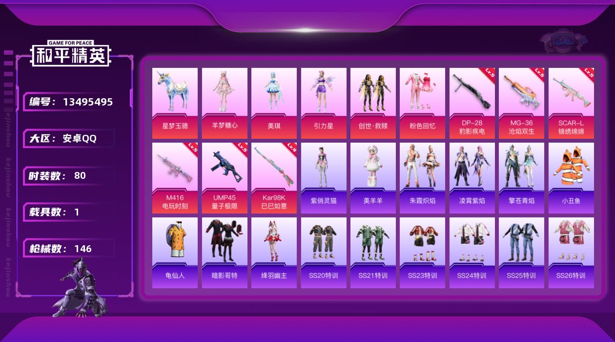 [13495495]【店主推荐捡漏号!可直接换绑】/地铁满天赋 安卓 手Q-5粉装-6特效枪-1载具-4w热力值-7王牌印记-80套装-146枪皮【热门品类】:套装-深海小丑鱼,套装-小丑鱼,套装-奇异狩猎者,套装-龟仙人,套装-暗影哥特【粉色载具】:星梦玉骢【粉色套装】:粉装-粉色回忆,角色-美琪,角色-引力星,套装-创世·救赎,角色-羊梦糖心【粉色枪皮等级】:SCAR-L-锦绣绵绵(五级),M416-电玩时刻(五级),UMP45-量子极限(五级),Kar98K-巳巳如意(四级),DP-28-豹影疾电(五级),MG-36-沧焰双生(五级)