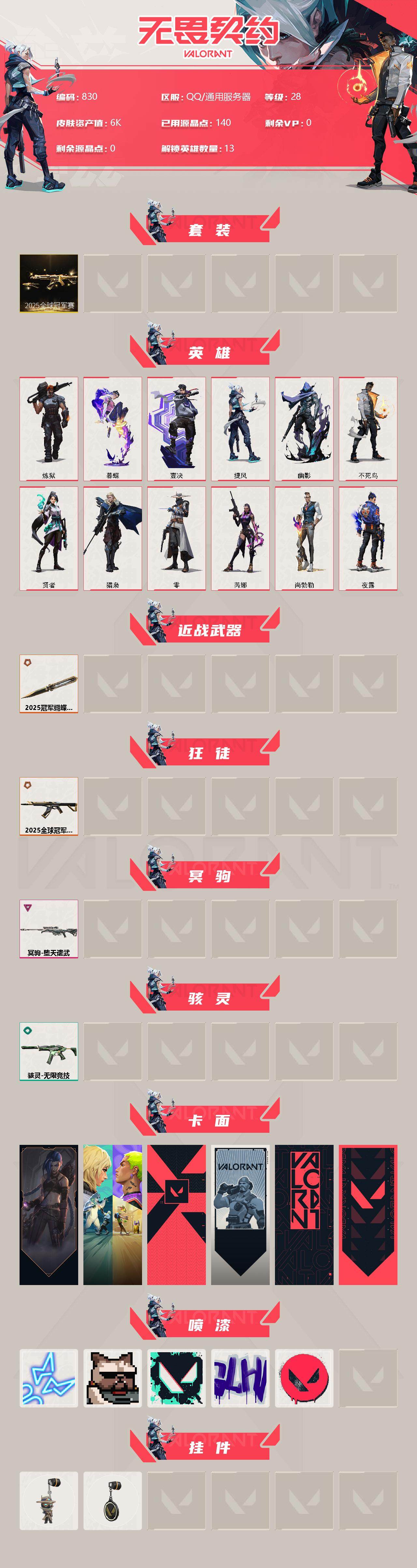 [13432499]【套装】:2025全球冠军赛套装 【英雄】:炼狱,暮蝶,壹决,捷风,幽影,不死鸟,贤者,猎枭,零,芮娜,尚勃勒,夜露 【近战 武器】:近战武器-2025全球冠军赛 蝴蝶刀 【狂徒】:狂徒-2025全球冠军赛 【冥驹】:冥驹-堕天遗武 【骇灵】:骇灵-无限竞技 【卡面】:《双城之战》金克丝 卡面,钢锁vs盖可 卡面,代号红色 卡面,新兵报到 卡面,V契约 卡面,无畏契约 卡面 【喷漆】:霓光四射 喷漆,关门放狗 喷漆,胜利属于无畏契约 喷漆,GLHF 喷漆,无畏契约 喷漆 【挂饰】:无畏契约GO!第一卷 零 挂饰,无畏契约 纪念币 挂饰