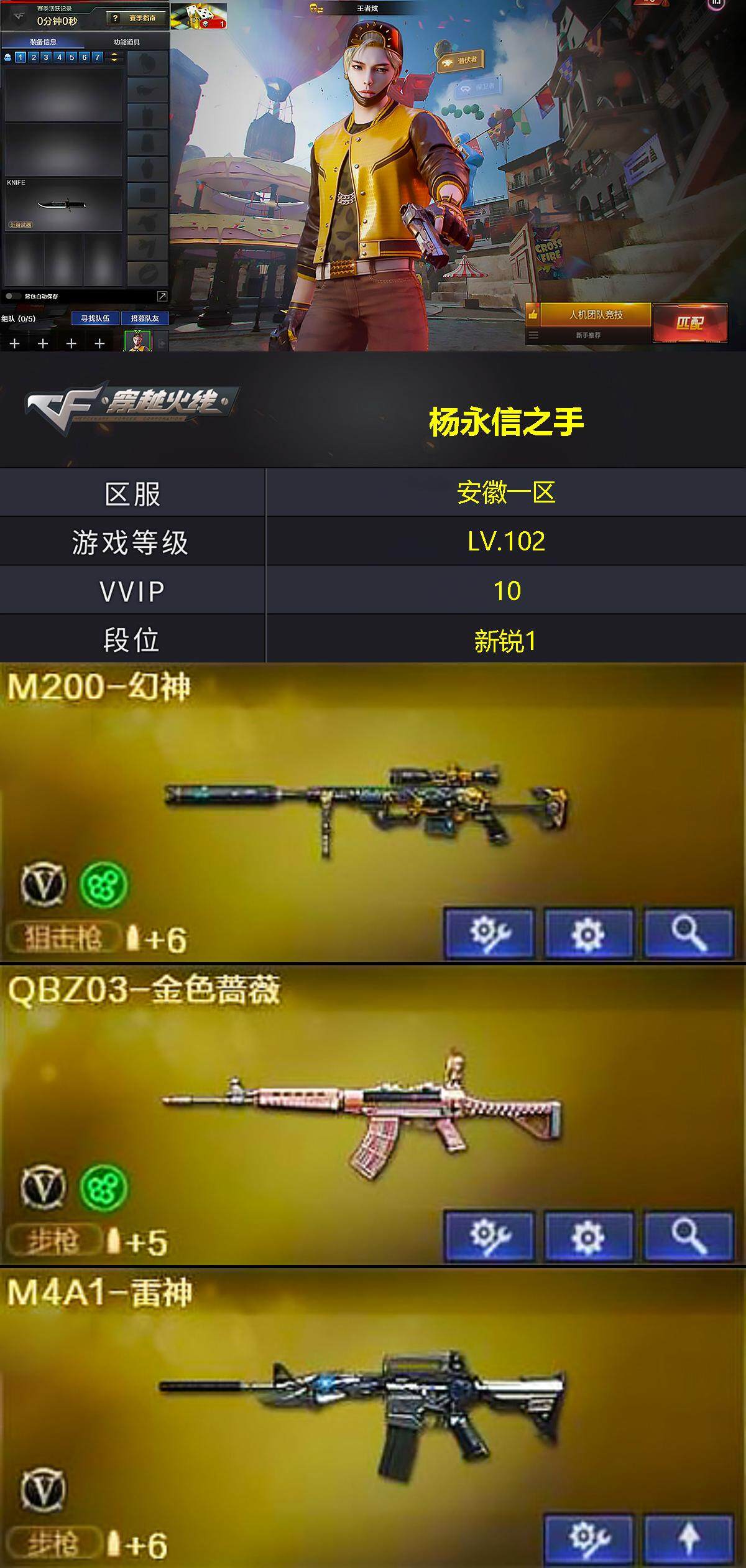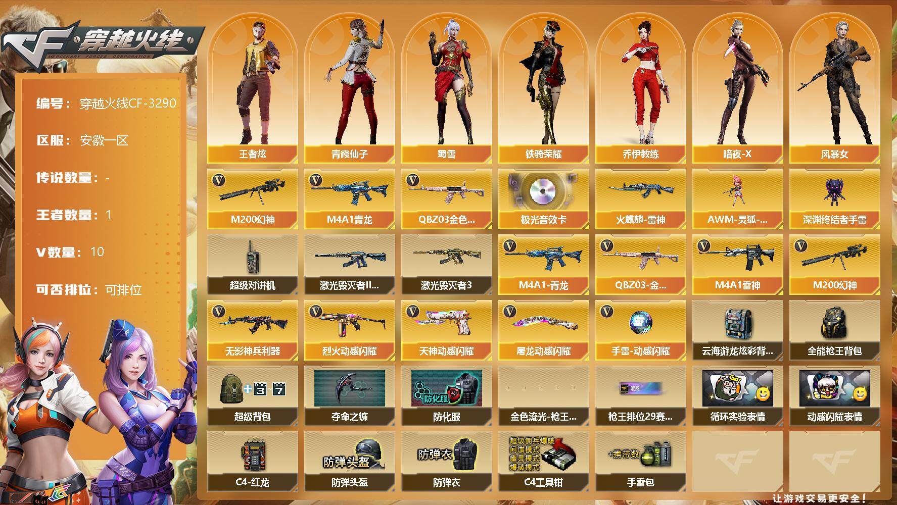 [13437039]安徽一区-10V-1王者-0炫金 【热门武器】:QBZ03-金色蔷薇,M4A1-青龙,M200-幻神 【音效卡】:Barrett-极光音效卡 【皮肤】:火麒麟-雷神 【角色】:王者炫,乔伊教练,暗夜-X,风暴女,嘉年华灵狐,灵狐者-X,麻雀,曼陀罗-X,潘多拉-X,青霞仙子,蜀雪,铁骑荣耀 【人偶武器】:AWM-灵狐-15周年嘉年华,深渊终结者手雷 【暴走生化】:超级对讲机 【挑战大师】:激光毁灭者III-白马银枪*2,激光毁灭者III*5 【英雄级武器】:M4A1-雷神,M4A1-青龙,无影-神兵利器,QBZ03-金色蔷薇,烈火-动感闪耀,M200-幻神,天神-动感闪耀,屠龙-动感闪耀,手雷-动感闪耀 【道具】:云海游龙炫彩背包,全能枪王背包,超级背包,夺命之镰,防化服,金色流光-枪王排位*2,星辰流光-枪王排位,枪王排位29赛季金色流光,循环实验表情,动感闪耀表情,C4-红龙,防弹头盔*2,防弹衣*2,C4工具钳*2,手雷包*2 【特殊枪械】: