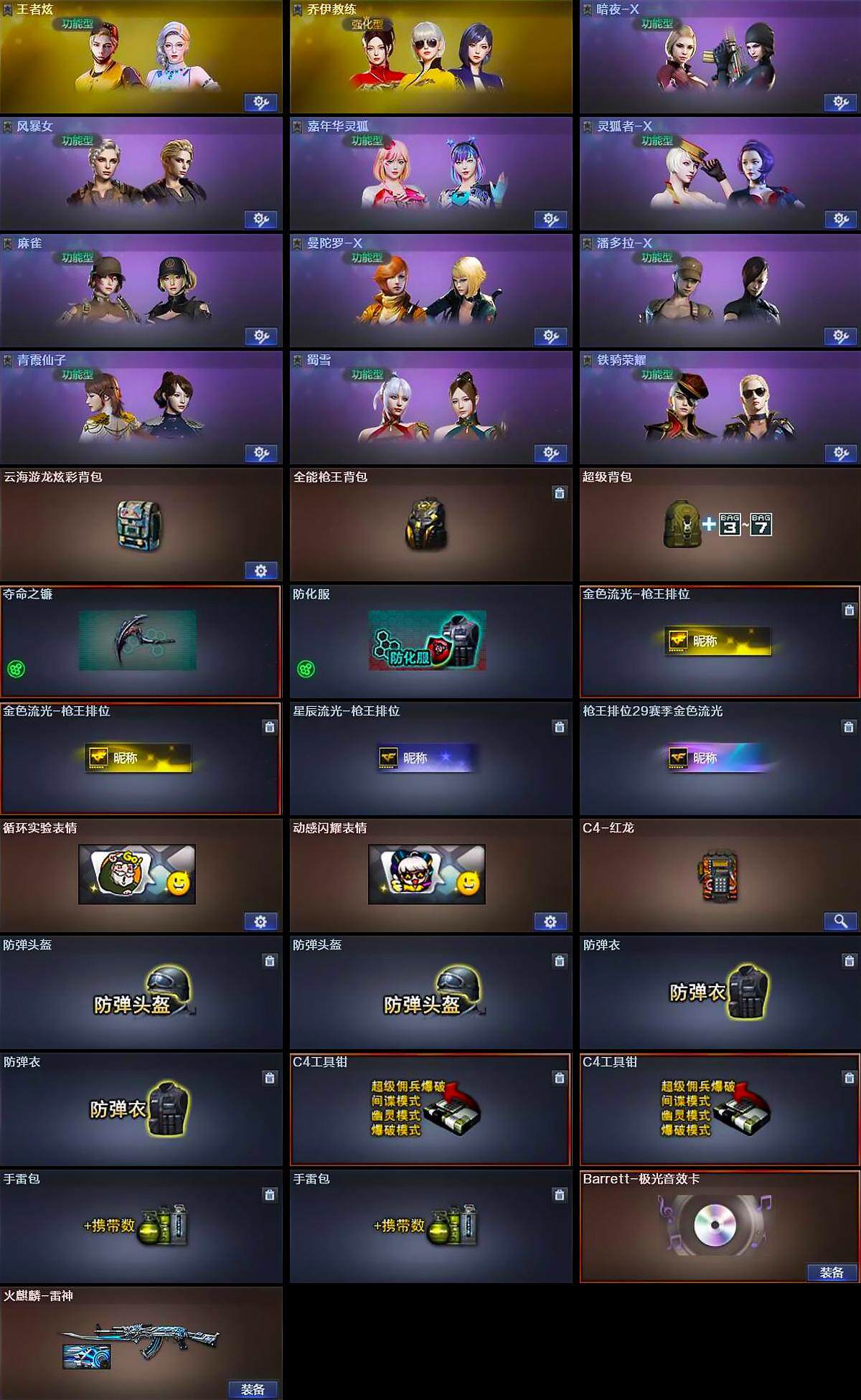 【道具】:云海游龙炫彩背包,全能枪王背包,超级背包,夺命之镰,防化服,金色流光-枪王排位*2,星辰流光-枪王排位,枪王排位29赛季金色流光,循环实验表情,动感闪耀表情,C4-红龙,防弹头盔*2,防弹衣*2,C4工具钳*2,手雷包*2