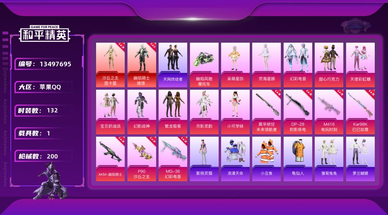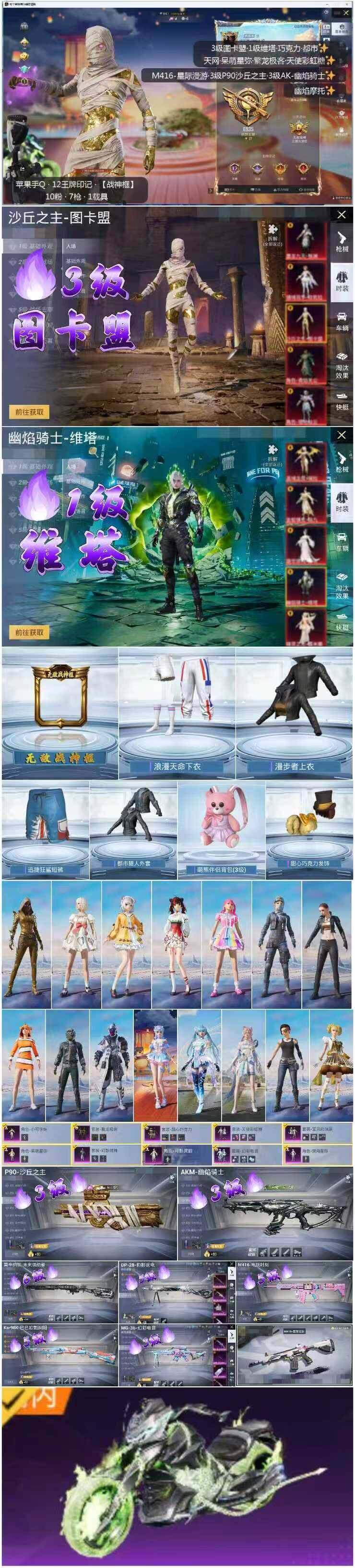 [13497695]【店主推荐捡漏号!可直接换绑】苹果 手Q-无敌战神框-2神装-10粉装-7特效枪-1载具-6粉色飞行器-63468热力值-12王牌印记-132套装-200枪皮【红色神装等级】:幽焰骑士-维塔(一级),沙丘之主-图卡盟(三级)【红色角色神装】:幽焰骑士-维塔,沙丘之主-图卡盟【热门品类】:粉装-繁龙极客,套装-浪漫天命,套装-都市猎人,套装-小丑鱼,套装-天网终结者,套装-龟仙人,M416-星际漫游【粉色载具】:幽焰风驰摩托车【粉色套装】:粉装-幻影战神,粉装-甜心巧克力,粉装-宝贝奶油派,粉装-天使彩虹糖,角色-呆萌星弥,角色-小可学妹,粉装-繁龙极客,角色-月影灵韵,粉装-幻彩电音,角色-荧海星豚【粉色枪皮等级】:AKM-幽焰骑士(三级),M416-电玩时刻(五级),P90-沙丘之主(三级),Kar98K-巳巳如意(五级),莫辛纳甘-未来领航者(六级),DP-28-豹影疾电(五级),MG-36-幻彩电音(三级)【粉色枪皮】:AKM-幽焰骑士,M416-电玩时刻,P90-沙丘之主,Kar98K-巳巳如意,莫辛纳甘-未来领航者,DP-28-豹影疾电,MG-36-幻彩电音【粉色飞行器】:酣梦熊熊飞行器,沙丘之主天马,镜域双华-灵镜之阶,龙翔九天飞行器,幽焰列车飞行器,万象金身飞行器