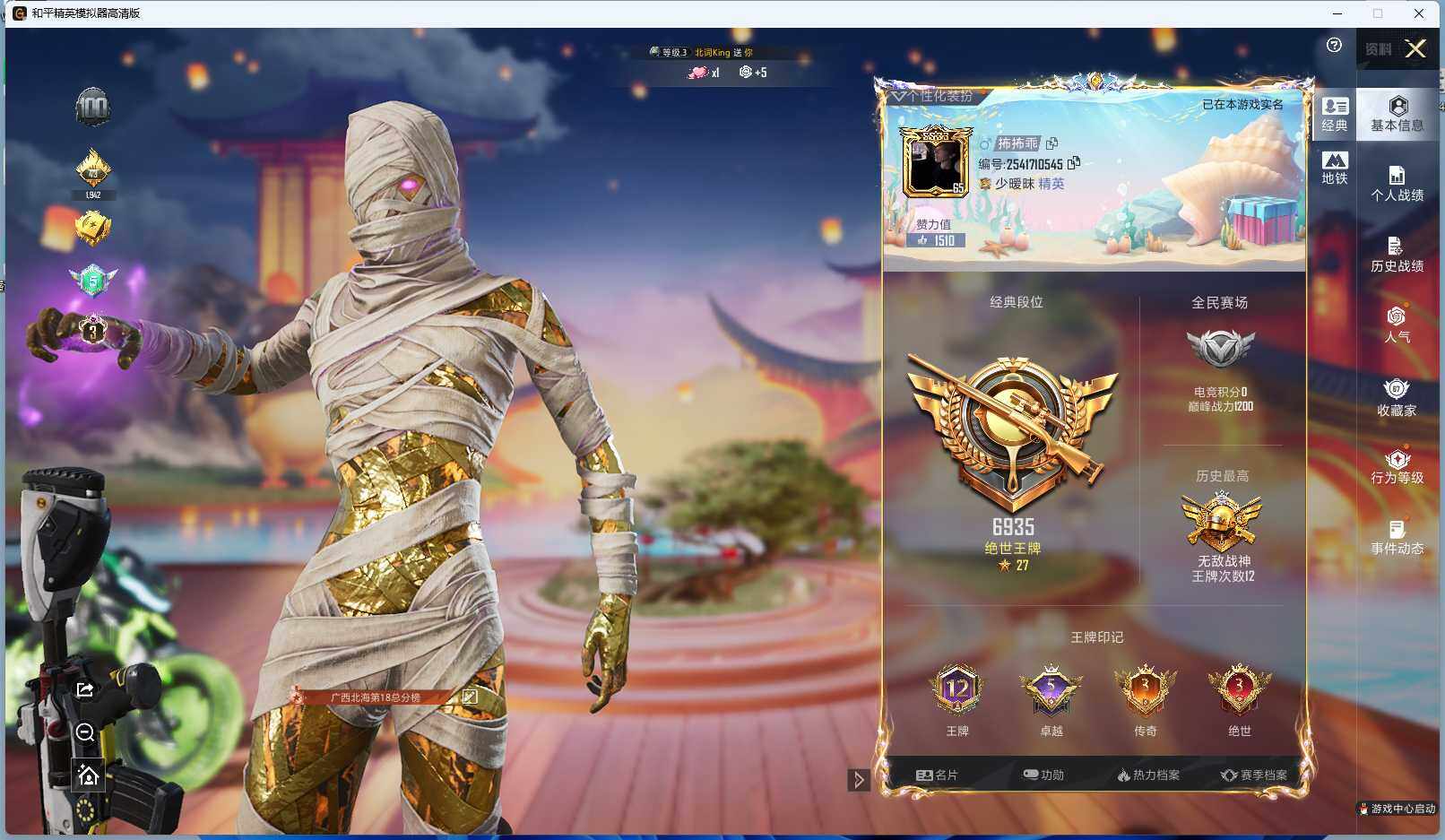 - [11606455]V8 2典藏 1无双 1珍品传说 16传说 125英雄 244皮肤 可修改实名 优质装备:九霄神辉(木兰典藏),弑枪猎影(韩信典藏),器灵·螭龙剑,酷洛米之心,炽阳神光,仲夏夜之梦(大飞蛾),飞鸢探春,乞巧织情,淬星耀世,花朝如约(花篮子),无双飞将,记忆之芯(机甲兔) 传说皮:幻光神枪 珍宝阁皮:妄想食味 限定皮:愿照·九州拓(澜年限),愿照·千秋盛(女娲年限),逐霄战戟,陌上桑,鸣野蒿,至尊宝,傲雪梅枪,绯月行,白晶晶,山海·碧波行(瑶年限),祈雪灵祝(雪兔子),李小龙,奇迹圣诞,神奇女侠,深海之息(深海大菠萝),神器·万象笔 史诗皮:鸭鸭历险记-刘禅,器灵·浮梦炉,化蝶舞,星界战将,谪仙醉月,龙之律动,百相守梦-周瑜,茶境仙,撼地雄心,破空之剑,战舞者,蒙犽顽岩魄,百相守梦-百里守约,百相守梦-黄忠,遇见神鹿,紫霞仙子,黄金分割率,特工魅影,千年之狐,江河有灵,魅语,无限星赏官,冰冠公主,晚萤,暗夜猫娘,末日机甲-吕布,猫狗日记-孙策,女仆咖啡,摇滚巨星,水果甜心,星夜王子,心灵骇客,功夫厨神,暗隐猎兽者,鬼剑武藏,心灵战警,天秀·启明,舞动绿茵,缤纷独角兽,乘风破浪,逐浪之夏,水晶猎龙者,唤灵魅影,圣诞狂欢,圣诞恋歌,鹰眼统帅,魅力维加斯,雪上飞焰,赏金猎手,无心