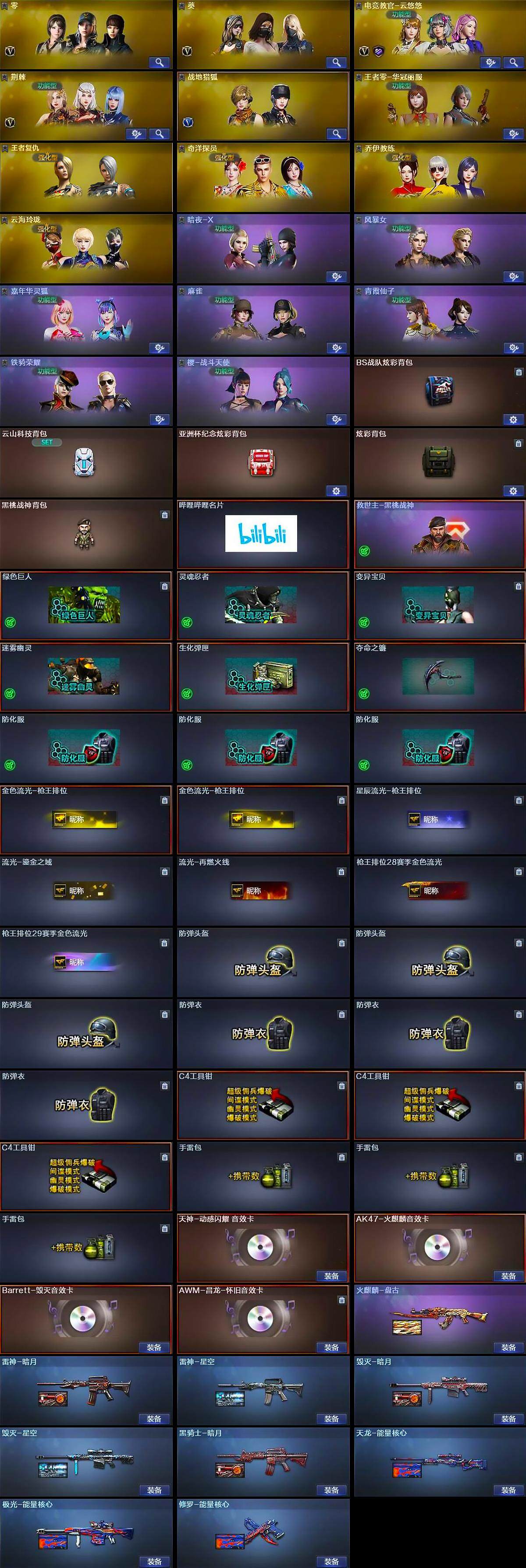 【道具】:BS战队炫彩背包,云山科技背包,亚洲杯纪念炫彩背包,炫彩背包,黑桃战神背包,哔哩哔哩名片,救世主-黑桃战神,绿色巨人,灵魂忍者,变异宝贝,迷雾幽灵,生化弹匣,夺命之镰,防化服*3,金色流光-枪王排位*2,星辰流光-枪王排位,