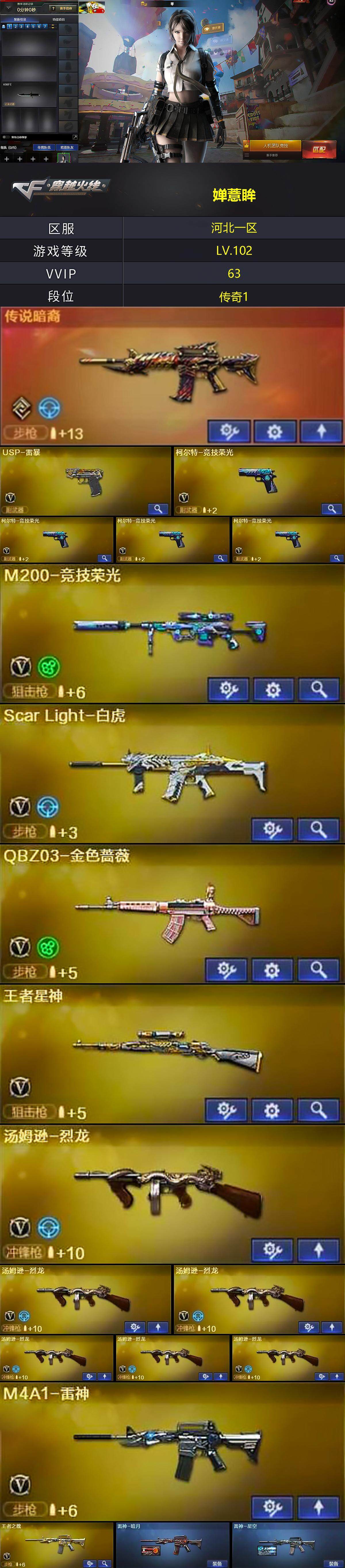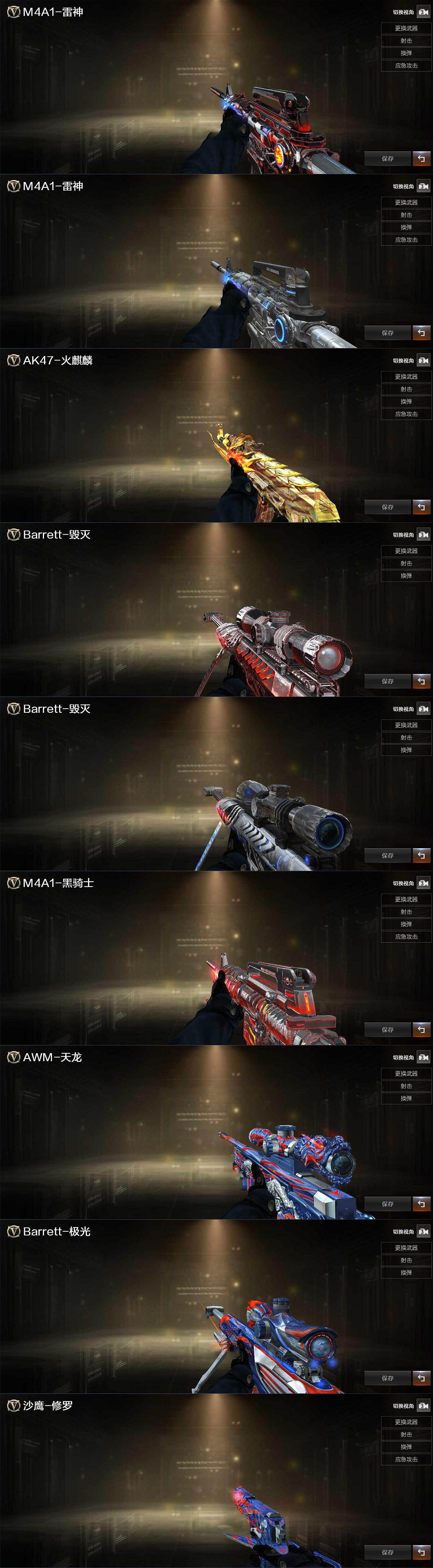 【热门武器】:传说暗裔,QBZ03-金色蔷薇,Scar Light-白虎,M200-竞技荣光,死亡之眼,青龙之魄,荣耀世冠-火麒麟,M4A1-黑骑士,汤姆逊-烈龙*6,加特林-炼狱,USP-雷暴,COP 357-雷霆王者*2,沙鹰-修罗