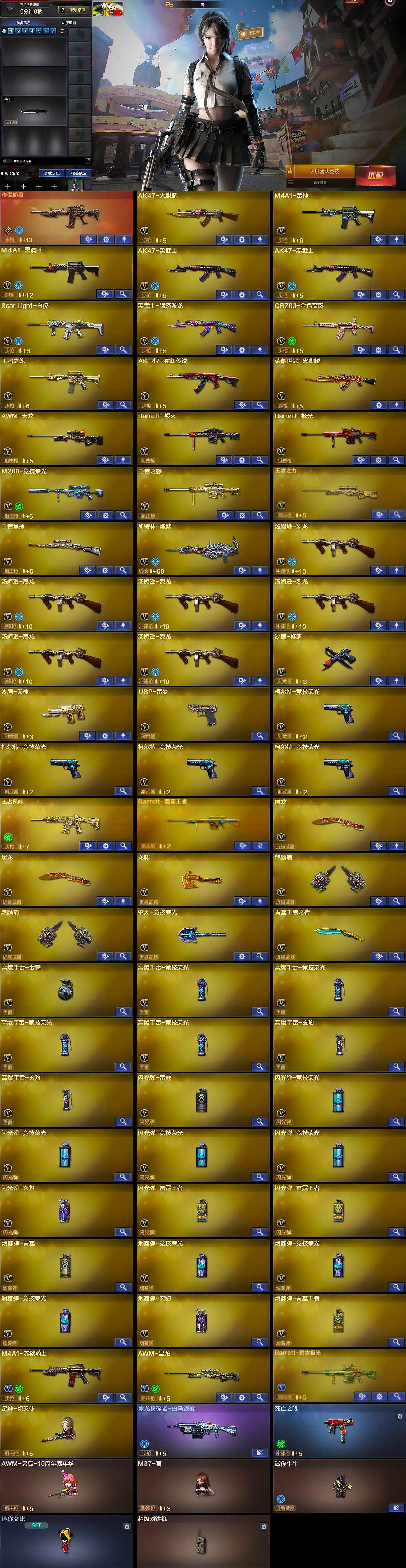 【英雄级武器】:AK47-火麒麟,M4A1-雷神,M4A1-黑骑士,AK47-黑武士*2,Scar Light-白虎,黑武士-锦绣游龙,QBZ03-金色蔷薇,王者之魄-觉醒版,AK-47-猩红传说,荣耀世冠-火麒麟,AWM-天龙,Barrett-毁灭,Barrett-极光,M200-竞技荣光,王者之怒-觉醒版,王者之力-觉醒版,王者星神-觉醒版,加特林-炼狱,汤姆逊-烈龙*6,沙鹰-修罗,沙鹰-天神,USP-雷暴,柯尔特-竞技荣光*4,屠龙*2,龙啸,麒麟刺*2,擎天-竞技荣光,雷霆王者之锋-觉醒版,高爆手雷-雷霆,高爆手雷-竞技荣光*4,高爆手雷-玄豹*2,闪光弹-雷霆,闪光弹-竞技荣光*4,闪光弹-玄豹,闪光弹-雷霆王者-觉醒版*2,烟雾弹-雷霆,烟雾弹-竞技荣光*3,烟雾弹-玄豹,烟雾弹-雷霆王者-觉醒版,M4A1-赤狱骑士,AWM-昌龙,Barrett-碧霄极光