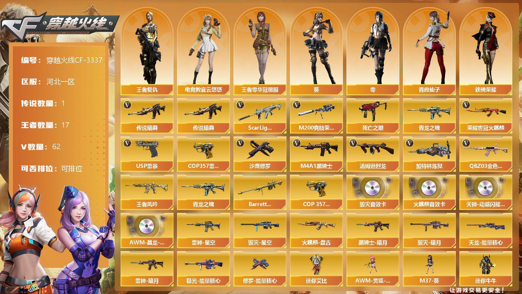 [13437199]河北一区-62V-17王者-0炫金 【传说武器】:传说暗裔 【热门武器】:传说暗裔,QBZ03-金色蔷薇,Scar Light-白虎,M200-竞技荣光,死亡之眼,青龙之魄,荣耀世冠-火麒麟,M4A1-黑骑士,汤姆逊-烈龙*6,加特林-炼狱,USP-雷暴,COP 357-雷霆王者*2,沙鹰-修罗 【王者炫金武器】:王者凤吟,青龙之魄,Barrett-雷霆王者,COP 357-雷霆王者*2 【音效卡】:天神-动感闪耀 音效卡,AK47-火麒麟音效卡,Barrett-毁灭音效卡,AWM-昌龙-怀旧音效卡 【皮肤】:雷神-暗月,雷神-星空,火麒麟-盘古,毁灭-暗月,毁灭-星空,黑骑士-暗月,天龙-能量核心,极光-能量核心,修罗-能量核心 【角色】:零,葵,电竞教官-云悠悠,荆棘,战地猎狐,王者零-华冠丽服,王者复仇,奇洋探员,乔伊教练,云海玲珑,暗夜-X,风暴女,嘉年华灵狐,麻雀,青霞仙子,铁骑荣耀,樱-战斗天使 【人偶武器】:星神-炽天使,AWM-灵狐-15周年嘉年华,M37-葵,迷你牛牛,迷你艾比 【暴走生化】:死亡之眼,超级对讲机 【挑战大师】:冰龙粉碎者-白马银枪 【英雄级武器】:AK47-火麒麟,M4A1-雷神,M4A1-黑骑士,AK47-黑武士*2,Scar Light-白虎,黑武士-锦绣游龙,QBZ03-金色蔷薇,王者之魄-觉醒版,AK-47-猩红传说,荣耀世冠-火麒麟,AWM-天龙,Barrett-毁灭,Barrett-极光,M200-竞技荣光,王者之怒-觉醒版,王者之力-觉醒版,王者星神-觉醒版,加特林-炼狱,汤姆逊-烈龙*6,沙鹰-修罗,沙鹰-天神,USP-雷暴,柯尔特-竞技荣光*4,屠龙*2,龙啸,麒麟刺*2,擎天-竞技荣光,雷霆王者之锋-觉醒版,高爆手雷-雷霆,高爆手雷-竞技荣光*4,高爆手雷-玄豹*2,闪光弹-雷霆,闪光弹-竞技荣光*4,闪光弹-玄豹,闪光弹-雷霆王者-觉醒版*2,烟雾弹-雷霆,烟雾弹-竞技荣光*3,烟雾弹-玄豹,烟雾弹-雷霆王者-觉醒版,M4A1-赤狱骑士,AWM-昌龙,Barrett-碧霄极光 【道具】:BS战队炫彩背包,云山科技背包,亚洲杯纪念炫彩背包,炫彩背包,黑桃战神背包,哔哩哔哩名片,救世主-黑桃战神,绿色巨人,灵魂忍者,变异宝贝,迷雾幽灵,生化弹匣,夺命之镰,防化服*3,金色流光-枪王排位*2,星辰流光-枪王排位,