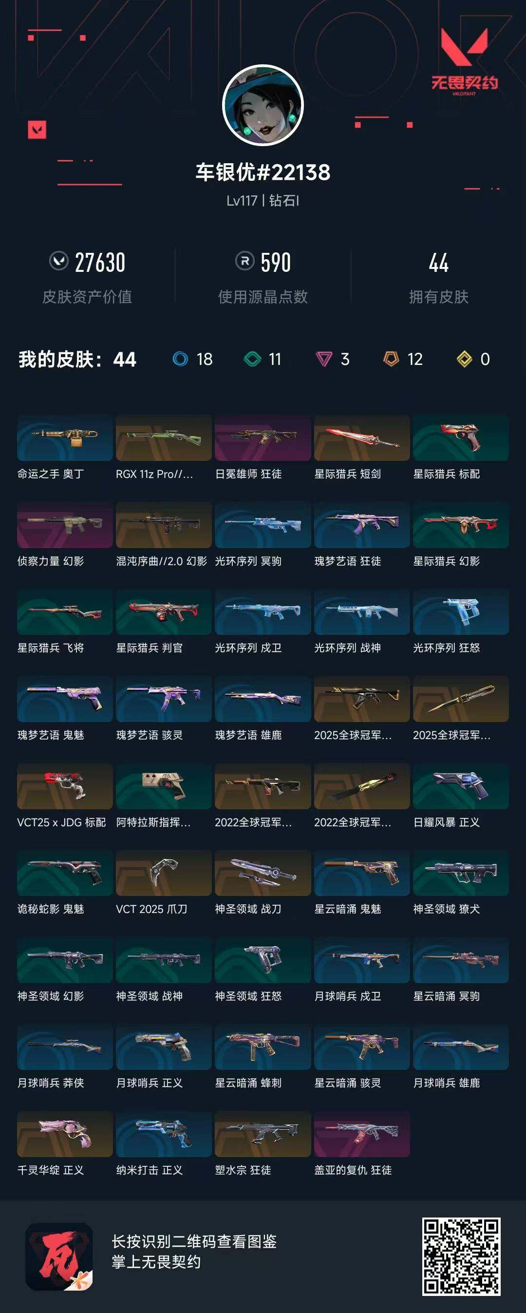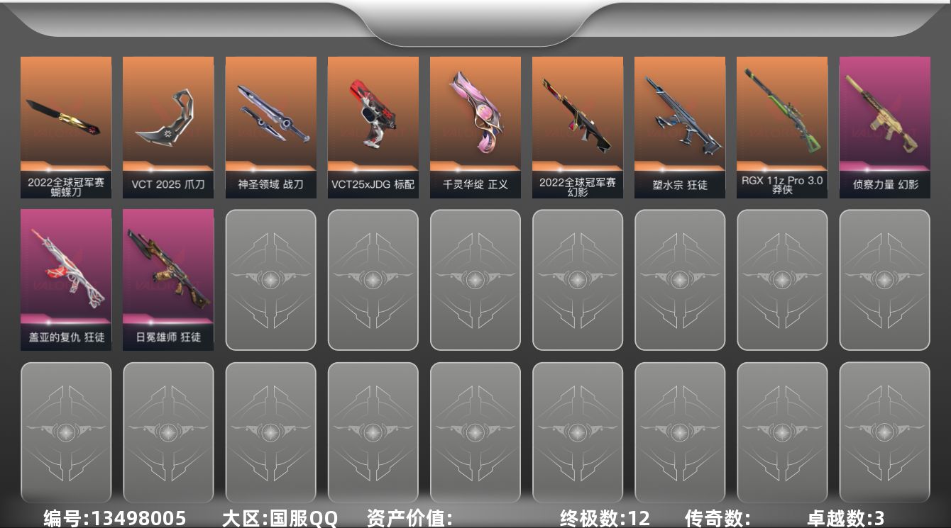 [13498005]【套装】:2025全球冠军赛套装,2022全球冠军赛套装,VCT 2025 赛季套装 【英雄】:幻棱,炼狱,维斯,暮蝶,钛狐,壹决,铁臂,捷风,幽影,不死鸟,贤者,猎枭,蝰蛇,零,芮娜,奇乐,尚勃勒,霓虹,斯凯,夜露,星礈,K/O,海神,盖可,黑梦,钢锁 【近战 武器】:近战武器-2025全球冠军赛 蝴蝶刀,近战武器-2022全球冠军赛 蝴蝶刀,近战武器-VCT 2025 爪刀,近战武器-神圣领域 战刀,近战武器-星际猎兵 短剑 【狂徒】:狂徒-2025全球冠军赛,狂徒-塑水宗,狂徒-盖亚的复仇,狂徒-日冕雄师 【幻影】:幻影-2022全球冠军赛,幻影-混沌序曲//2.0,幻影-侦察力量,幻影-神圣领域 【戍卫】:戍卫-月球哨兵 【獠犬】:獠犬-神圣领域 【冥驹】:冥驹-星云暗涌 【莽侠】:莽侠-RGX 11z Pro//3.0,莽侠-月球哨兵 【战神】:战神-神圣领域 【奥丁】:奥丁-命运之手 【雄鹿】:雄鹿-月球哨兵 【骇灵】:骇灵-星云暗涌 【蜂刺】:蜂刺-星云暗涌 【VCT手枪】:标配-VCT25 x JDG 【正义】:正义-千灵华绽,正义-纳米打击,正义-月球哨兵 【鬼魅】:鬼魅-诡秘蛇影,鬼魅-星云暗涌 【狂怒】:狂怒-神圣领域 【卡面】:终章:激斗汉堡 卡面,进入射程 卡面,《双城之战》拥抱 卡面,精灵大战 卡面,欢迎来到底城 卡面,南瓜盛典 卡面,正义的化身 卡面,失而复得 卡面,红鳞松叶 卡面,无畏契约GO!第一卷:芮娜 卡面,无畏契约GO!第一卷:零 卡面,无垠星环 卡面,代号红色 卡面,新兵报到 卡面,V契约 卡面,无畏契约 卡面 【喷漆】:嗨宝南瓜灯 喷漆,嘭! 喷漆,都算到了 喷漆,控场勿近 喷漆,买装还是存钱 喷漆,暴走萝莉 喷漆,松叶 喷漆,胜利属于无畏契约 喷漆,GLHF 喷漆,无畏契约 喷漆 【挂饰】:终章:猫猫木乃伊 挂饰,悠闲鸡块 挂饰,伞绳 挂饰,《双城之战》小蛋糕 挂饰,第九季//第三幕 纪念币 挂饰,无畏契约GO!第一卷 芮娜 挂饰,无畏契约GO!第一卷 零 挂饰,第九季//第二幕 纪念币 挂饰,薰衣草之心 挂饰,天外飞客 挂饰,无畏契约 纪念币 挂饰