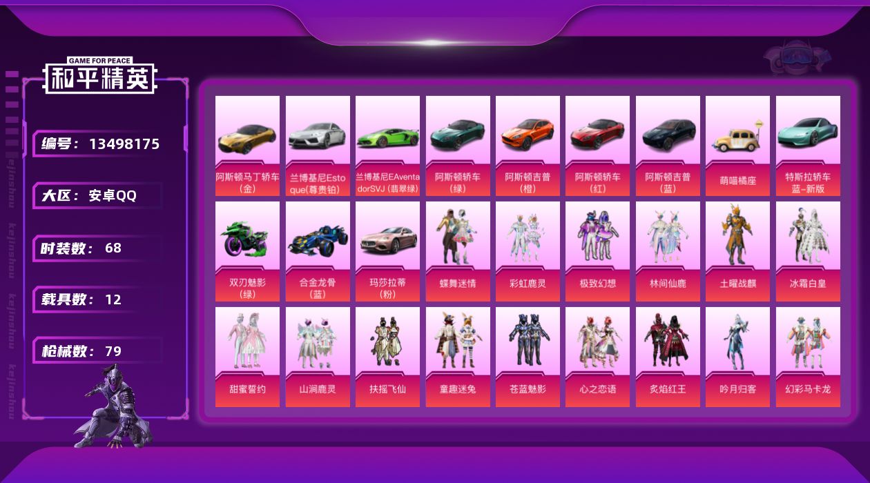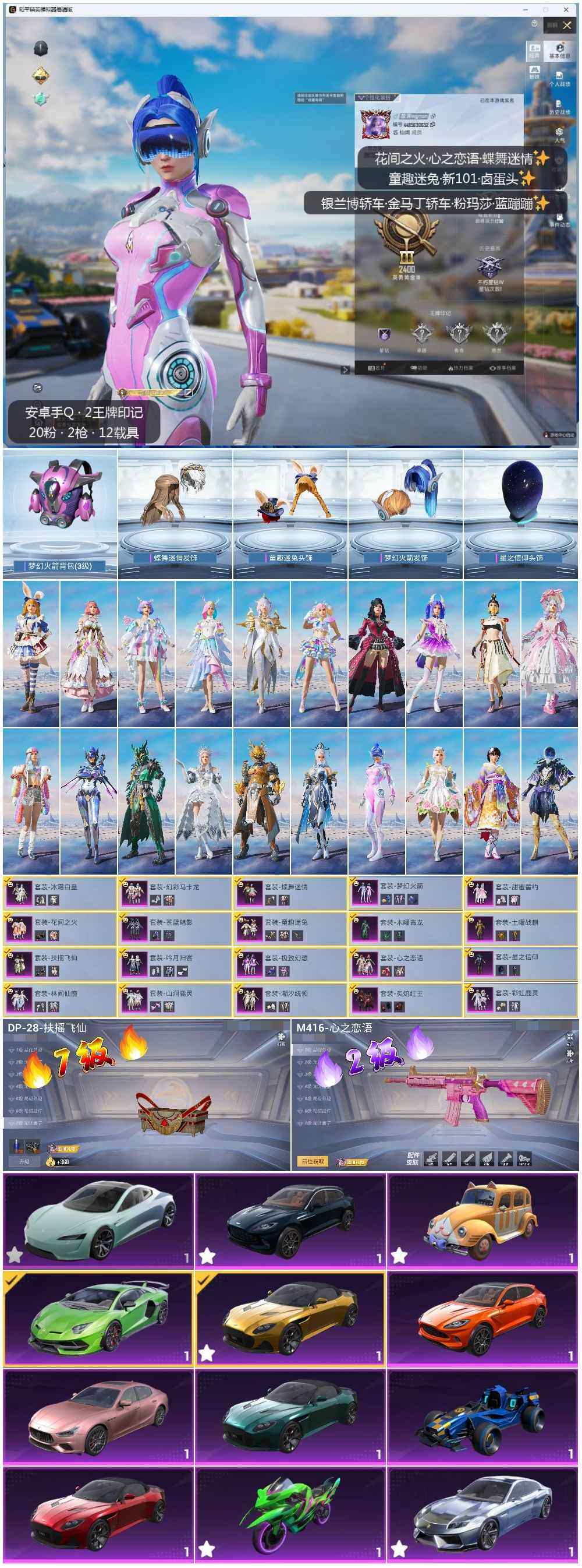 [13498175]可二次【店主推荐捡漏号!可直接换绑】安卓 手Q-20粉装-2特效枪-12载具-11粉色飞行器-57029热力值-2王牌印记-68套装-79枪皮【热门品类】:粉装-梦幻火箭,粉装-童趣迷兔【粉色载具】:特斯拉Roadster(水滴蓝),兰博基尼Aventador SVJ(翡翠绿),兰博基尼Estoque(尊享铂),阿斯顿马丁DBS(红),阿斯顿马丁DBS(绿),阿斯顿马丁DBS(金),阿斯顿马丁DBX(橙),阿斯顿马丁DBX(蓝),玛莎拉蒂Ghibli(粉),合金龙骨(蓝),萌喵橘座,双人摩托-双刃魅影(绿)【粉色套装】:粉装-土曜战麒,粉装-木曜青龙,粉装-蝶舞迷情,粉装-梦幻火箭,粉装-星之信仰,粉装-甜蜜誓约,粉装-心之恋语,粉装-极致幻想,粉装-扶摇飞仙,粉装-幻彩马卡龙,粉装-花间之火,粉装-潮汐统领,粉装-苍蓝魅影,粉装-冰霜白皇,粉装-童趣迷兔,粉装-炙焰红王,粉装-林间仙鹿,粉装-彩虹鹿灵,粉装-山涧鹿灵,粉装-吟月归客【粉色枪皮等级】:M416-心之恋语(二级),DP-28-扶摇飞仙(七级)【粉色枪皮】:M416-心之恋语,DP-28-扶摇飞仙【粉色飞行器】:春暖花开飞行器,梦幻火箭飞行器,四圣焕新飞行器,心之恋语飞行翼,扶摇飞仙飞行器,马卡龙飞行器,潮汐统领飞行器,激战未来飞行器,童趣迷兔飞行器