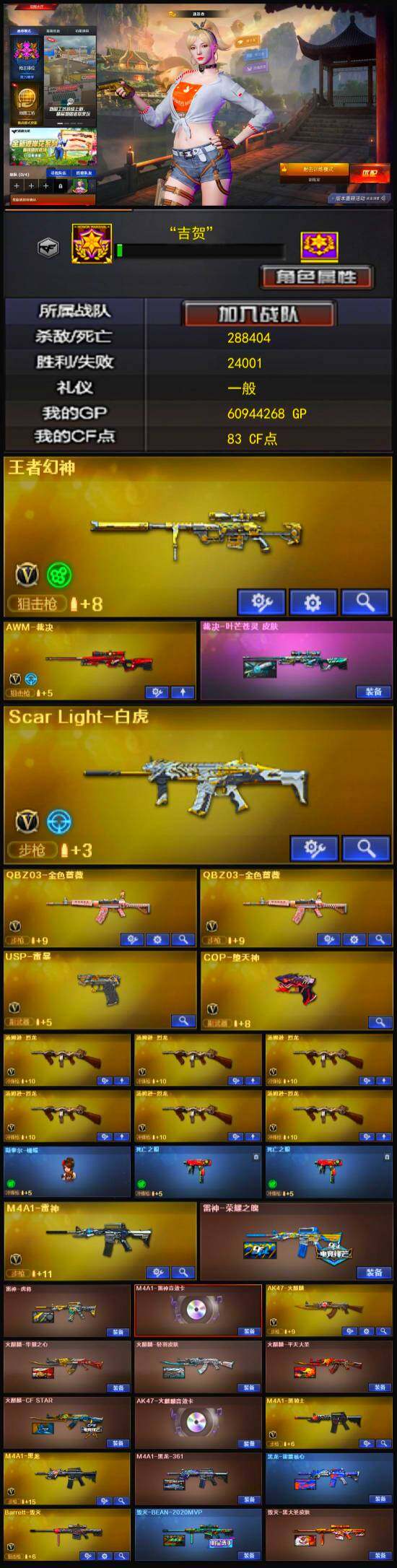 - [13854573]湖北一区-89V-14王者-1炫金 【热门武器】:QBZ03-金色蔷薇,Scar Light-白虎,HK417-朱雀,M200-幻神,死亡之眼,王者炎心,Kar98K-星神,M4A1-黑骑士,汤姆逊-烈龙*6,RPK-盘龙*7,加特林-炼狱,COP-白鲨,沙鹰-修罗*2 【王者炫金武器】:王者炎心,王者之戮,炼狱-悦蓝,炫金雷神,王者之魄高爆手雷*2,王者之魄闪光弹 【音效卡】:M4A1-雷神音效卡,M4A1-黑骑士音效卡,Barrett-毁灭音效卡 【皮肤】:雷神-暗月,雷神-虎将,火麒麟-雷神,火麒麟-平天大圣,毁灭-荣耀之怒,毁灭-星空,毁灭-黑大圣皮肤,毁灭-英雄计划 皮肤,黑龙-暗月,黑骑士-暗月,黑骑士-冠军之势,黑骑士-地狱火,无影-能量核心,无影耀金皮肤,战神-粉色甜心皮肤*2,战神-紫绶金章皮肤*2,AWM-天龙-传奇70KG,AWM-天龙-传奇白鲨,修罗-星空 【角色】:炫,王者-葵-貂蝉,王者-零,暗夜-X,风暴女,嘉年华灵狐,灵狐者-黄金海岸,龙儿,麻雀,曼陀罗-X,潘多拉-X,潜龙队-X,青霞仙子,蜀雪,铁骑荣耀,雪莉杨,影武者-X,游珑儿,雅典娜 【人偶武器】:COP-白鲨,AWM-灵狐-15周年嘉年华,迷你深渊冰龙,迷你牛魔王,闪光弹-小乔 【暴走生化】:死亡之眼,超级对讲机 【英雄级武器】:AK47-火麒麟*2,M4A1-黑龙*2,M4A1-雷神,M4A1-黑骑士,AK47-无影,M4A1-死神,AN94-超新星,HK417-朱雀,Scar Light-白虎,无影-神兵利器,黑武士-锦绣游龙,M4A1-玫瑰精灵*3,QBZ03-金色蔷薇,王者之翼-觉醒版,王者之武-觉醒版,AK-47-猩红传说*3,AK47-B-战神,黑骑士-海王,AWM-天龙*2,Barrett-毁灭*2,AWM-裁决,M200-幻神,Kar98K-星神,王者之怒-觉醒版,王者幻神-觉醒版,RPK-盘龙*7,加特林-炼狱,汤姆逊-烈龙*6,沙鹰-修罗*2,沙鹰-天神*2,雷霆之契*2,破空枪刃-夜魔,屠龙*2,龙啸,马来剑-夜魔,擎天,麒麟刺*2,斩神刀-雷暴,王者之啸-觉醒版,高爆手雷-雷霆*4,高爆手雷-雷暴,高爆手雷-夜魔*4,闪光弹-雷霆*4,闪光弹-雷暴,闪光弹-夜魔*4,烟雾弹-雷霆*4,烟雾弹-雷暴,烟雾弹-夜魔*4,M4A1-赤狱骑士 【道具】:B