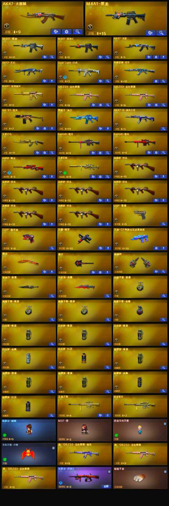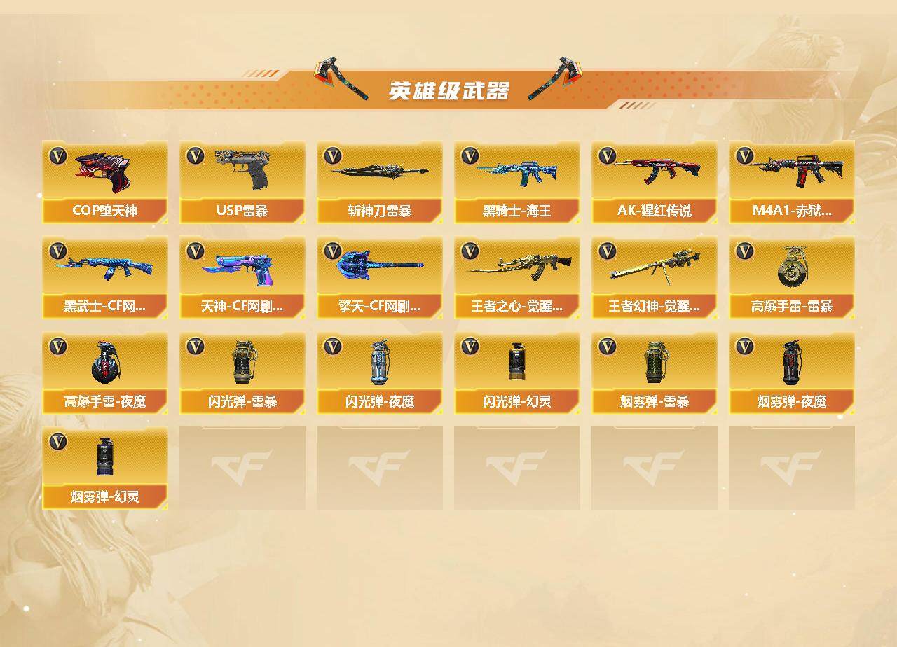 【英雄级武器】:AK47-火麒麟,M4A1-黑龙,M4A1-雷神,M4A1-黑骑士,AK47-无影,AK12-天启,Scar Light-白虎,M4A1-玫瑰精灵,QBZ03-金色蔷薇*2,王者之心-觉醒版,AK-47-猩红传说*2,黑骑士-海王,黑武士-CF网剧冠军,Barrett-毁灭,Barrett-极光,AWM-裁决,王者幻神-觉醒版,汤姆逊-烈龙*6,沙鹰-修罗,USP-雷暴,COP-堕天神,天神-CF网剧冠军,屠龙,马来剑-夜魔,擎天,麒麟刺,斩神刀-雷暴,擎天-CF网剧冠军,高爆手雷-雷暴*3,高爆手雷-夜魔,闪光弹-雷暴*3,闪光弹-夜魔,闪光弹-幻灵,烟雾弹-雷暴*3,烟雾弹-夜魔,烟雾弹-幻灵,M4A1-赤狱骑士