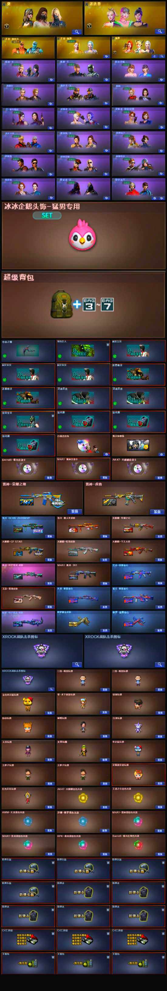 【道具】:亚洲杯纪念炫彩背包,冰冰企鹅背包-猛男专用,战舰背包,炫彩背包-诺拉,炫彩背包,超级背包,女皇终结者-魔龙之吻,救世主-黑桃战神,黄金生化钩,绿色巨人,灵魂忍者*2,变异宝贝,迷雾幽灵*2,夺命之镰,防化服*3,流光-再燃火线,枪王排位29赛季金色流光,斯沃特表情,防弹