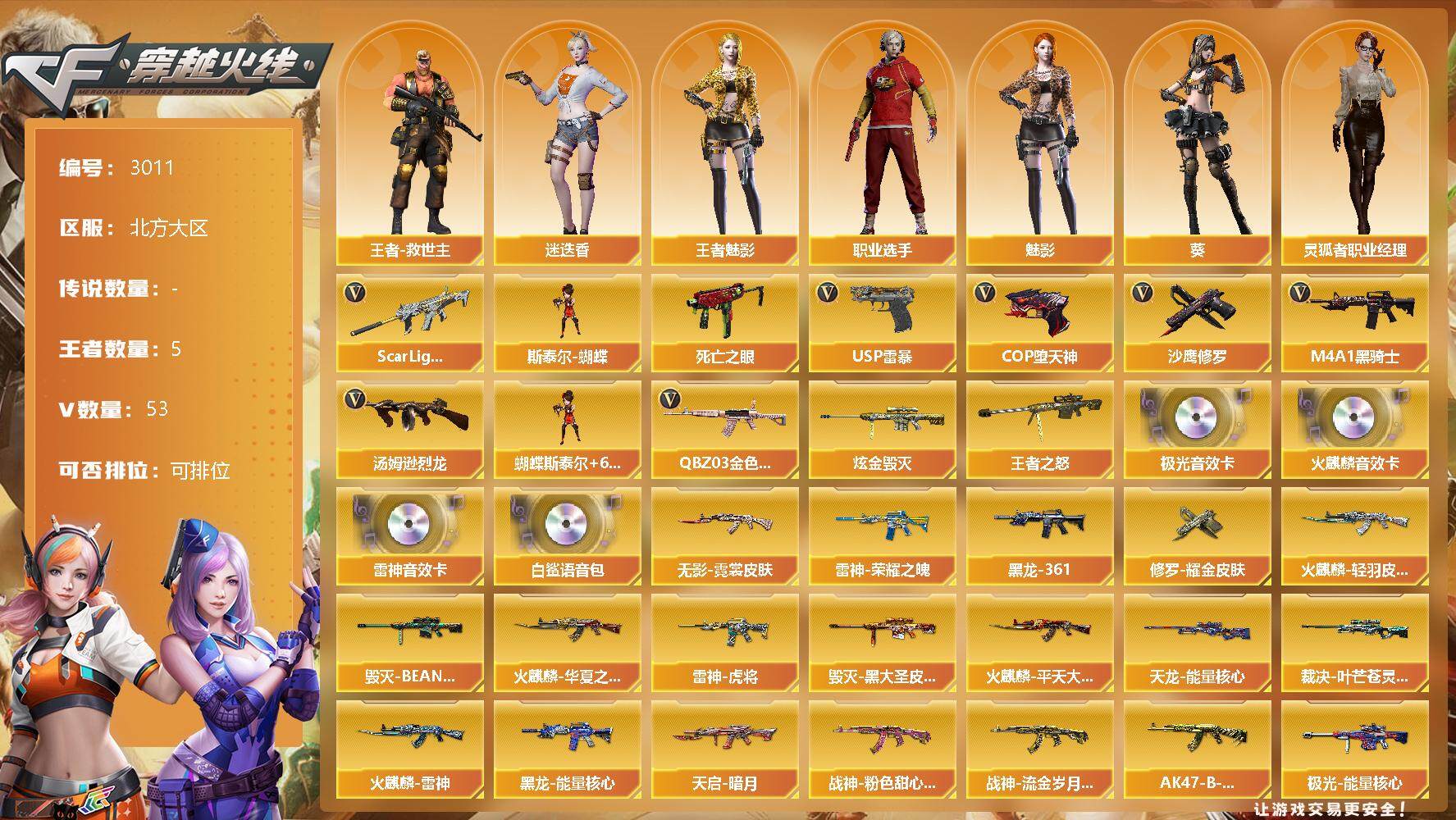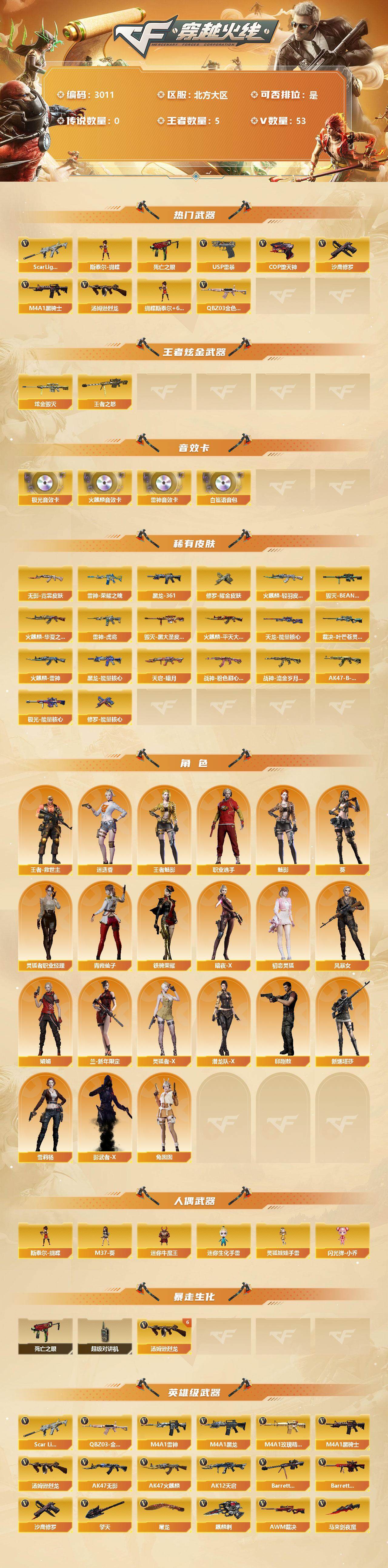 [13461899]北方大区-53V-5王者-1炫金 【热门武器】:QBZ03-金色蔷薇*2,Scar Light-白虎,死亡之眼*2,M4A1-黑骑士,汤姆逊-烈龙*6,斯泰尔-蝴蝶,USP-雷暴,COP-堕天神,沙鹰-修罗 【王者炫金武器】:王者之怒,炫金毁灭 【音效卡】:AK47-火麒麟音效卡,M4A1-雷神音效卡,Barrett-极光音效卡,白鲨语音包 【皮肤】:裁决-叶芒苍灵 皮肤,雷神-荣耀之魄,雷神-虎将,火麒麟-雷神,火麒麟-华夏之心,火麒麟-轻羽皮肤,火麒麟-平天大圣,毁灭-BEAN-2020MVP,毁灭-黑大圣皮肤,黑龙-能量核心,M4A1-黑龙-361,无影-霓裳皮肤,天启-暗月,战神-粉色甜心皮肤,战神-流金岁月皮肤,AK47-B-常胜将军-孙权,天龙-能量核心,极光-能量核心,修罗-能量核心,修罗耀金皮肤 【角色】:葵,魅影,迷迭香,王者-魅影,王者-救世主,暗夜-X,初恋灵狐,风暴女,娟娟,兰-新年限定,灵狐者-X,灵狐者-职业经理,潜龙队-X,邱刚敖,青霞仙子,铁骑荣耀,兔囡囡,新娜塔莎,雪莉杨,影武者-X,职业选手 【人偶武器】:斯泰尔-蝴蝶,M37-葵,迷你牛魔王,迷你生化手雷,闪光弹-小乔,灵狐娃娃手雷 【暴走生化】:死亡之眼*2,超级对讲机 【英雄级武器】:AK47-火麒麟,M4A1-黑龙,M4A1-雷神,M4A1-黑骑士,AK47-无影,AK12-天启,Scar Light-白虎,M4A1-玫瑰精灵,QBZ03-金色蔷薇*2,王者之心-觉醒版,AK-47-猩红传说*2,黑骑士-海王,黑武士-CF网剧冠军,Barrett-毁灭,Barrett-极光,AWM-裁决,王者幻神-觉醒版,汤姆逊-烈龙*6,沙鹰-修罗,USP-雷暴,COP-堕天神,天神-CF网剧冠军,屠龙,马来剑-夜魔,擎天,麒麟刺,斩神刀-雷暴,擎天-CF网剧冠军,高爆手雷-雷暴*3,高爆手雷-夜魔,闪光弹-雷暴*3,闪光弹-夜魔,闪光弹-幻灵,烟雾弹-雷暴*3,烟雾弹-夜魔,烟雾弹-幻灵,M4A1-赤狱骑士 【道具】:亚洲杯纪念炫彩背包,冰冰企鹅背包-猛男专用,战舰背包,炫彩背包-诺拉,炫彩背包,超级背包,女皇终结者-魔龙之吻,救世主-黑桃战神,黄金生化钩,绿色巨人,灵魂忍者*2,变异宝贝,迷雾幽灵*2,夺命之镰,防化服*3,流光-再燃火线,枪王排位29赛季金色流光,斯沃特表情,防弹