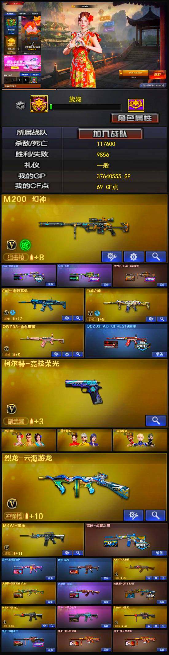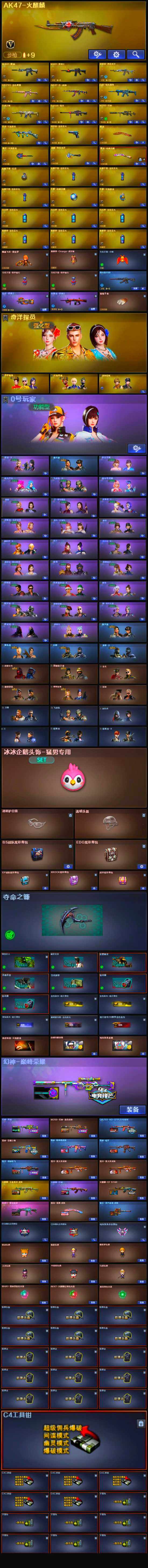 【皮肤】:M200-幻神-黄忠皮肤,幻神-青鹤,幻神-巅峰荣耀,QBZ03-AG-CFPLS19冠军,雷神-暗月,雷神-荣耀之魄,雷神-维纳斯皮肤,火麒麟-百城,火麒麟-玉面羞花 皮肤,毁灭-战神张飞,毁灭-黑大圣皮肤*2,M4A1-千变-孔明皮肤,战神-流金岁月皮肤,AK47-B-常胜将军-刘备,AK47-B-常胜将军-孙权,屠龙-春桃 皮肤,擎天-蒸汽钟表 皮肤