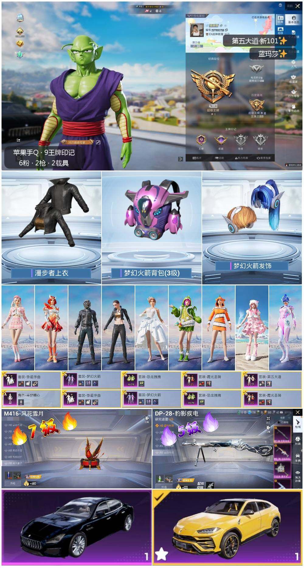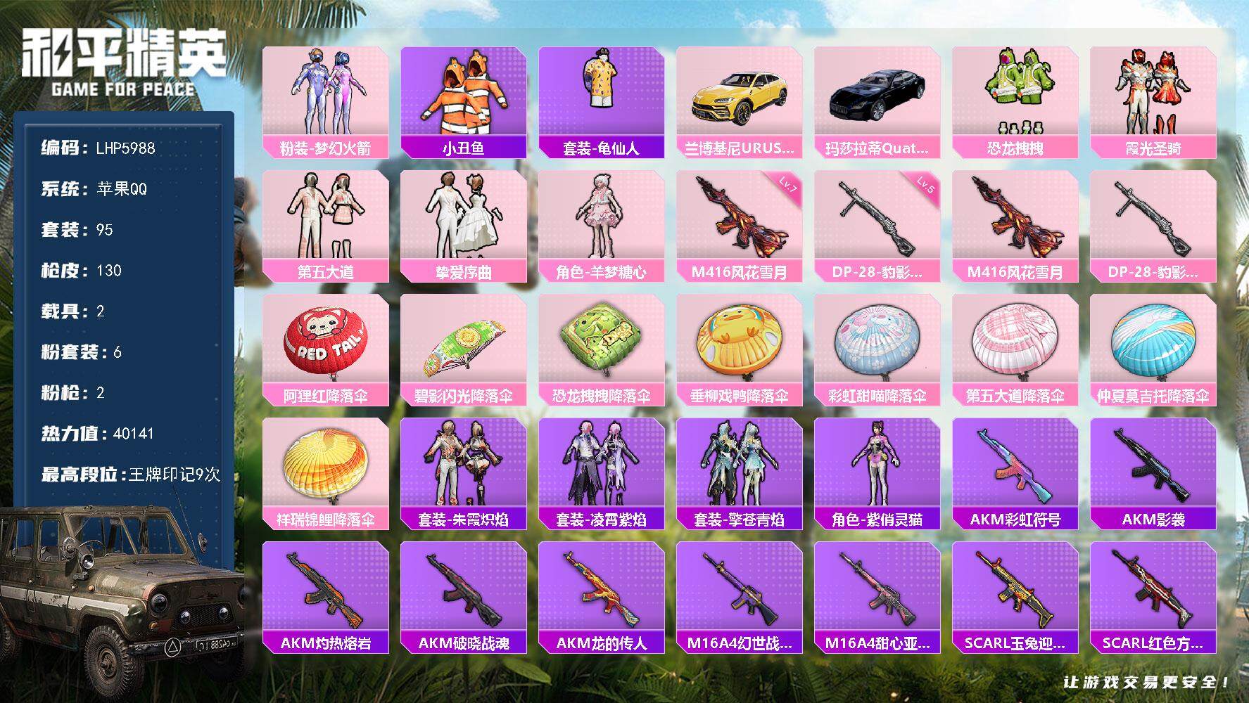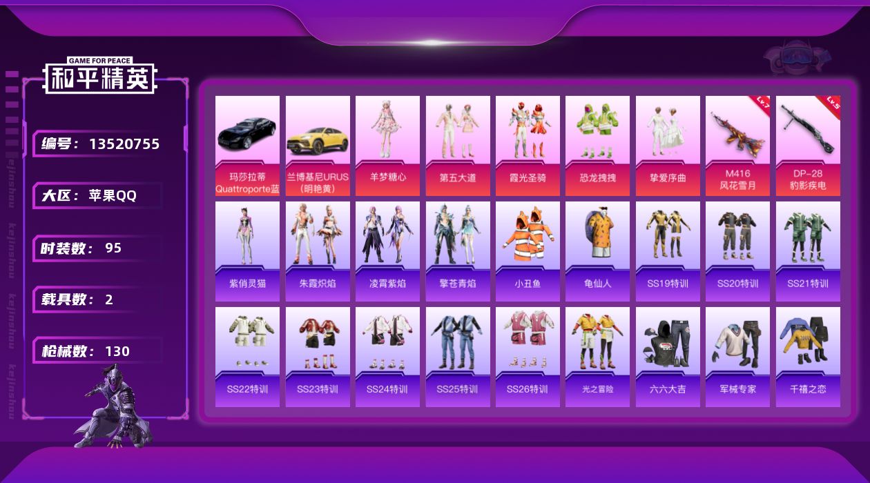 [13520755]苹果 手Q-6粉装-2特效枪-2载具-4w热力值-9王牌印记-95套装-130枪皮【热门品类】:粉装-梦幻火箭,套装-小丑鱼,套装-龟仙人【粉色载具】:兰博基尼URUS(明艳黄),玛莎拉蒂Quattroporte(夜幕蓝)【粉色套装】:粉装-梦幻火箭,粉装-恐龙拽拽,粉装-霞光圣骑,粉装-第五大道,粉装-挚爱序曲,角色-羊梦糖心【粉色枪皮等级】:M416-风花雪月(七级),DP-28-豹影疾电(五级)