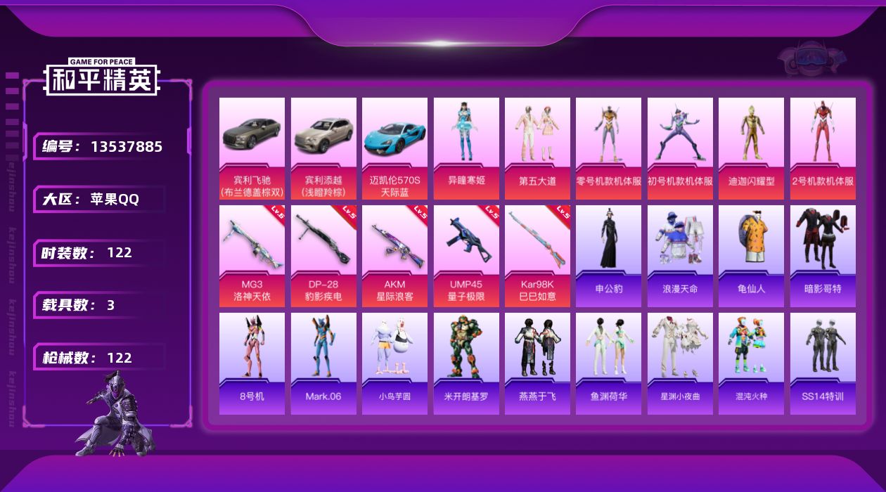 [13537885]素材身法号【特价急出/详情看图】:苹果 手Q-6粉装-5特效枪-3载具-4.3w热力值-2王牌印记-122套装-122枪皮【热门品类】:套装-浪漫天命,套装-都市猎人,套装-龟仙人,套装-暗影哥特,角色-8号机,角色-Mark.06【粉色载具】:宾利飞驰(布罗德盖棕双色),宾利添越(浅瞪羚棕),迈凯伦570S(天际蓝)【粉色套装】:角色-闪耀迪迦,角色-零号机款机体服,角色-初号机款机体服,角色-2号机款机体服,粉装-第五大道,角色-异瞳寒姬【粉色枪皮等级】:AKM-星际浪客(五级),UMP45-量子极限(五级),Kar98K-巳巳如意(五级),DP-28-豹影疾电(五级),MG3-洛神天依(六级)