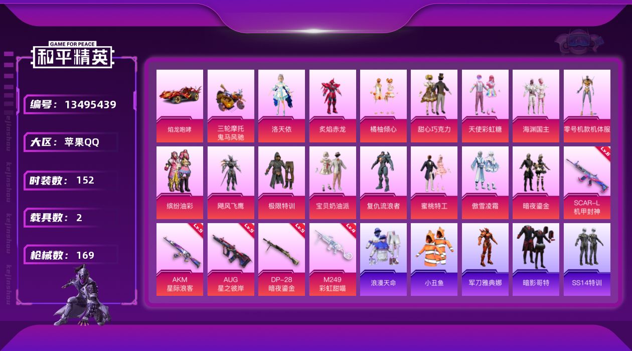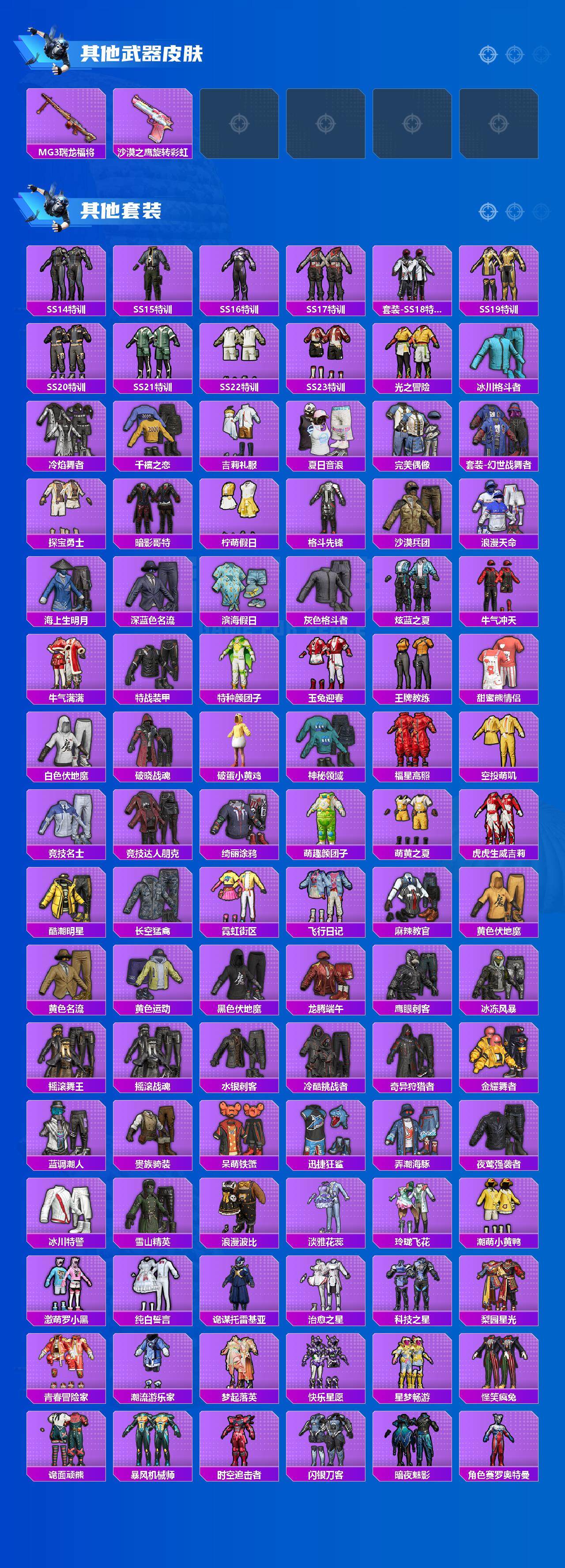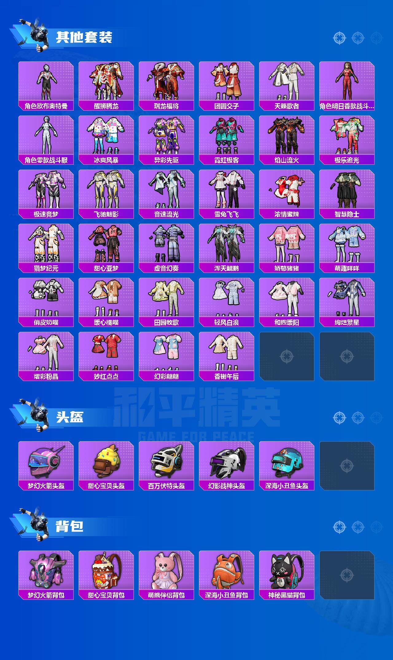 - [11686541]11粉装 5特效枪 2载具 10印记 可二次 可修改实名 女号 优质装备:宾利BATUR(极速紫),宾利欧陆GT敞篷(火焰橘),宝贝奶油派,天使彩虹糖,M416全功率超战,M416风花雪月,SCAR-L纯梦嫁纱,AKM绿萝繁花 热门装扮:飓风飞鹰,彩虹鹿灵,山涧鹿灵,沙场疾风,恐龙拽拽,寒光使者,音爆索尼克,超级赛亚人孙悟空,超级赛亚人贝吉塔,闲梦青缨,东方飞龙,暗夜魅影 稀有枪皮:DP-28-豹影疾电 五级特效枪:五级DP-28-豹影疾电,五级M416-全功率超战,五级SCAR-L-纯梦嫁纱,五级AKM-绿萝繁花 三级特效枪:三级M416-风花雪月 紫色装扮:田园牧歌,轻风白浪,和煦暖阳,SS22特训,莱茵河畔,孙悟空,SS23特训,幻彩翩翩,妙红点点,娇憨猪猪,酸甜橘柚,夏雨游龙,萌趣咩咩,SS21特训,绚烂繁星,熠彩粉晶,冷焰舞者,北国孤狼,午夜朋克,SS33特训套装,青涩时光,SS20特训,SS15特训,时空追击者,暴风机械师,SS16特训,爆裂葡萄,萌趣颜团子,特种颜团子,猎梦纪元,飞驰魅影,音速流光,极速竞梦,SS19特训,覆海蛟龙,甜心亚梦,虚音幻奏,电音精灵,瑞龙福将,团圆交子,醒狮腾龙,SS17特训,极乐追光,异彩先驱,SS18特训,都市漫游者,都市魅力,野性山猫,野性战心,野性战魂,长空猛禽,雷霆特警,霓虹极客,霓虹街区,青春校园,迎春赐吉,缤纷果语,耀眼新星,花园小羊咩,蓝色守护者,虎虎生威吉莉,血色贵族,西部风情,风行保卫者,飞行日记,龙腾端午,骑行爱好者,魅力单车,鹤鸣,麻辣教官,黑色伏地魔,龙的传人,龟仙人,柠萌假日,格斗先锋,棕色飞行服,水手小飞鸭,沙漠探路者,活力之魂,涂山之恋,滨海假日,夏日音浪,夜莺强袭者,幻世战舞者,怒火燎原,探宝勇士,湖蓝色名流,滨海厨神,白熊同盟,破蛋小黄鸡,神秘领域,福星高照,空岛之星,空投萌叽,突袭者,甜蜜熊情侣,王牌教练,牛气冲天,灼焰舞者,炫蓝之夏,燃烧卡路里,牛气满满,猛禽,特战装甲,短笛,玉兔迎春,竞技名士,惊鸿侠骨,贝吉塔,究极悟饭,神气柴柴,懵萌河马,SS24特训(SS24特训套装),SS25特训,锦衣飞扬,粉红小猪,菲菲,SS27特训,星河浪客,华灯初上,日照花林,沙丘之歌,SS26特训,春光漫游,快闪甜心,薄荷蓝莓,耀粉歌者,绯格组合,萌黄之夏,水银刺客,光之冒险,海上生明月