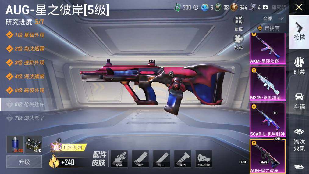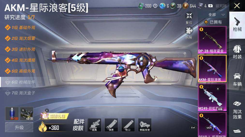 AKM-星际浪客,SCAR-L-机甲封神,AUG-星之彼岸,M249-彩虹甜喵,DP-28-暗夜鎏金