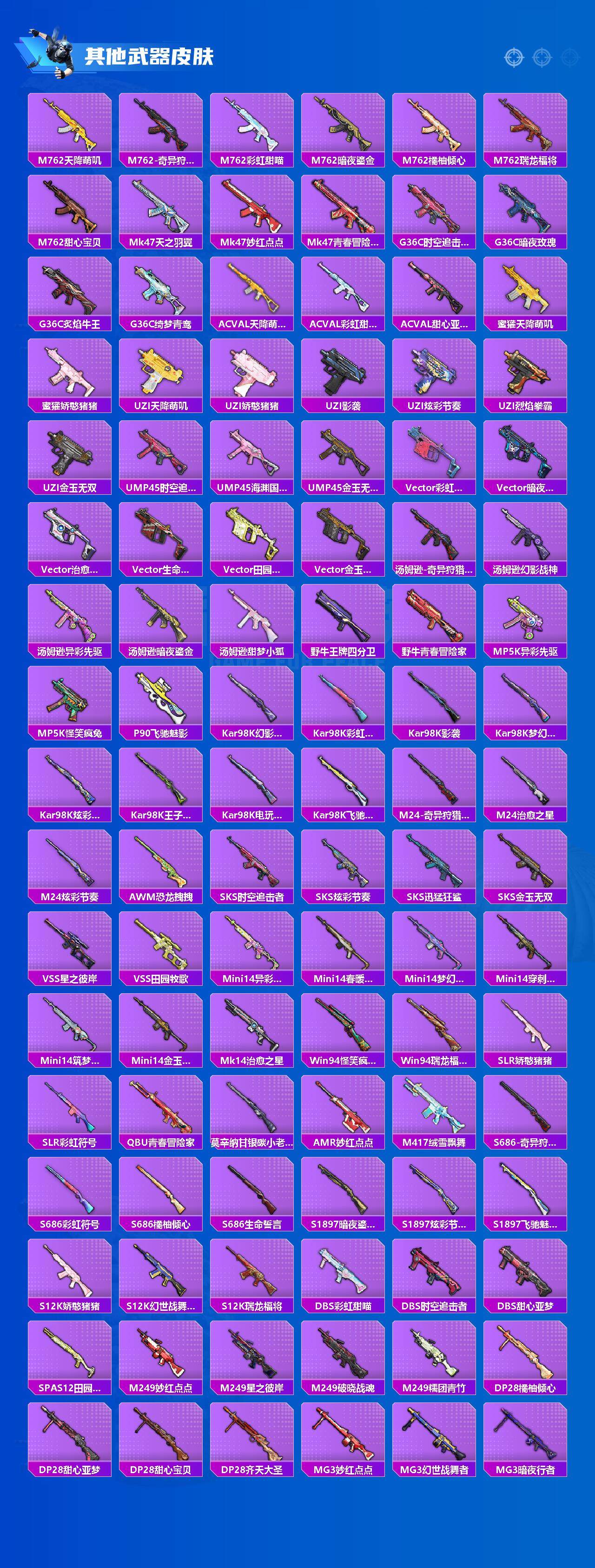【稀有枪皮】:AKM-夜灯,AKM-奇异狩猎者,AKM-彩虹符号,AKM-星之彼岸,AKM-破晓战魂,AKM-萌趣颜团子,AKM-虎虎生威,M16A4-幻世战舞者,M16A4-甜心亚梦,M16A4-红色方程式,M16A4-蓝色火焰,SCAR-L-玉兔迎春,SCAR-L-红色方程式,M416-仓鼠灰灰,M416-暗夜行者,M416-暗星紫秘,M416-糯团青竹,M416-蓝色火焰,GROZA-异彩先驱,GROZA-彩虹符号,GROZA-影袭,GROZA-治愈之星,GROZA-田园牧歌,AUG-怪笑疯兔,AUG-甜蜜菠萝,AUG-青春冒险家,QBZ-彩虹符号,QBZ-洛神天依,QBZ-神秘黑猫,QBZ-飞驰魅影,M762-天降萌叽,M762