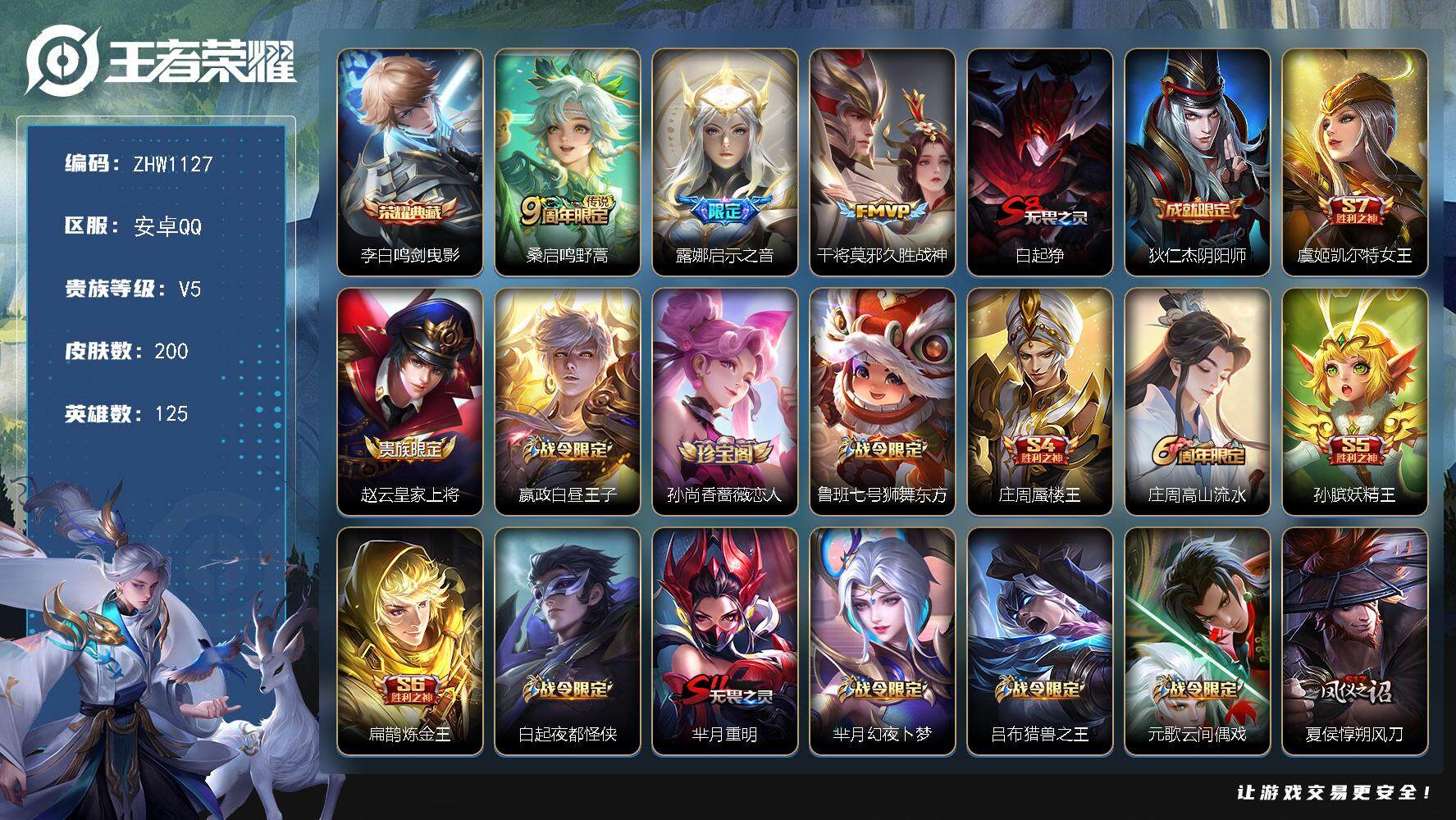 [13565295]可二次【店主推荐捡漏号!可直接换绑 】安卓Q-V5-尊贵铂金IV段位-125英雄-200皮肤-1典藏-3传说-52史诗 【荣耀典藏】:李白鸣剑曳影 【传说皮肤】:桑启鸣野蒿,露娜启示之音,干将莫邪久胜战神 【限定皮肤】:白起狰,狄仁杰阴阳师,虞姬凯尔特女王,赵云皇家上将,嬴政白昼王子,孙尚香蔷薇恋人,鲁班七号狮舞东方,庄周蜃楼王,庄周高山流水,孙膑妖精王,扁鹊炼金王,白起夜都怪侠,芈月重明,芈月幻夜卜梦,吕布猎兽之王,元歌云间偶戏,夏侯惇朔风刀,曹操烛龙,典韦穷奇,典韦蓝屏警告,狄仁杰魔术师,狄仁杰万华元夜,达摩沙漠行僧,项羽海滩派对,老夫子醍醐杖,程咬金演武夺筹,露娜启示之音,韩信傲雪梅枪,兰陵王金庭之子,亚瑟潮玩骑士王,孙悟空大圣娶亲,牛魔御旌,后羿圣弓游侠,李元芳云中旅人,钟馗神迹守卫,钟馗驱傩正仪,杨玉环遇见飞天,女娲朔望之晖,干将莫邪真爱魔法,雅典娜黎明之约,太乙真人饕餮,鬼谷子原初探秘者,鬼谷子五谷丰年,黄忠火炮绅士,苏烈千军破阵,百里玄策原初追逐者,弈星混沌棋,梦奇顽趣,沈梦溪大漠名商,明世隐疑决卦,明世隐吟游魔法,裴擒虎李小龙,裴擒虎擒涛扼浪,狂铁御狮,米莱狄御霄,云中君纤云弄巧,云中君时之祈愿,盾山御銮,上官婉儿梁祝,鲁班大师探海日志,桑启海盐诗旅,张良古海寻踪,鬼谷子天穹祈灯,姬小满妄想食味 【赛季限定】:庄周蜃楼王,孙膑妖精王,扁鹊炼金王,白起狰,芈月重明,夏侯惇朔风刀,曹操烛龙,典韦穷奇,狄仁杰万华元夜,达摩沙漠行僧,老夫子醍醐杖,程咬金演武夺筹,兰陵王金庭之子,张良古海寻踪,牛魔御旌,李元芳云中旅人,虞姬凯尔特女王,钟馗驱傩正仪,雅典娜黎明之约,太乙真人饕餮,鬼谷子原初探秘者,苏烈千军破阵,百里玄策原初追逐者,弈星混沌棋,梦奇顽趣,沈梦溪大漠名商,明世隐疑决卦,裴擒虎擒涛扼浪,狂铁御狮,米莱狄御霄,盾山御銮,鲁班大师探海日志,桑启海盐诗旅,鬼谷子天穹祈灯 【战令限定】:嬴政白昼王子,鲁班七号狮舞东方,白起夜都怪侠,芈月幻夜卜梦,吕布猎兽之王,元歌云间偶戏,典韦蓝屏警告,亚瑟潮玩骑士王,后羿圣弓游侠,钟馗神迹守卫,女娲朔望之晖,干将莫邪真爱魔法,黄忠火炮绅士,明世隐吟游魔法 【史诗皮肤】:鲁班七号电玩小子,赵云皇家上将,赵云未来纪元,貂蝉圣诞恋歌,狄仁杰魔术师,宫本武藏鬼剑武藏,孙尚香蔷薇恋人,孙尚香水果甜心,妲己魅力维加斯,妲己女仆咖啡