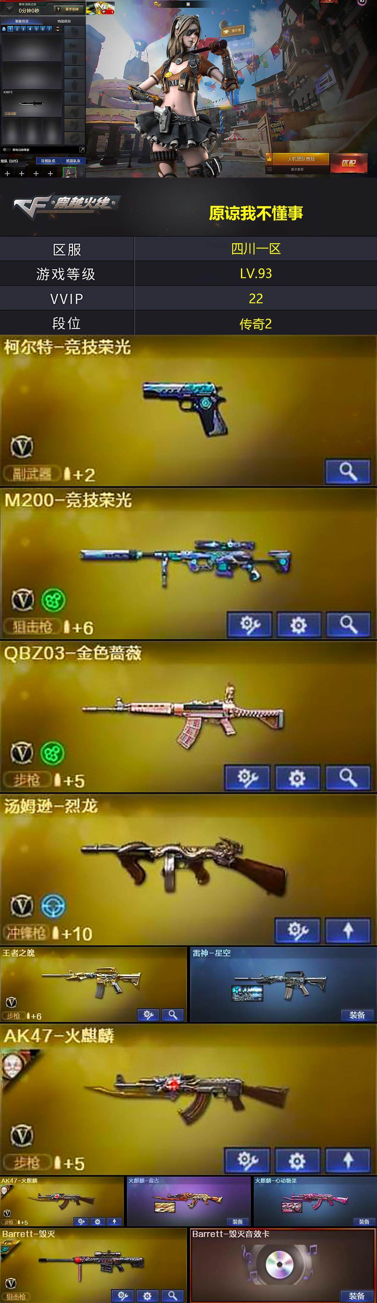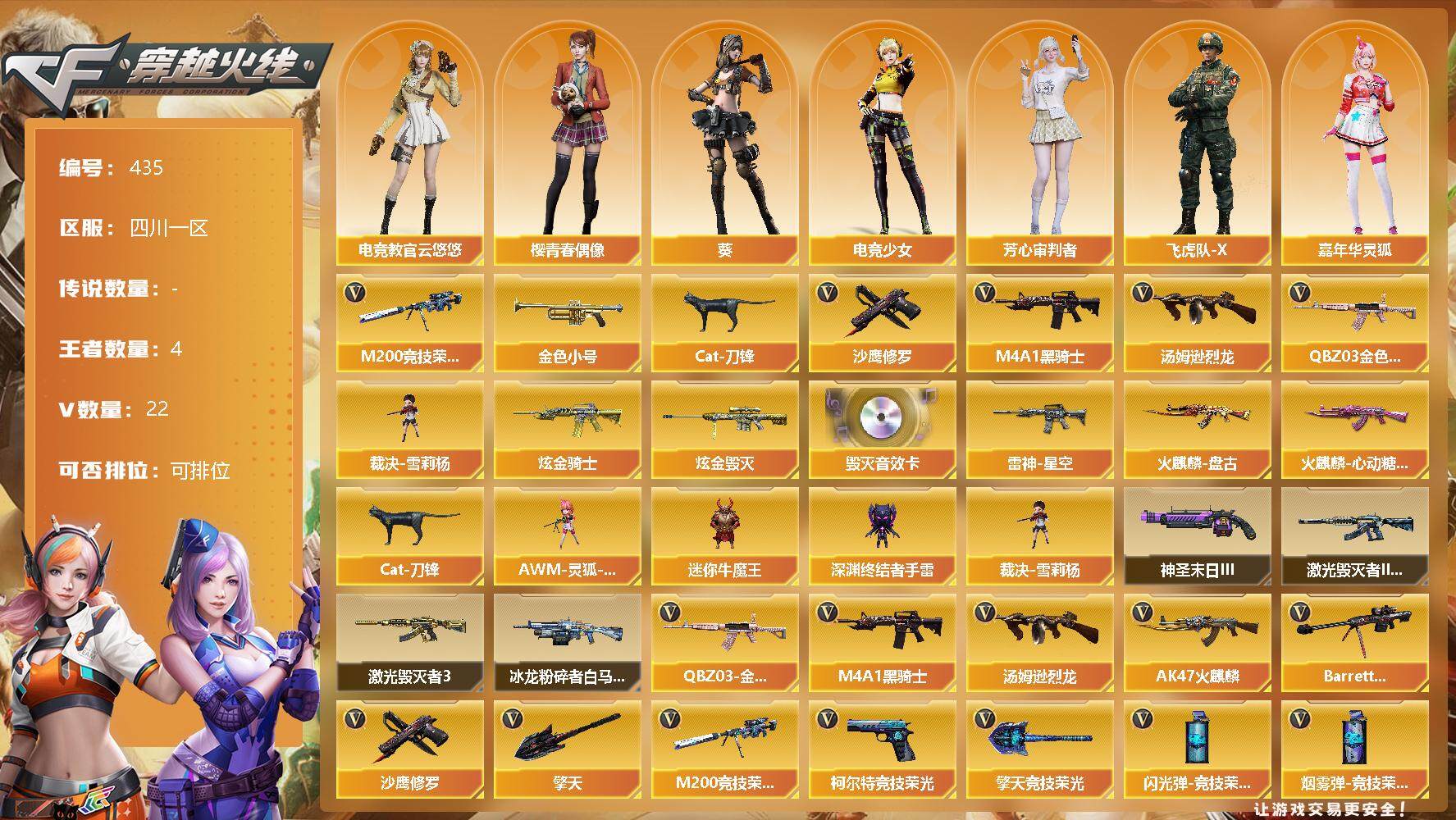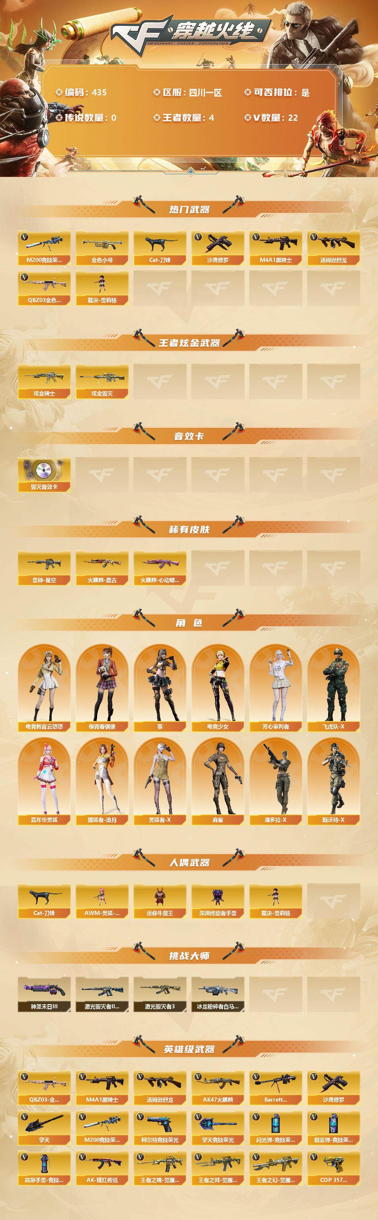 [13130043]四川一区-22V-4王者-2炫金 【热门武器】:QBZ03-金色蔷薇,M200-竞技荣光,金色小号,Cat-刀锋,M4A1-黑骑士,汤姆逊-烈龙,裁决-雪莉杨,沙鹰-修罗 【王者炫金武器】:炫金骑士,炫金毁灭 【音效卡】:Barrett-毁灭音效卡 【皮肤】:雷神-星空,火麒麟-盘古,火麒麟-心动糖果 【角色】:葵,电竞教官-云悠悠,电竞少女,芳心审判者,飞虎队-X,嘉年华灵狐,猎狐者-追月,灵狐者-X,麻雀,潘多拉-X,斯沃特-X,樱-青春偶像 【人偶武器】:裁决-雪莉杨,AWM-灵狐-15周年嘉年华,Cat-刀锋,迷你牛魔王,深渊终结者手雷 【挑战大师】:冰龙粉碎者-白马银枪,激光毁灭者III-白马银枪,激光毁灭者III,神圣爆裂者-末日III 【英雄级武器】:AK47-火麒麟*2,M4A1-黑骑士,QBZ03-金色蔷薇,王者之魄-觉醒版,王者之戮-觉醒版,王者之幻-觉醒版,AK-47-猩红传说,Barrett-毁灭,M200-竞技荣光,汤姆逊-烈龙,沙鹰-修罗,COP 357-雷霆王者-觉醒版,柯尔特-竞技荣光,擎天,擎天-竞技荣光,高爆手雷-竞技荣光*2,闪光弹-竞技荣光*3,烟雾弹-竞技荣光*3 【特殊枪械】:1黑骑士,1烈龙