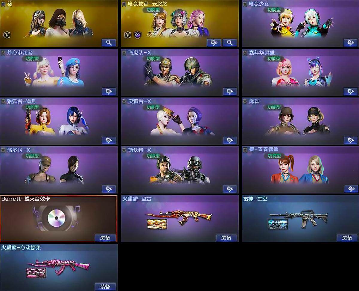 【角色】:葵,电竞教官-云悠悠,电竞少女,芳心审判者,飞虎队-X,嘉年华灵狐,猎狐者-追月,灵狐者-X,麻雀,潘多拉-X,斯沃特-X,樱-青春偶像