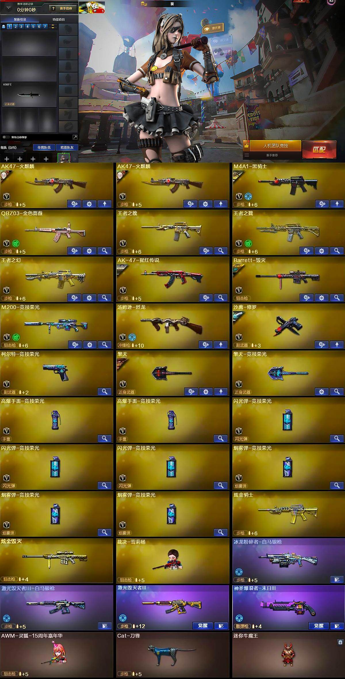 【英雄级武器】:AK47-火麒麟*2,M4A1-黑骑士,QBZ03-金色蔷薇,王者之魄-觉醒版,王者之戮-觉醒版,王者之幻-觉醒版,AK-47-猩红传说,Barrett-毁灭,M200-竞技荣光,汤姆逊-烈龙,沙鹰-修罗,COP 357-雷霆王者-觉醒版,柯尔特-竞技荣光,擎天,擎天-竞技荣光,高爆手雷-竞技荣光*2,闪光弹-竞技荣光*3,烟雾弹-竞技荣光*3