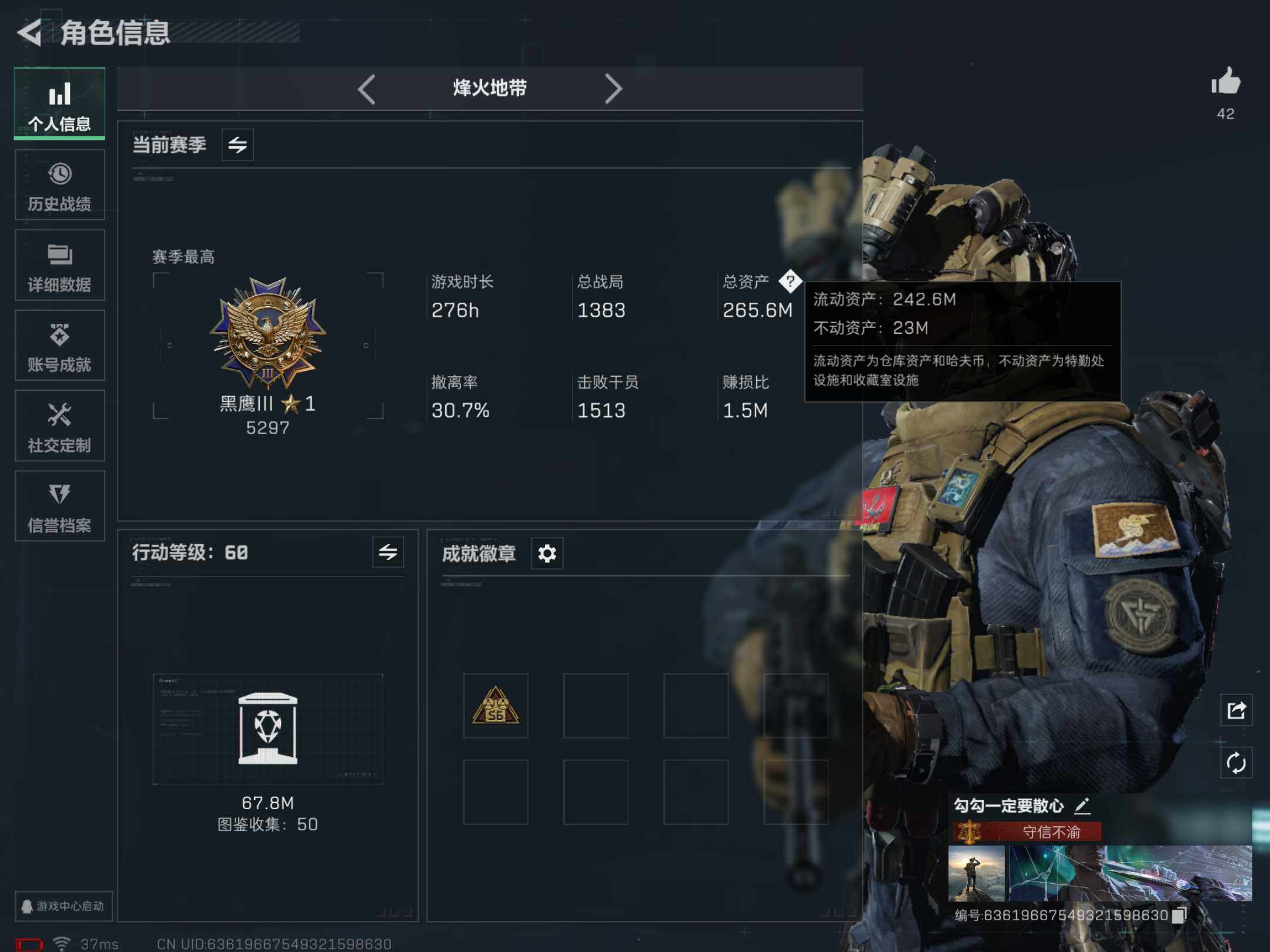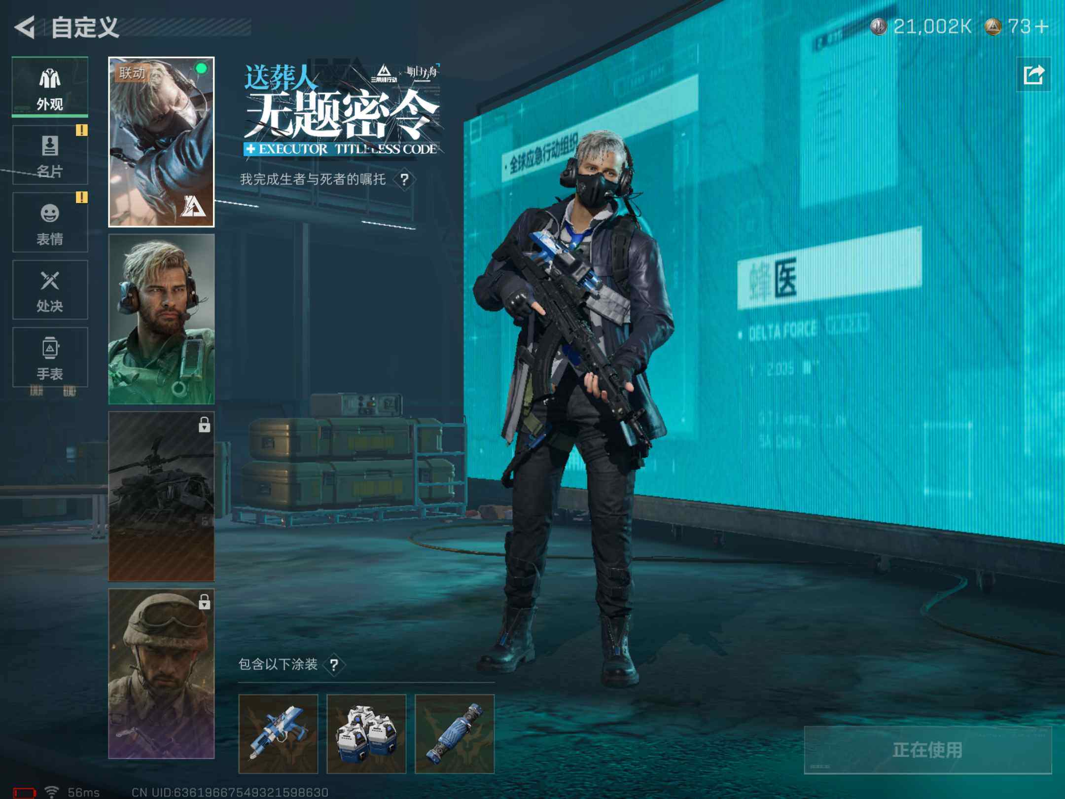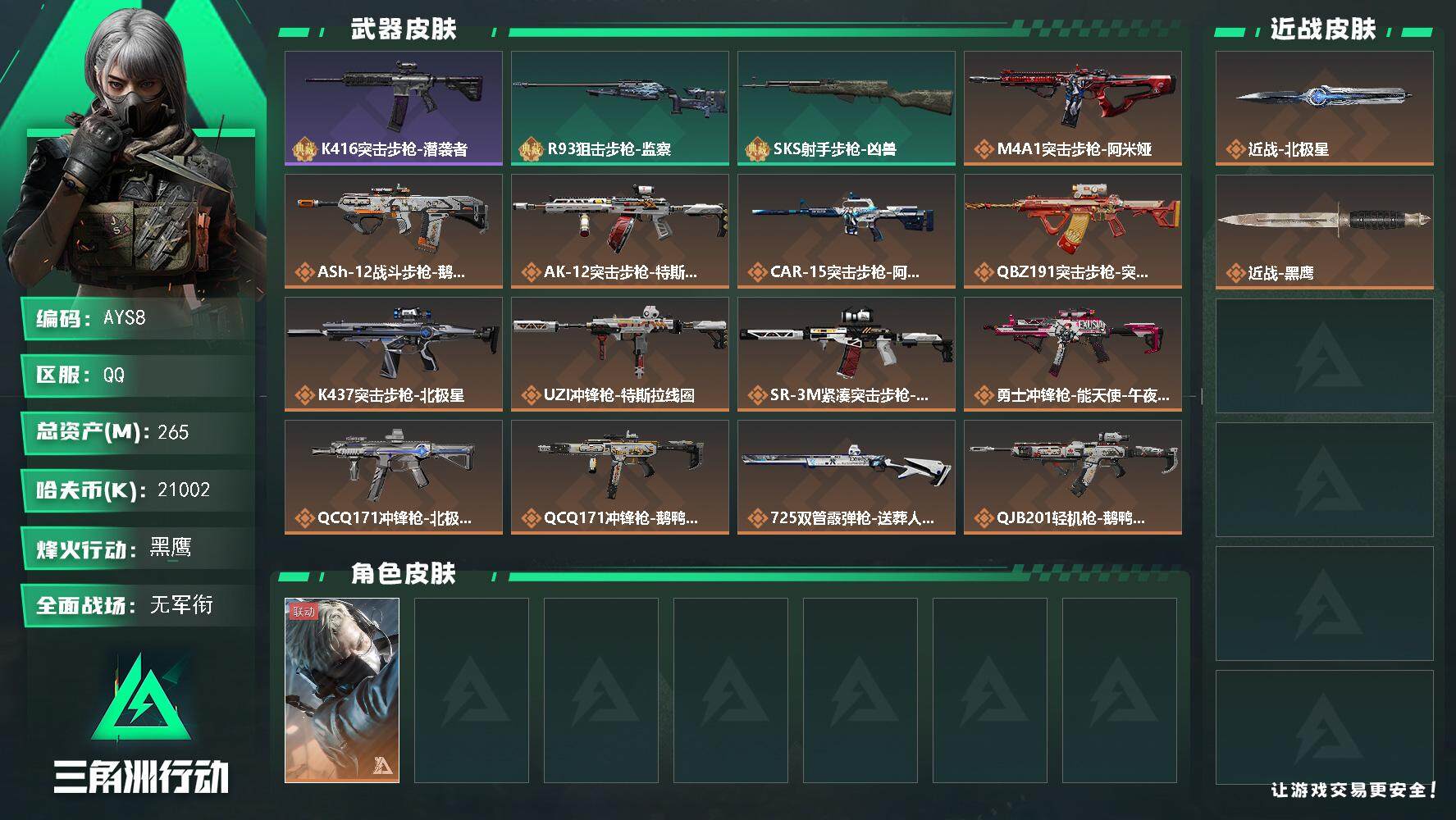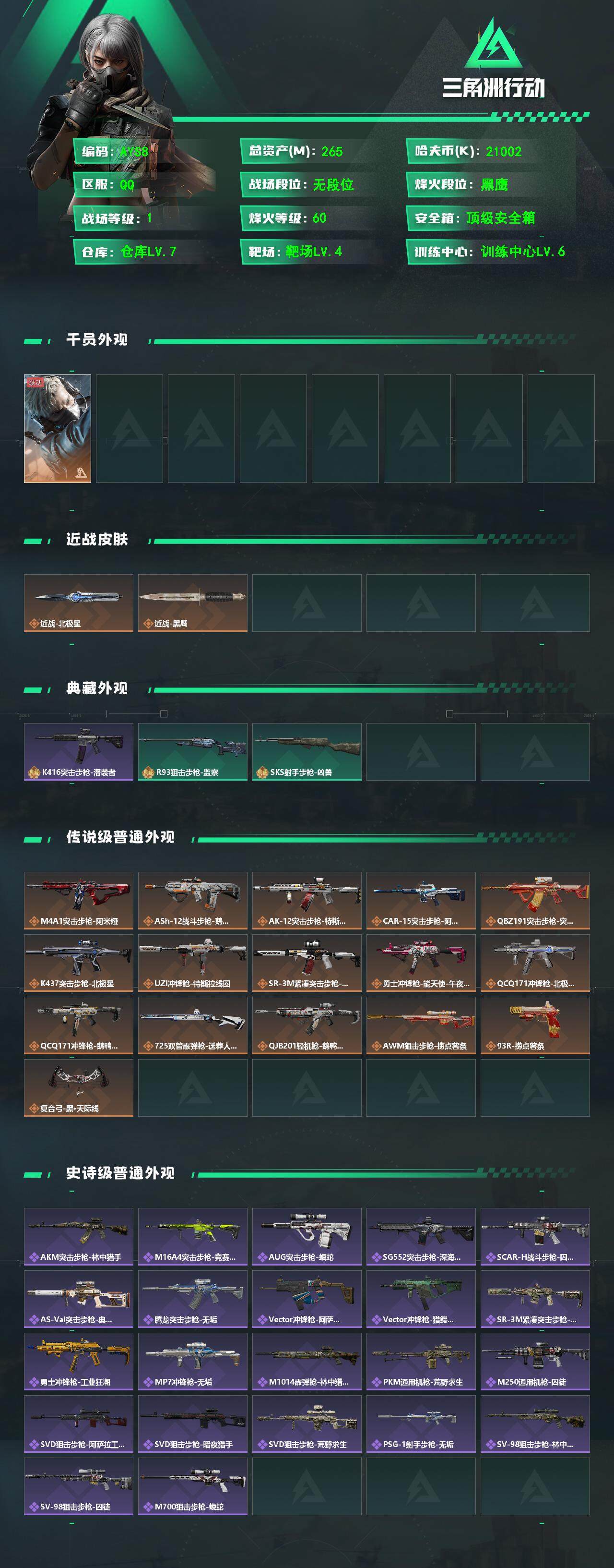 [13566785]可二次【店主推荐捡漏号!可直接换绑】总资产265m 21002k哈伏币-174m流动资产-60烽火等级-黑鹰-1战场等级-无军衔【干员外观】:蜂医-送葬人·无题密令【近战皮肤】:近战-北极星,近战-黑鹰【典藏外观】:K416突击步枪-潜袭者,R93狙击步枪-监察,SKS射手步枪-凶兽【传说级普通外观】:M4A1突击步枪-阿米娅,ASh-12战斗步枪-鹅鸭杀,AK-12突击步枪-特斯拉线圈,CAR-15突击步枪-阿米娅,腾龙突击步枪-捞点薯条,K437突击步枪-北极星,UZI冲锋枪-特斯拉线圈,SR-3M紧凑突击步枪-特斯拉线圈,勇士冲锋枪-能天使-午夜邮差,QCQ171冲锋枪-北极星,QCQ171冲锋枪-鹅鸭杀,725双管霰弹枪-送葬人-无题密令,QJB201轻机枪-鹅鸭杀,AWM狙击步枪-捞点薯条,93R-捞点薯条,复合弓-黑·天际线【史诗级普通外观】:AKM突击步枪-林中猎手,M16A4突击步枪-竞赛选手,AUG突击步枪-蝮蛇,SG552突击步枪-深海恐惧,SCAR-H战斗步枪-囚徒,AS Val突击步枪-典狱官,腾龙突击步枪-无垢,Vector冲锋枪-阿萨拉文明,Vector冲锋枪-猎鳄行动,SR-3M紧凑突击步枪-荒野求生,勇士冲锋枪-工业狂潮,MP7冲锋枪-无垢,M1014霰弹枪-林中猎手,PKM通用机枪-荒野求生,M250通用机枪-囚徒,SVD狙击步枪-阿萨拉工艺,SVD狙击步枪-暗夜猎手,SVD狙击步枪-荒野求生,PSG-1射手步枪-无垢,SV-98狙击步枪-林中猎手,SV-98狙击步枪-囚徒,M700狙击步枪-蝮蛇【稀有级普通外观】:M4A1突击步枪-前沿科技,K416突击步枪-虎啸,AUG突击步枪-指挥官,AUG突击步枪-前沿科技,M7战斗步枪-前沿科技,SCAR-H战斗步枪-荣耀列队,PTR-32突击步枪-天网,PTR-32突击步枪-英雄,腾龙突击步枪-雪崩,腾龙突击步枪-前沿科技,MP5冲锋枪-前沿科技,MP5冲锋枪-弄臣,MP5冲锋枪-虎啸,P90冲锋枪-浅鲨小队,P90冲锋枪-新生,Vector冲锋枪-先锋,UZI冲锋枪-前沿科技,野牛冲锋枪-前沿科技,SMG-45-行动开启,SMG-45冲锋枪-幻影结构,SMG-45冲锋枪-天网,SR-3M紧凑突击步枪-前沿科技,SR-3M紧凑突击步枪-雪崩,M1014霰弹枪-幻影结构,M250通用机枪