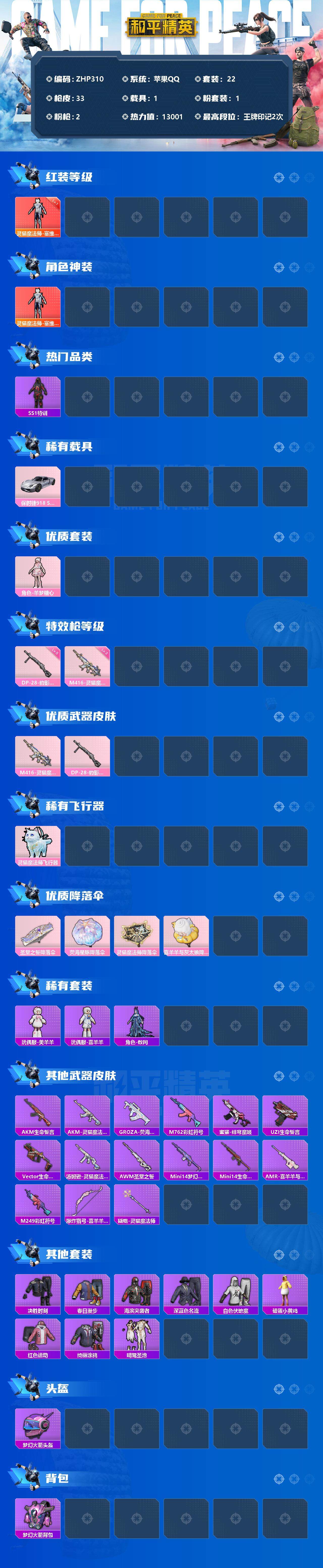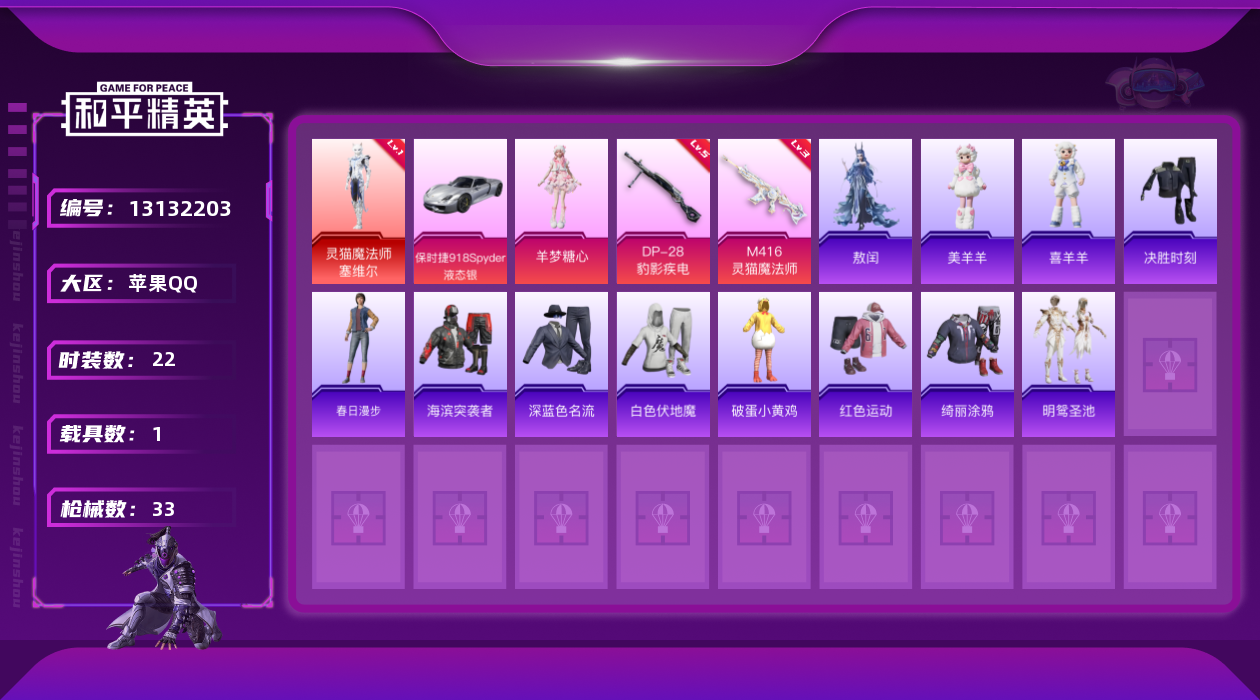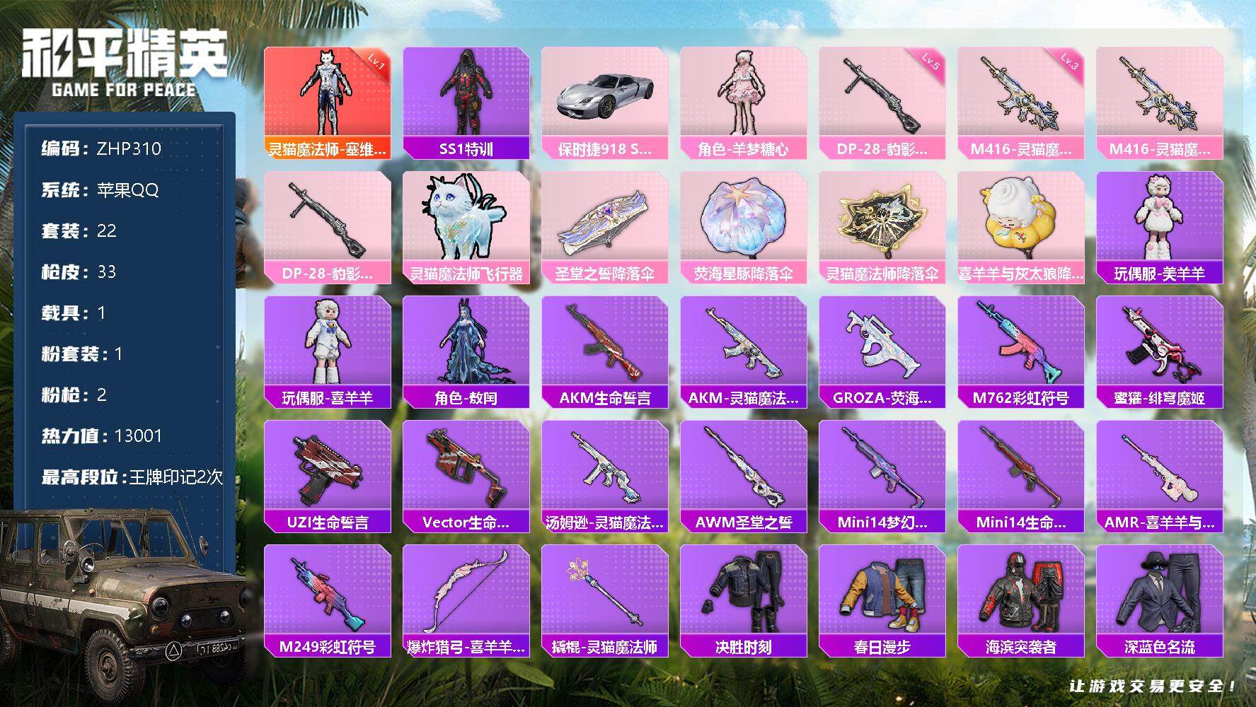[13132203]苹果 手Q-1神装-1粉装-2特效枪-1载具-1粉色飞行器-13001热力值-2王牌印记-22套装-33枪皮 【红色神装等级】:灵猫魔法师-塞维尔(一级) 【红色角色神装】:灵猫魔法师-塞维尔 【热门品类】:套装-SS1特训 【粉色载具】:保时捷918 Spyder(液态银) 【粉色套装】:角色-羊梦糖心 【粉色枪皮等级】:M416-灵猫魔法师(三级),DP-28-豹影疾电(五级) 【粉色枪皮】:M416-灵猫魔法师,DP-28-豹影疾电 【粉色飞行器】:灵猫魔法师飞行器 【粉色降落伞】:圣堂之誓降落伞,荧海星豚降落伞,灵猫魔法师降落伞,喜羊羊与灰太狼降落伞 【稀有套装】:玩偶服-美羊羊,玩偶服-喜羊羊,角色-敖闰 【稀有枪皮】:AKM-生命誓言,AKM-灵猫魔法师,GROZA-荧海星豚,M762-彩虹符号,蜜獾-绯穹魔姬,UZI-生命誓言,Vector-生命誓言,汤姆逊-灵猫魔法师,AWM-圣堂之誓,Mini14-梦幻火箭,Mini14-生命誓言,AMR-喜羊羊与灰太狼,M249-彩虹符号,爆炸猎弓-喜羊羊与灰太狼,撬棍-灵猫魔法师 【其他套装】:套装-决胜时刻,套装-春日漫步,套装-海滨突袭者,套装-深蓝色名流,套装-白色伏地魔,套装-破蛋小黄鸡,套装-红色运动,套装-绮丽涂鸦,套装-明鸳圣池 【稀有头盔】:梦幻火箭头盔(3级),梦幻火箭头盔(1级) 【稀有背包】:梦幻火箭背包(1级) 【营地ID】:748572753