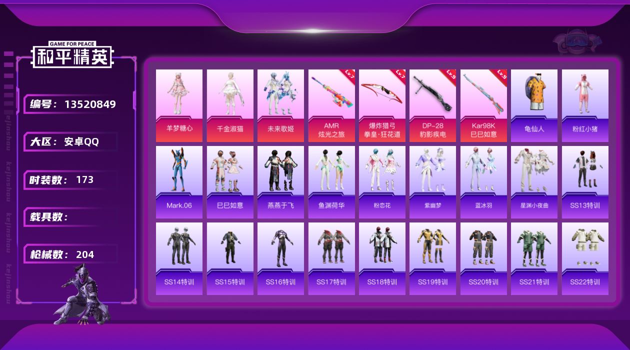 - [12953086]素材身法号【特价急出/详情看图】:安卓 手Q-28粉装-5特效枪-5载具-1粉色飞行器-9.5w热力值-6王牌印记-223套装-244枪皮【热门品类】:粉装-雪国幻梦,粉装-梦幻火箭,粉装-童趣迷兔,套装-浪漫天命,套装-深海小丑鱼,套装-小丑鱼,套装-奇异狩猎者,套装-胖达圆圆,套装-暗夜行者,套装-动感兔斯基人偶服,套装-龟仙人,套装-潮萌小黄鸭,套装-浪漫波比【粉色载具】:兰博基尼URUS(明艳黄),阿斯顿马丁DBS(绿),玛莎拉蒂MC20(星石白),玛莎拉蒂Quattroporte(夜幕蓝),合金龙骨(绿)【粉色套装】:粉装-快乐主宰,粉装-深渊皇后,粉装-宝贝奶油派,粉装-天使彩虹糖,粉装-金曜白虎,粉装-雪国幻梦,粉装-梦幻火箭,粉装-金风玉露,粉装-金属狂野,粉装-古堡领主,粉装-极致幻想,粉装-草莓生巧,粉装-冰霜白皇,粉装-童趣迷兔,粉装-炙焰红王,粉装-暗翼战神,粉装-馨动时刻,粉装-蜜桃特工,粉装-蝶舞蔷薇,角色-零号机款机体服,粉装-暗星紫秘,粉装-赤焰黑爵,粉装-紫电风暴,粉装-灵感创作师,粉装-冰川红玫,粉装-寒光使者,粉装-苔丝玫瑰,粉装-仲夏莫吉托【粉色枪皮等级】:AKM-炫紫旋律(七级),SCAR-L-梦幻火箭(六级),M416-心之恋语(七级),UMP45-相思残雪(七级),AWM-橘柚倾心(二级)【粉色飞行器】:梦幻火箭飞行器
