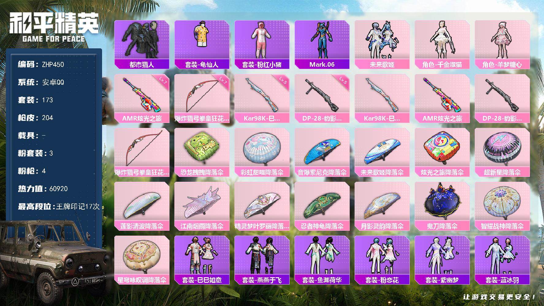 [13520849]可二次【店主推荐捡漏号!可直接换绑】/地铁满天赋 安卓 手Q-3粉装-4特效枪-1粉色飞行器-6w热力值-17王牌印记-173套装-204枪皮【热门品类】:套装-都市猎人,套装-龟仙人,套装-粉红小猪,角色-Mark.06【粉色套装】:粉装-未来歌姬,角色-千金淑猫,角色-羊梦糖心【粉色枪皮等级】:Kar98K-巳巳如意(五级),AMR-炫光之旅(七级),DP-28-豹影疾电(五级),爆炸猎弓-拳皇·狂花道(七级)