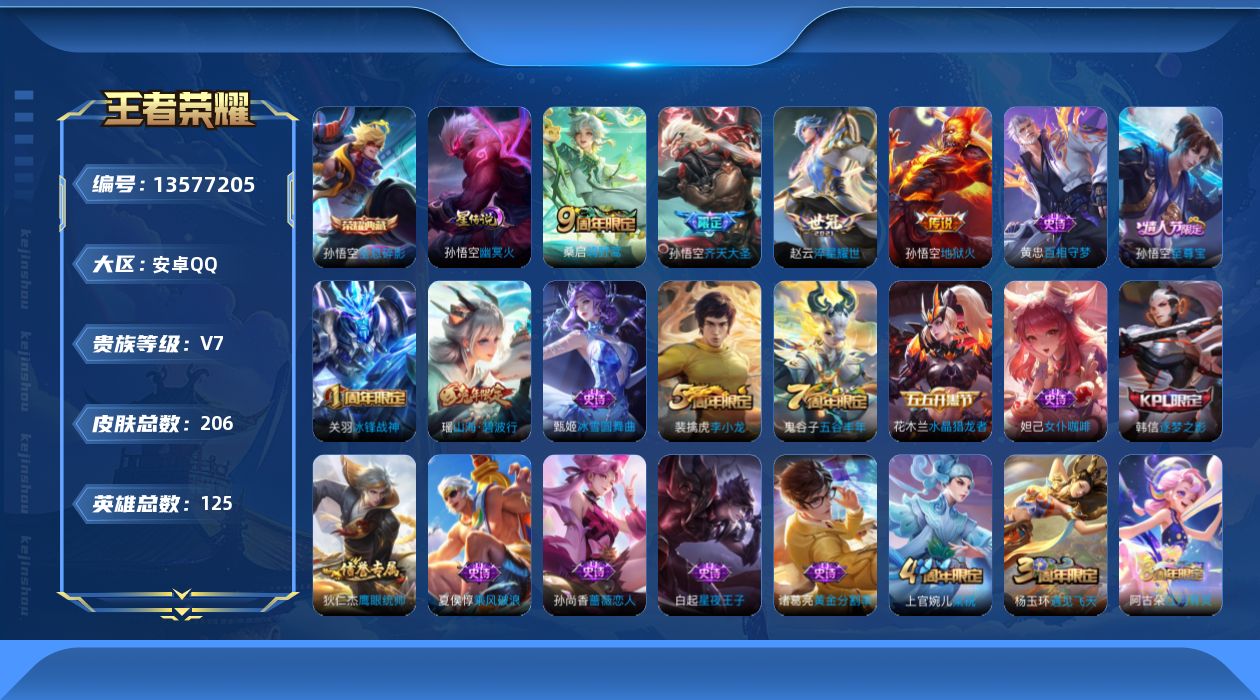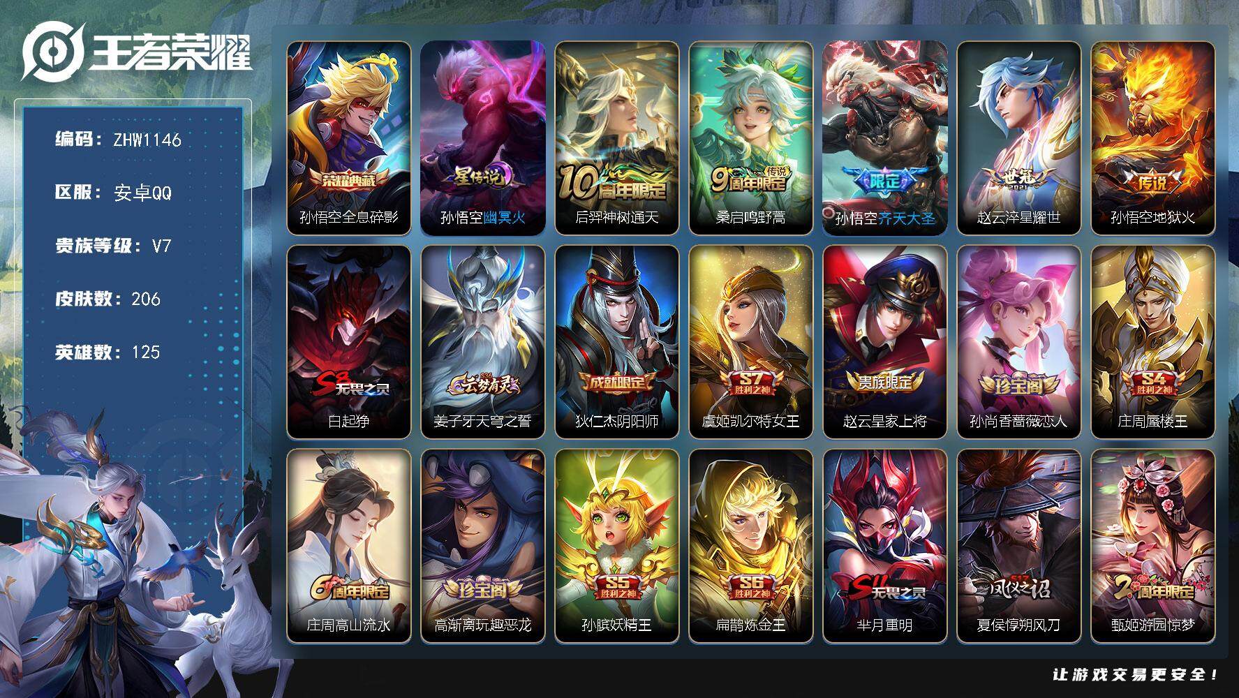 [13577205]可二次【店主推荐捡漏号!可直接换绑】,安卓Q-V7-至尊星耀V段位-125英雄-206皮肤-1典藏-5传说-39史诗 【荣耀典藏】:孙悟空全息碎影 【传说皮肤】:后羿神树通天,桑启鸣野蒿,孙悟空齐天大圣,赵云淬星耀世,孙悟空地狱火 【限定皮肤】:白起狰,姜子牙天穹之誓,狄仁杰阴阳师,虞姬凯尔特女王,赵云皇家上将,孙尚香蔷薇恋人,庄周蜃楼王,庄周高山流水,高渐离玩趣恶龙,孙膑妖精王,扁鹊炼金王,芈月重明,夏侯惇朔风刀,甄姬游园惊梦,曹操烛龙,典韦穷奇,狄仁杰魔术师,狄仁杰万华元夜,达摩沙漠行僧,项羽海滩派对,老夫子醍醐杖,关羽冰锋战神,程咬金演武夺筹,韩信逐梦之影,兰陵王金庭之子,亚瑟狮心王,孙悟空至尊宝,孙悟空齐天大圣,李元芳云中旅人,钟馗驱傩正仪,杨玉环遇见飞天,太乙真人饕餮,鬼谷子原初探秘者,鬼谷子五谷丰年,苏烈千军破阵,弈星混沌棋,沈梦溪大漠名商,明世隐疑决卦,裴擒虎李小龙,裴擒虎擒涛扼浪,狂铁御狮,米莱狄御霄,瑶山海碧波行,上官婉儿梁祝,鲁班大师探海日志,桑启海盐诗旅,阿古朵江河有灵,张良古海寻踪,蒙恬荣光圣徽,鬼谷子天穹祈灯,刘邦剑破天穹,周瑜熔金海岸 【年限皮肤】:瑶山海碧波行 【赛季限定】:庄周蜃楼王,孙膑妖精王,扁鹊炼金王,白起狰,芈月重明,夏侯惇朔风刀,曹操烛龙,典韦穷奇,狄仁杰万华元夜,达摩沙漠行僧,老夫子醍醐杖,程咬金演武夺筹,兰陵王金庭之子,张良古海寻踪,亚瑟狮心王,李元芳云中旅人,虞姬凯尔特女王,钟馗驱傩正仪,太乙真人饕餮,鬼谷子原初探秘者,苏烈千军破阵,弈星混沌棋,沈梦溪大漠名商,明世隐疑决卦,裴擒虎擒涛扼浪,狂铁御狮,米莱狄御霄,鲁班大师探海日志,桑启海盐诗旅,鬼谷子天穹祈灯,蒙恬荣光圣徽,刘邦剑破天穹,姜子牙天穹之誓 【史诗皮肤】:赵云皇家上将,赵云未来纪元,貂蝉圣诞恋歌,甄姬冰雪圆舞曲,王昭君偶像歌手,狄仁杰魔术师,廉颇地狱岩魂,宫本武藏鬼剑武藏,孙尚香蔷薇恋人,孙尚香水果甜心,妲己魅力维加斯,妲己女仆咖啡,墨子金属风暴,吕布圣诞狂欢,张飞乱世虎臣,关羽冰锋战神,孙悟空至尊宝,花木兰水晶猎龙者,刘邦德古拉伯爵,韩信逐梦之影,夏侯惇乘风破浪,兰陵王暗隐猎兽者,诸葛亮黄金分割率,甄姬游园惊梦,蔡文姬舞动绿茵,刘禅天才门将,李元芳逐浪之夏,白起星夜王子,杨玉环遇见飞天,狄仁杰鹰眼统帅,上官婉儿梁祝,裴擒虎李小龙,庄周高山流水,鬼谷子五谷