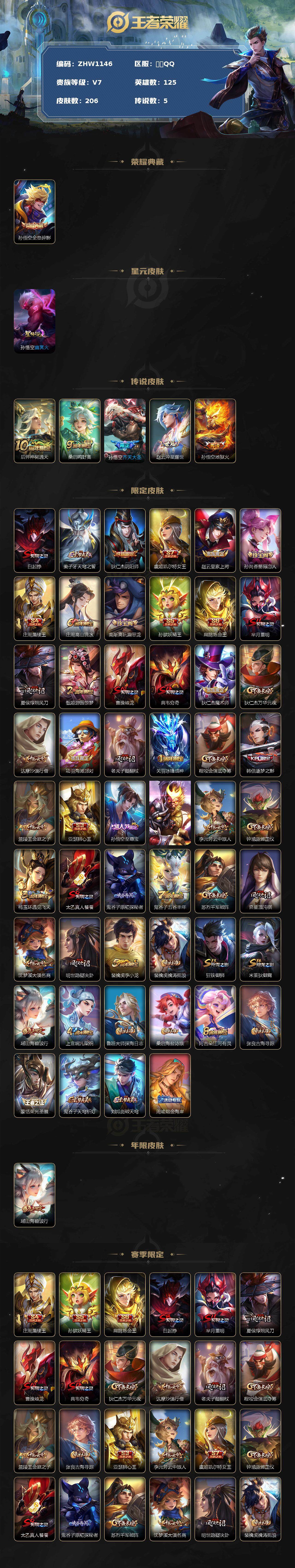 - [12620838]安卓Q-V8-至尊星耀II段位-126英雄-357皮肤-1典藏-0珍品无双-0无双-0珍品传说-21传说-110史诗 【英雄全皮】:刘邦全皮,鬼谷子全皮,猪八戒全皮,蒙恬全皮,影全皮 【荣耀典藏】:武则天英雄,夏侯惇无限飓风号 【传说皮肤】:公孙离记忆之芯,不知火舞绯月行,王昭君星穹之声,大乔挚爱花嫁,孙策挚爱之约,孙尚香异界灵契,王昭君乞巧织情,西施游龙清影,曜李逍遥 ,兰陵王默契交锋,镜炽阳神光,虞姬启明星使,曜云鹰飞将,李信一念神魔,刘备时之恋人,伽罗太华,貂蝉猫影幻舞,虞姬云霓雀翎,百里玄策白虎志,杨戬永曜之星,武则天海洋之心 【限定皮肤】:白起狰,姜子牙天穹之誓,狄仁杰阴阳师,虞姬凯尔特女王,赵云皇家上将,赵云龙胆,墨子神迹守卫,嬴政优雅恋人,嬴政白昼王子,孙尚香异界灵契,鲁班七号狮舞东方,庄周蜃楼王,庄周云端筑梦师,庄周高山流水,高渐离死亡摇滚,阿轲迷踪丽影,钟无艳超时空战士,孙膑妖精王,孙膑天狼运算者,扁鹊炼金王,白起夜都怪侠,芈月重明,芈月白晶晶,芈月幻夜卜梦,吕布猎兽之王,周瑜赤莲之焰,元歌云间偶戏,元歌无心,夏侯惇朔风刀,甄姬女儿国国王,甄姬游园惊梦,甄姬落雪兰心,曹操烛龙,曹操天狼征服者,典韦穷奇,典韦蓝屏警告,马可波罗暗影游猎,狄仁杰魔术师,狄仁杰万华元夜,达摩星际陆战队,达摩沙漠行僧,项羽海滩派对,老夫子醍醐杖,老夫子航海奇遇记,程咬金演武夺筹,刘邦夺宝奇兵,韩信傲雪梅枪,王昭君午后时光,王昭君星穹之声,兰陵王默契交锋,兰陵王驯魔猎人,兰陵王金庭之子,花木兰青春决赛季,花木兰瑞麟志,花木兰默契交锋,不知火舞绯月行,亚瑟狮心王,亚瑟潮玩骑士王,孙悟空至尊宝,孙悟空大圣娶亲,孙悟空孙行者,牛魔御旌,后羿辉光之辰,后羿圣弓游侠,李元芳银河之约,李元芳云中旅人,虞姬启明星使,钟馗神迹守卫,钟馗驱傩正仪,杨玉环遇见飞天,杨戬永曜之星,女娲朔望之晖,干将莫邪真爱魔法,雅典娜单词大作战,雅典娜黎明之约,蔡文姬繁星吟游,太乙真人饕餮,太乙真人华丽摇滚,鬼谷子原初探秘者,鬼谷子五谷丰年,大乔白鹤梁神女,大乔挚爱花嫁,黄忠火炮绅士,苏烈千军破阵,百里玄策白虎志,百里玄策原初追逐者,弈星混沌棋,梦奇顽趣,沈梦溪星空之诺,沈梦溪大漠名商,明世隐疑决卦,明世隐吟游魔法,裴擒虎天狼狩猎者,裴擒虎李小龙,裴擒虎擒涛扼浪,狂铁御狮,狂铁电玩高手,米莱狄御霄,米莱狄胡桃异