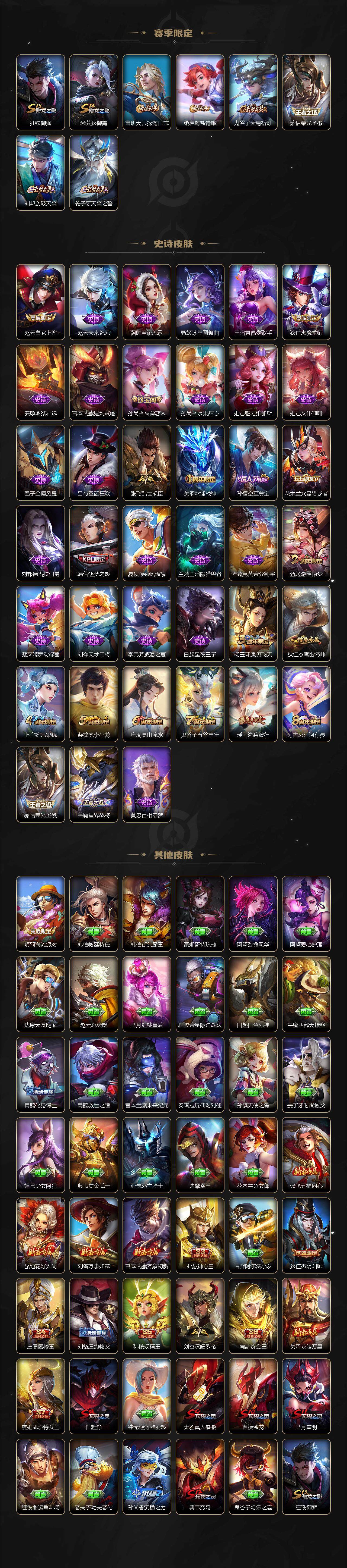 【史诗皮肤】:赵云皇家上将,赵云未来纪元,貂蝉圣诞恋歌,甄姬冰雪圆舞曲,王昭君偶像歌手,狄仁杰魔术师,廉颇地狱岩魂,宫本武藏鬼剑武藏,孙尚香蔷薇恋人,孙尚香水果甜心,妲己魅力维加斯,妲己女仆咖啡,墨子金属风暴,吕布圣诞狂欢,张飞乱世虎臣,关羽冰锋战神,孙悟空至尊宝,花木兰水晶猎龙者,刘邦德古拉伯爵,韩信逐梦之影,夏侯惇乘风破浪,兰陵王暗隐猎兽者,诸葛亮黄金分割率,甄姬游园惊梦,蔡文姬舞动绿茵,刘禅天才门将,李元芳逐浪之夏,白起星夜王子,杨玉环遇见飞天,狄仁杰鹰眼统帅,上官婉儿梁祝,裴擒虎李小龙,庄周高山流水,鬼谷子五谷