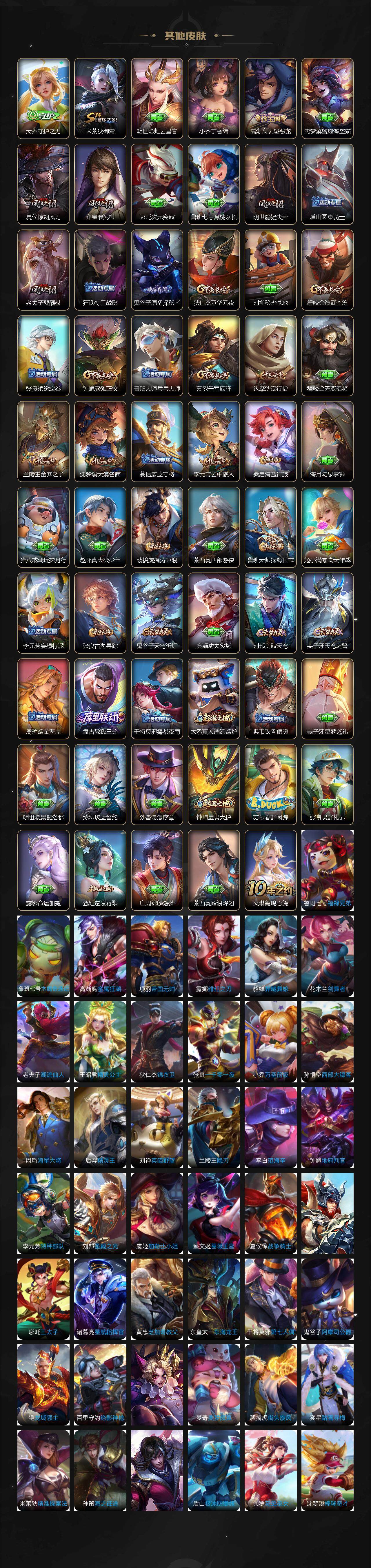 【限定皮肤】:白起狰,姜子牙天穹之誓,狄仁杰阴阳师,虞姬凯尔特女王,赵云皇家上将,孙尚香蔷薇恋人,庄周蜃楼王,庄周高山流水,高渐离玩趣恶龙,孙膑妖精王,扁鹊炼金王,芈月重明,夏侯惇朔风刀,甄姬游园惊梦,曹操烛龙,典韦穷奇,狄仁杰魔术师,狄仁杰万华元夜,达摩沙漠行僧,项羽海滩派对,老夫子醍醐杖,关羽冰锋战神,程咬金演武夺筹,韩信逐梦之影,兰陵王金庭之子,亚瑟狮心王,孙悟空至尊宝,孙悟空齐天大圣,李元芳云中旅人,钟馗驱傩正仪,杨玉环遇见飞天,太乙真人饕餮,鬼谷子原初探秘者,鬼谷子五谷丰年,苏烈千军破阵,弈星混沌棋,沈梦溪大漠名商,明世隐疑决卦,裴擒虎李小龙,裴擒虎擒涛扼浪,狂铁御狮,米莱狄御霄,瑶山海碧波行,上官婉儿梁祝,鲁班大师探海日志,桑启海盐诗旅,阿古朵江河有灵,张良古海寻踪,蒙恬荣光圣徽,鬼谷子天穹祈灯,刘邦剑破天穹,周瑜熔金海岸