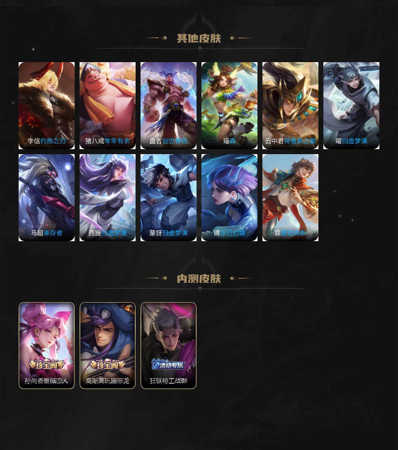 【赛季限定】:庄周蜃楼王,孙膑妖精王,扁鹊炼金王,白起狰,芈月重明,夏侯惇朔风刀,曹操烛龙,典韦穷奇,狄仁杰万华元夜,达摩沙漠行僧,老夫子醍醐杖,程咬金演武夺筹,兰陵王金庭之子,张良古海寻踪,亚瑟狮心王,李元芳云中旅人,虞姬凯尔特女王,钟馗驱傩正仪,太乙真人饕餮,鬼谷子原初探秘者,苏烈千军破阵,弈星混沌棋,沈梦溪大漠名商,明世隐疑决卦,裴擒虎擒涛扼浪,狂铁御狮,米莱狄御霄,鲁班大师探海日志,桑启海盐诗旅,鬼谷子天穹祈灯,蒙恬荣光圣徽,刘邦剑破天穹,姜子牙天穹之誓