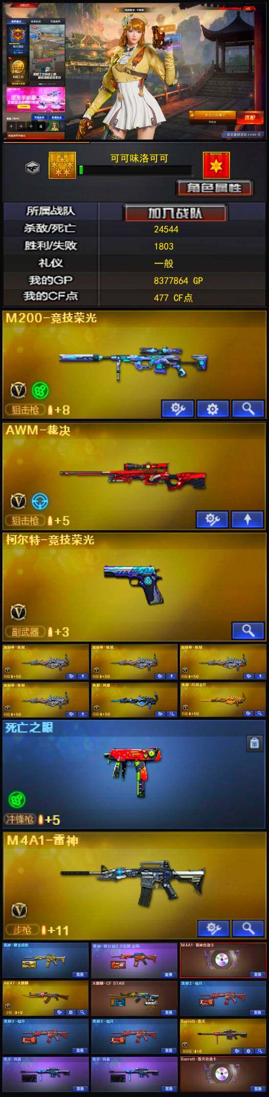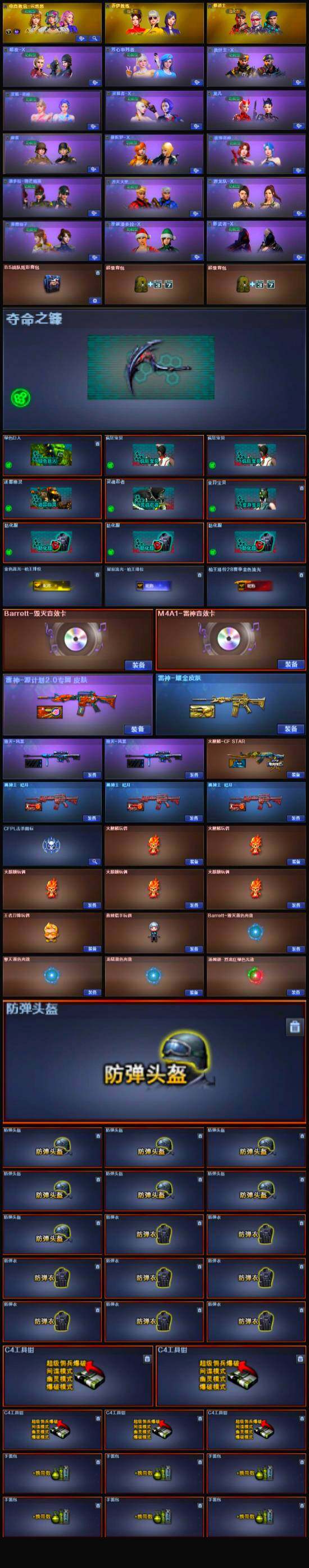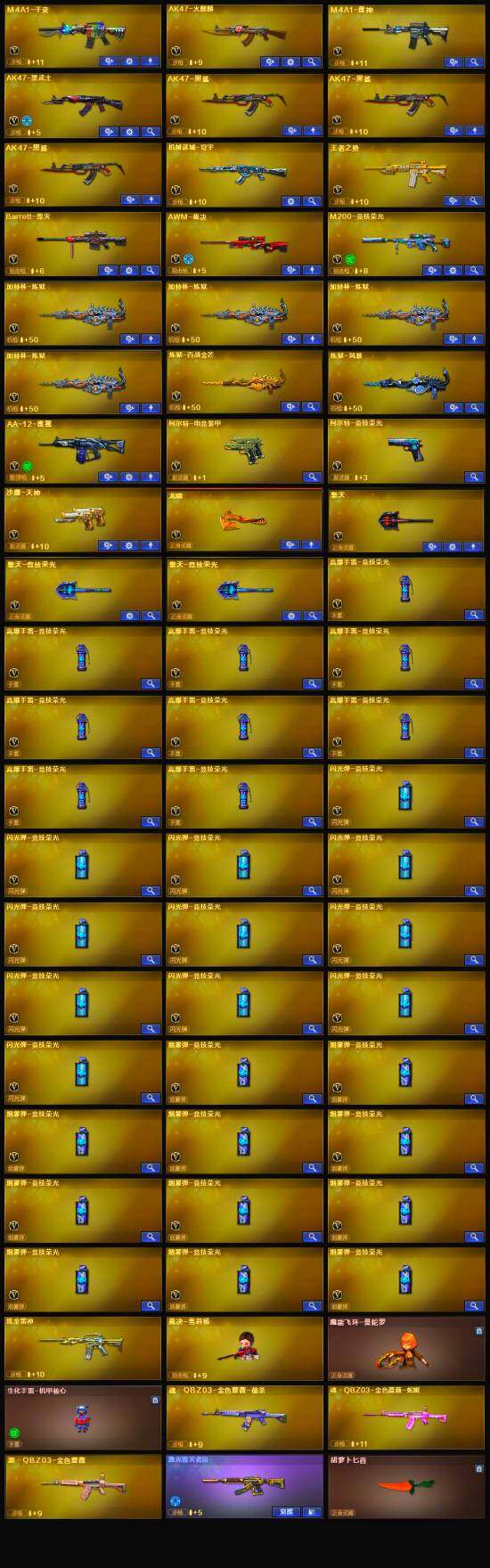 【英雄级武器】:M4A1-千变,AK47-火麒麟,M4A1-雷神,AK47-黑武士,AK47-黑鲨*3,王者之势-觉醒版,AK-47-猩红传说,Barrett-毁灭,AWM-裁决,M200-竞技荣光,加特林-炼狱*4,炼狱-百战金芒,炼狱-风暴,AA-12-雷霆,沙鹰-天神,柯尔特-电竞装甲,柯尔特-竞技荣光,龙啸,擎天,擎天-竞技荣光*2,麒麟刺-百战金芒,高爆手雷-竞技荣光*9,闪光弹-竞技荣光*11,烟雾弹-竞技荣光*11