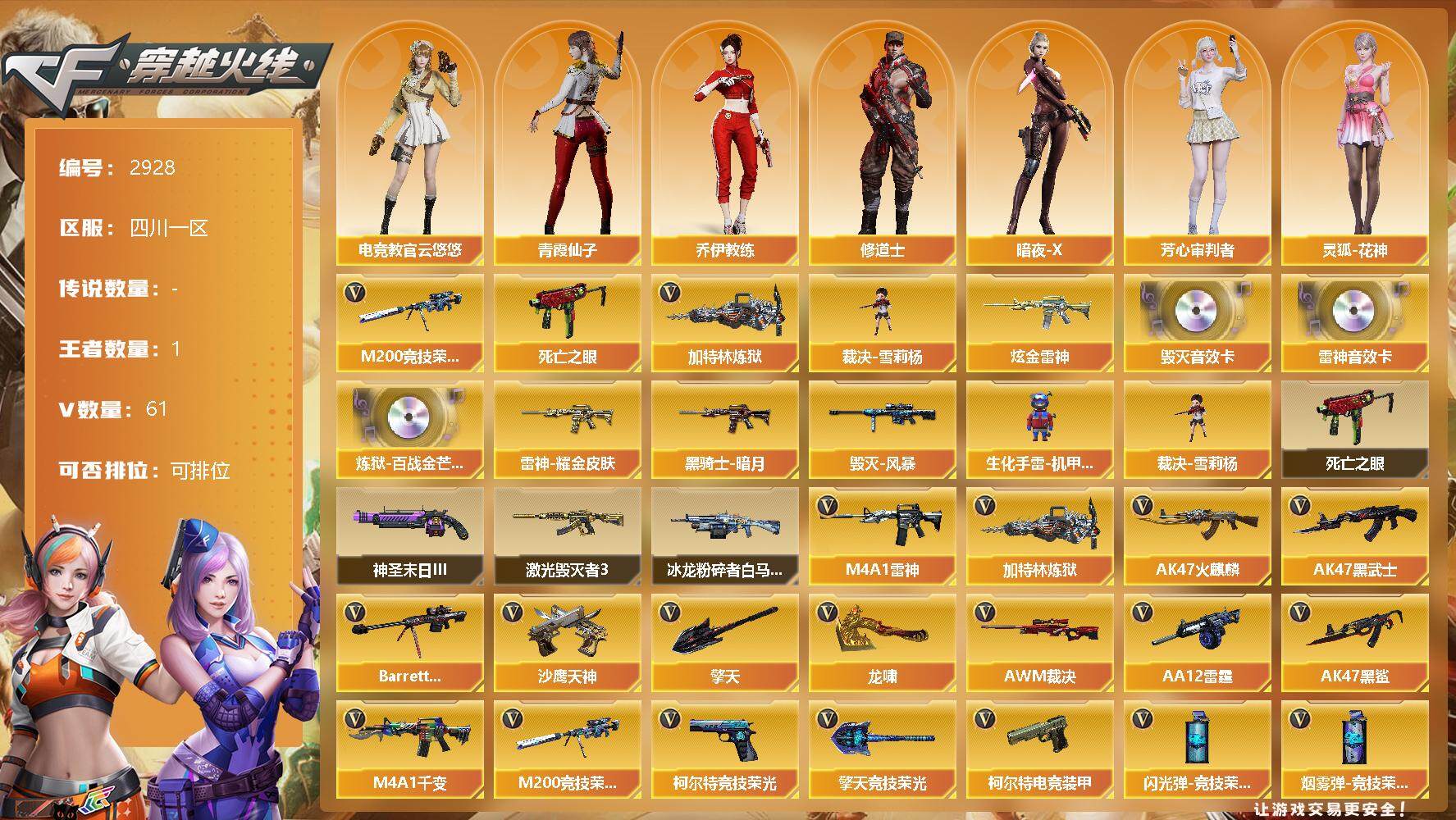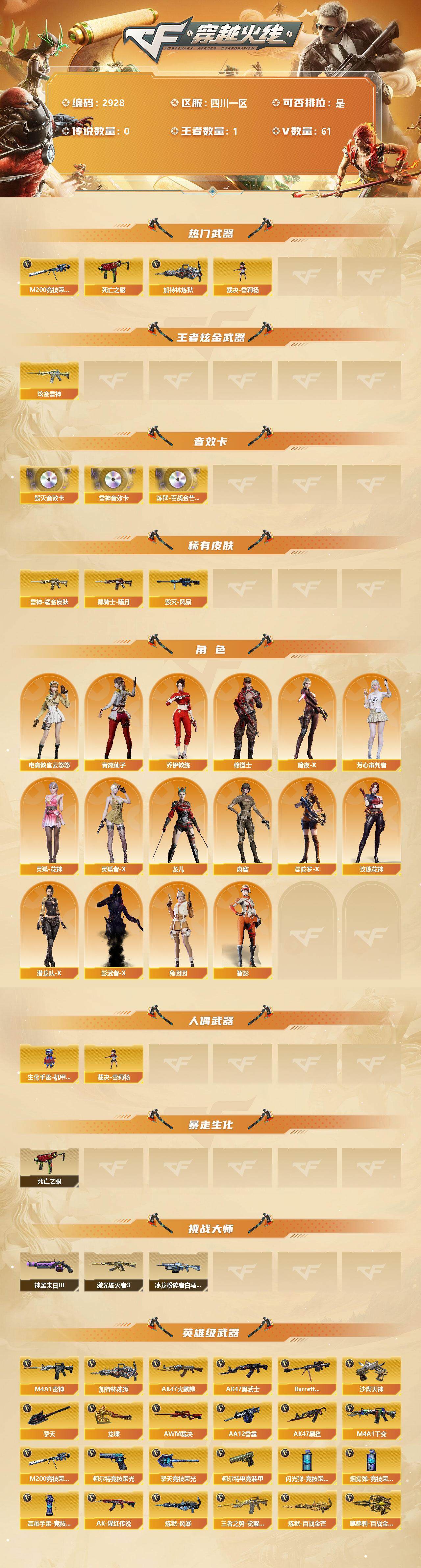 [13199773]四川一区-61V-1王者-1炫金 【热门武器】:M200-竞技荣光,死亡之眼,加特林-炼狱*4,裁决-雪莉杨 【王者炫金武器】:炫金雷神 【音效卡】:M4A1-雷神音效卡,Barrett-毁灭音效卡,炼狱-百战金芒-庆典舞曲音效卡 【皮肤】:雷神-耀金皮肤,雷神-源计划2.0专属 皮肤,M4A1-再燃火线,毁灭-风暴*2,M4A1-千变-孔明皮肤,黑骑士-暗月*3,轻型军用手斧-再燃火线 【角色】:电竞教官-云悠悠,乔伊教练,修道士,暗夜-X,芳心审判者,灵狐-花神,灵狐者-X,龙儿,麻雀,曼陀罗-X,玫瑰花神,潜龙队-X,青霞仙子,兔囡囡,影武者-X,智影 【人偶武器】:裁决-雪莉杨,生化手雷-机甲核心 【暴走生化】:死亡之眼 【挑战大师】:冰龙粉碎者-白马银枪,激光毁灭者III,神圣爆裂者-末日III 【英雄级武器】:M4A1-千变,AK47-火麒麟,M4A1-雷神,AK47-黑武士,AK47-黑鲨*3,王者之势-觉醒版,AK-47-猩红传说,Barrett-毁灭,AWM-裁决,M200-竞技荣光,加特林-炼狱*4,炼狱-百战金芒,炼狱-风暴,AA-12-雷霆,沙鹰-天神,柯尔特-电竞装甲,柯尔特-竞技荣光,龙啸,擎天,擎天-竞技荣光*2,麒麟刺-百战金芒,高爆手雷-竞技荣光*9,闪光弹-竞技荣光*11,烟雾弹-竞技荣光*11 【特殊枪械】:4炼狱