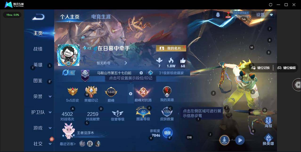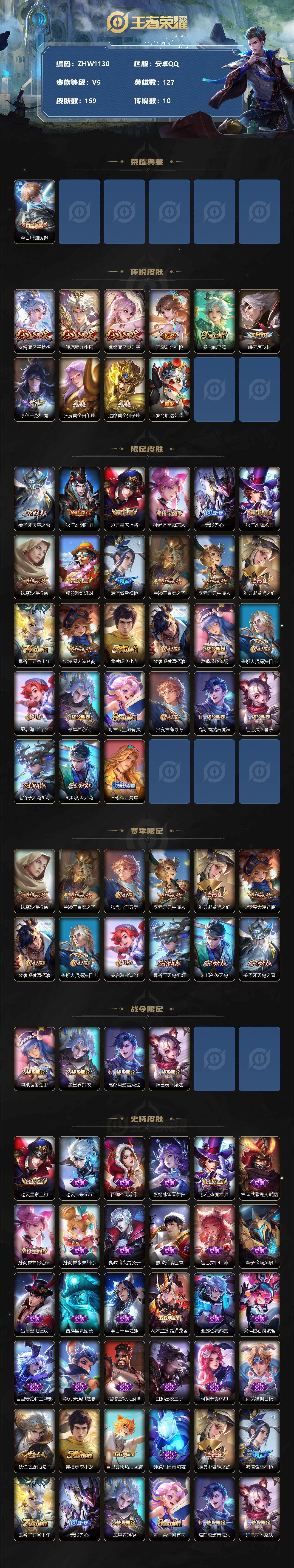 - [11965610]V7 1典藏 9传说 123英雄 227皮肤 可修改实名 优质装备:九霄神辉(木兰典藏),云鹰飞将(小将军),地狱火,地狱之眼 传说皮:云诺千山,祥瑞亨通,幻光神枪 珍宝阁皮:优雅恋人,女武神 限定皮:愿照·九州拓(澜年限),愿照·山河定(司空震年限),鸣野蒿,至尊宝,神威(电光马子),梁祝,天狼绘梦者,李小龙,大圣娶亲 史诗皮:化蝶舞,星界战将,龙之律动,茶境仙,蔬乡物语(鲁班七号),紫霞仙子,白龙吟,黄金分割率,特工魅影,蒙恬荣光圣徽,冰冠公主,偶像歌手,末日机甲-吕布,猫狗日记-孙策,猫狗日记-大乔,修罗,摇滚巨星,水果甜心,天才门将,星夜王子,功夫厨神,德古拉伯爵,暗隐猎兽者,幽灵船长,心灵战警,舞动绿茵,地狱岩魂,纤云弄巧,繁星吟游(呼啦呼啦),拒霜思,乘风破浪,逐浪之夏,月团寄思,水晶猎龙者,曙光守护者,箭羽风息,金属风暴,原初追逐者,圣诞狂欢,圣诞恋歌,鹰眼统帅,王者之锤,魅力维加斯,黎明之约