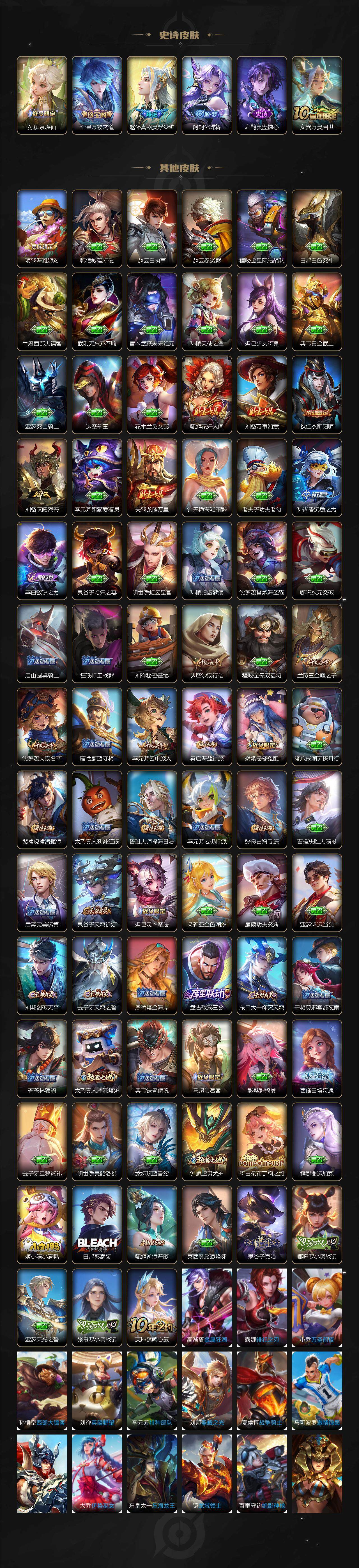 【史诗皮肤】:赵云皇家上将,赵云未来纪元,貂蝉圣诞恋歌,甄姬冰雪圆舞曲,狄仁杰魔术师,宫本武藏鬼剑武藏,孙尚香蔷薇恋人,孙尚香水果甜心,嬴政暗夜贵公子,嬴政摇滚巨星,妲己女仆咖啡,墨子金属风暴,吕布圣诞狂欢,曹操幽灵船长,李白千年之狐,花木兰水晶猎龙者,亚瑟心灵战警,安琪拉心灵骇客,百里守约特工魅影,李元芳逐浪之夏,程咬金功夫厨神,白起星夜王子,阿轲节奏热浪,孙策猫狗日记,狄仁杰鹰眼统帅,裴擒虎李小龙,百里玄策热力回旋,钟馗乐园奇幻夜,雅典娜黎明之约,韩信傲雪梅枪,鬼谷子五谷丰年,元歌无心,暃星界游侠,阿古朵江河有灵,妲己灵卜魔法,高渐离燃音魔法,孙膑茶境仙,弈星万物之道,赵怀真器灵浮梦炉,阿轲化蝶舞,扁鹊灵蛊蚀心,女娲万灵启世