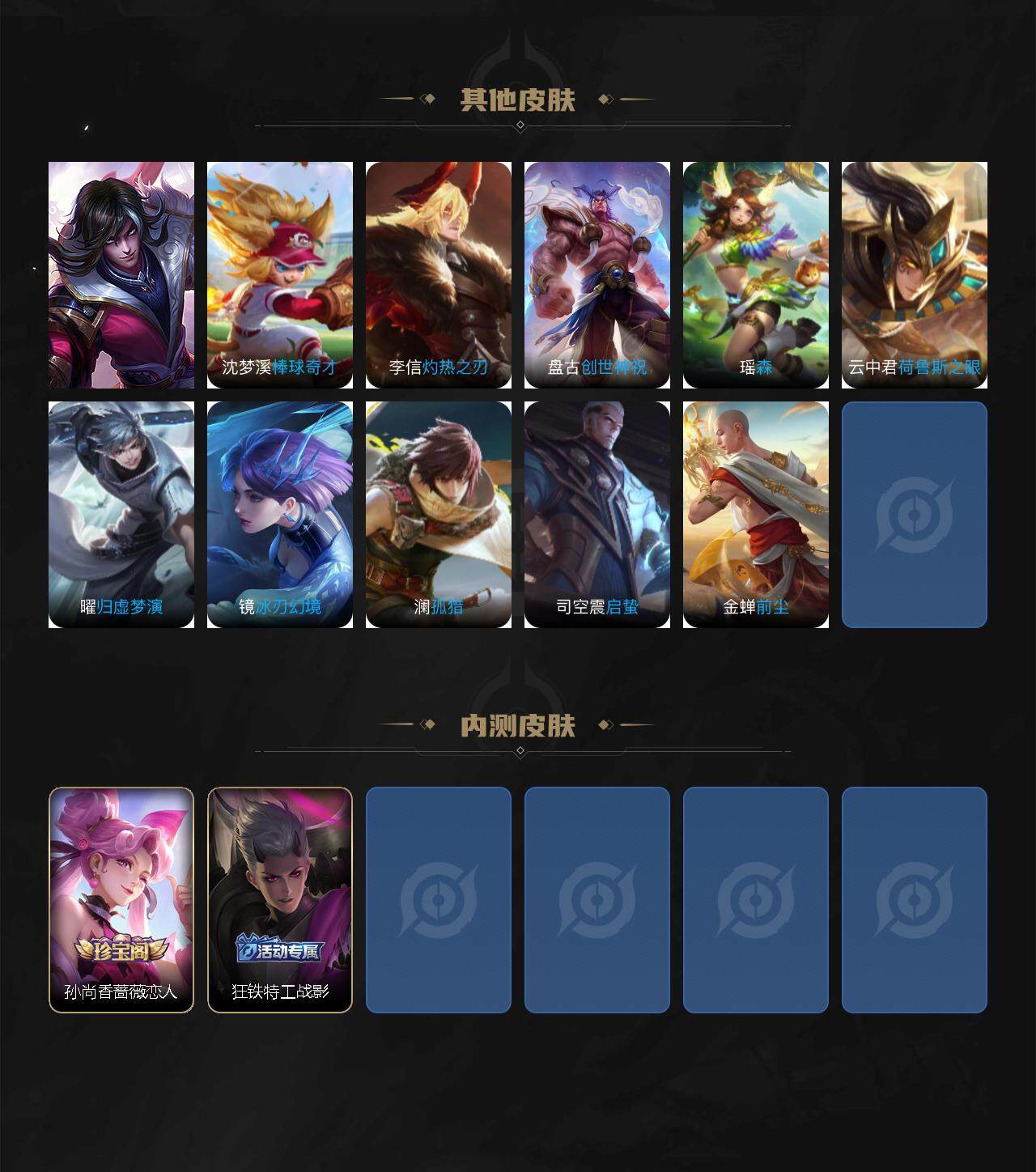 【限定皮肤】:姜子牙天穹之誓,狄仁杰阴阳师,赵云皇家上将,孙尚香蔷薇恋人,元歌无心,狄仁杰魔术师,达摩沙漠行僧,项羽海滩派对,韩信傲雪梅枪,兰陵王金庭之子,李元芳云中旅人,雅典娜黎明之约,鬼谷子五谷丰年,沈梦溪大漠名商,裴擒虎李小龙,裴擒虎擒涛扼浪,嫦娥暖冬兔眠,鲁班大师探海日志,桑启海盐诗旅,暃星界游侠,阿古朵江河有灵,张良古海寻踪,高渐离燃音魔法,妲己灵卜魔法,鬼谷子天穹祈灯,刘邦剑破天穹,周瑜熔金海岸