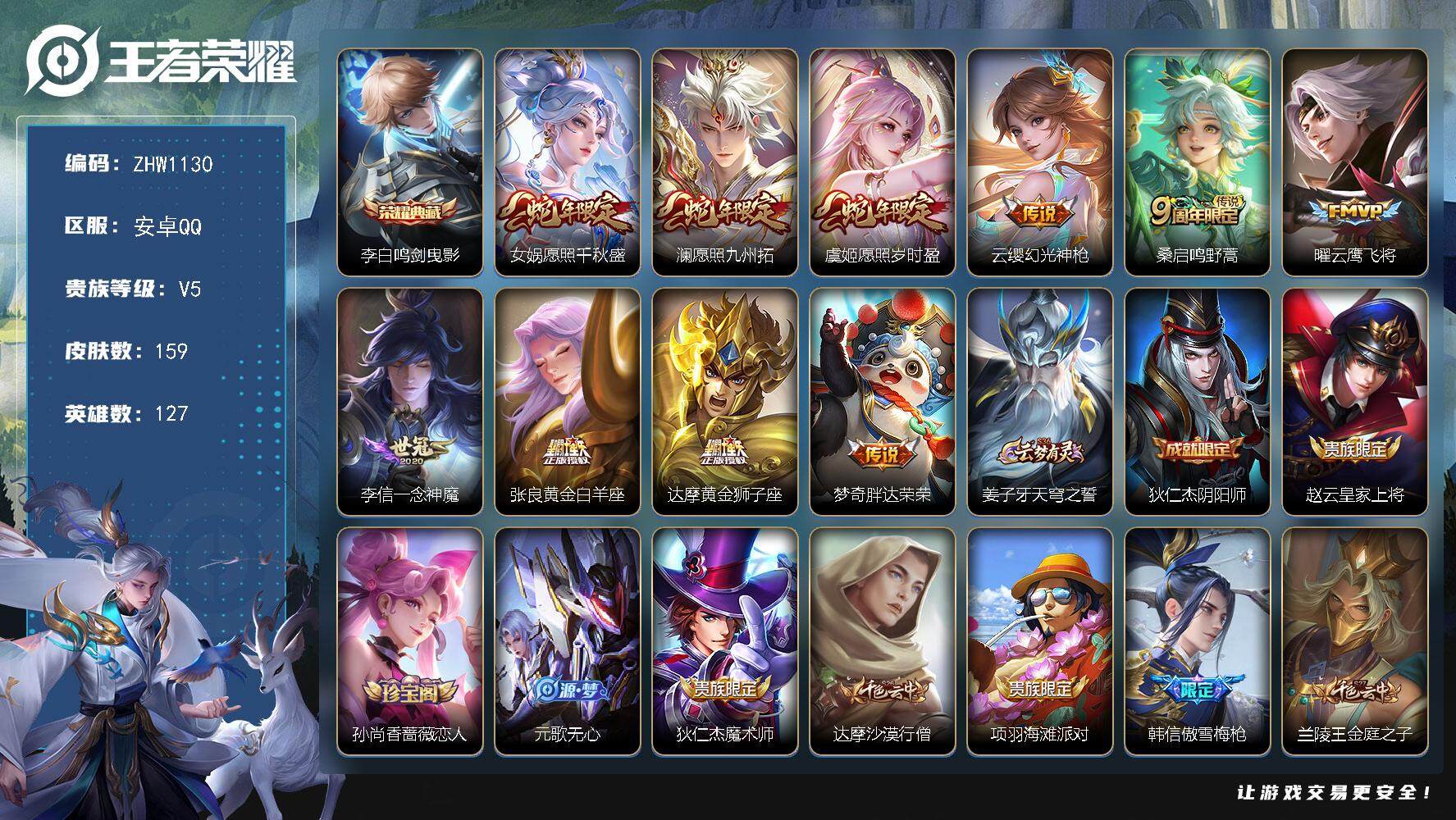 [13565269]【店主推荐捡漏号!可直接换绑】安卓Q-V5-至尊星耀III段位-127英雄-159皮肤-1典藏-10传说-41史诗 【英雄全皮】:影全皮 【荣耀典藏】:李白鸣剑曳影 【传说皮肤】:女娲愿照千秋盛,澜愿照九州拓,虞姬愿照岁时盈,云缨幻光神枪,桑启鸣野蒿,曜云鹰飞将,李信一念神魔,张良黄金白羊座,达摩黄金狮子座,梦奇胖达荣荣 【限定皮肤】:姜子牙天穹之誓,狄仁杰阴阳师,赵云皇家上将,孙尚香蔷薇恋人,元歌无心,狄仁杰魔术师,达摩沙漠行僧,项羽海滩派对,韩信傲雪梅枪,兰陵王金庭之子,李元芳云中旅人,雅典娜黎明之约,鬼谷子五谷丰年,沈梦溪大漠名商,裴擒虎李小龙,裴擒虎擒涛扼浪,嫦娥暖冬兔眠,鲁班大师探海日志,桑启海盐诗旅,暃星界游侠,阿古朵江河有灵,张良古海寻踪,高渐离燃音魔法,妲己灵卜魔法,鬼谷子天穹祈灯,刘邦剑破天穹,周瑜熔金海岸 【赛季限定】:达摩沙漠行僧,兰陵王金庭之子,张良古海寻踪,李元芳云中旅人,雅典娜黎明之约,沈梦溪大漠名商,裴擒虎擒涛扼浪,鲁班大师探海日志,桑启海盐诗旅,鬼谷子天穹祈灯,刘邦剑破天穹,姜子牙天穹之誓 【战令限定】:嫦娥暖冬兔眠,暃星界游侠,高渐离燃音魔法,妲己灵卜魔法 【史诗皮肤】:赵云皇家上将,赵云未来纪元,貂蝉圣诞恋歌,甄姬冰雪圆舞曲,狄仁杰魔术师,宫本武藏鬼剑武藏,孙尚香蔷薇恋人,孙尚香水果甜心,嬴政暗夜贵公子,嬴政摇滚巨星,妲己女仆咖啡,墨子金属风暴,吕布圣诞狂欢,曹操幽灵船长,李白千年之狐,花木兰水晶猎龙者,亚瑟心灵战警,安琪拉心灵骇客,百里守约特工魅影,李元芳逐浪之夏,程咬金功夫厨神,白起星夜王子,阿轲节奏热浪,孙策猫狗日记,狄仁杰鹰眼统帅,裴擒虎李小龙,百里玄策热力回旋,钟馗乐园奇幻夜,雅典娜黎明之约,韩信傲雪梅枪,鬼谷子五谷丰年,元歌无心,暃星界游侠,阿古朵江河有灵,妲己灵卜魔法,高渐离燃音魔法,孙膑茶境仙,弈星万物之道,赵怀真器灵浮梦炉,阿轲化蝶舞,扁鹊灵蛊蚀心,女娲万灵启世 【其他皮肤】:项羽海滩派对,韩信教廷特使,赵云白执事,赵云忍炎影,程咬金星际陆战队,白起白色死神,牛魔西部大镖客,武则天东方不败,宫本武藏未来纪元,孙膑天使之翼,妲己少女阿狸,典韦黄金武士,亚瑟死亡骑士,达摩拳王,花木兰兔女郎,甄姬花好人间,刘备万事如意,狄仁杰阴阳师,刘备汉昭烈帝,李元芳黑猫爱糖果,关羽龙腾万里,钟无艳海滩丽影,老夫子功夫老勺,孙尚香