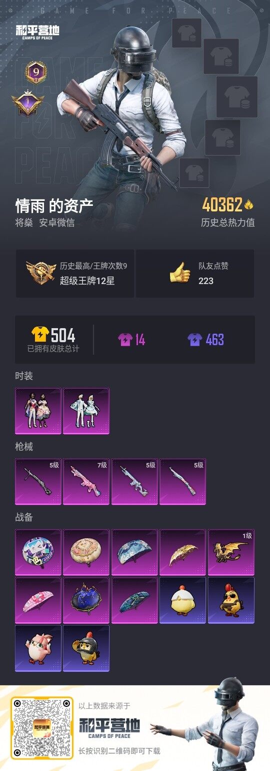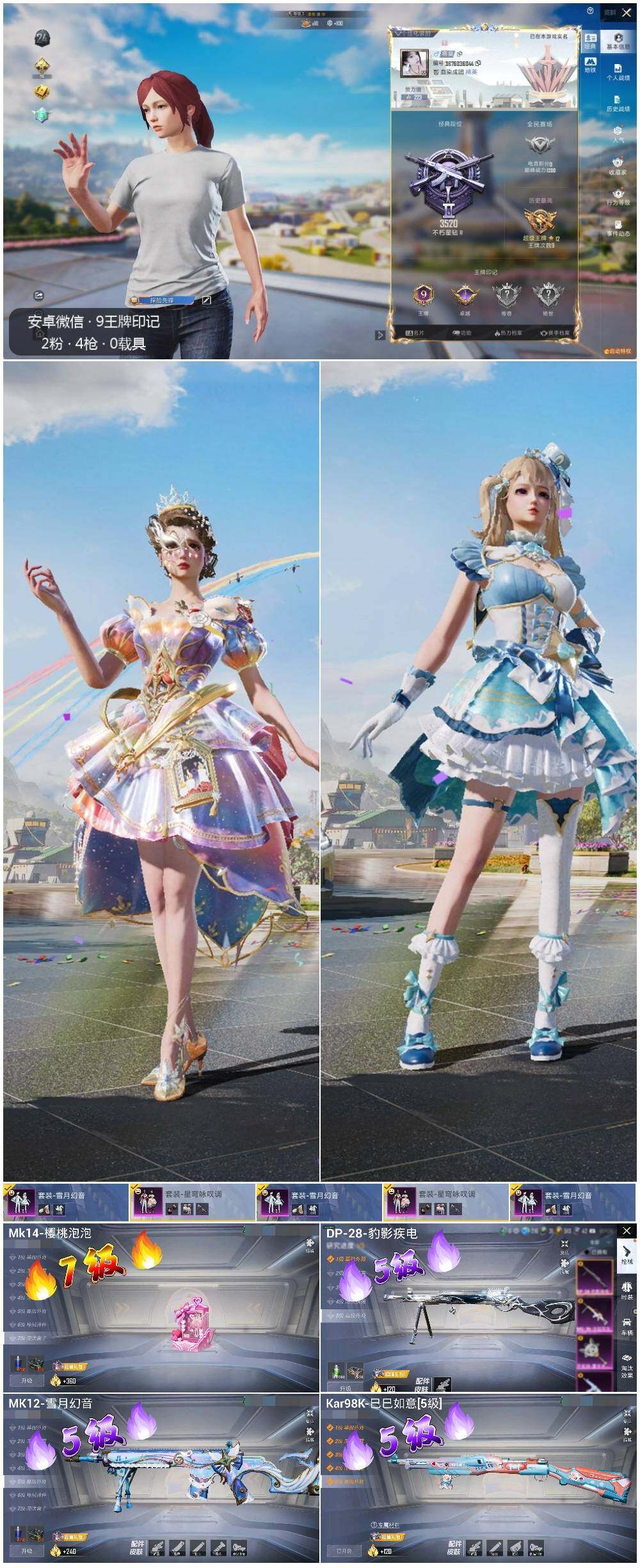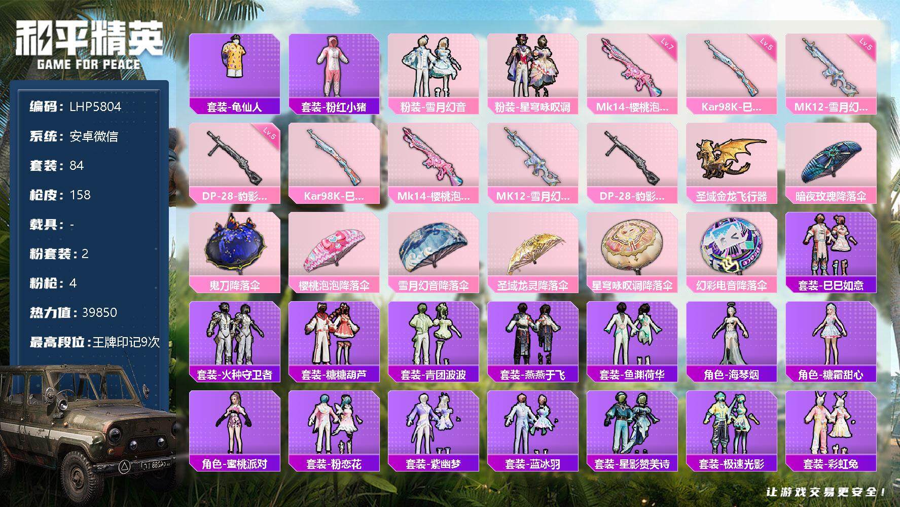 [13230563]安卓 微信-2粉装-4特效枪-1粉色飞行器-3.9w热力值-9王牌印记-84套装-158枪皮【热门品类】:套装-龟仙人,套装-粉红小猪【粉色套装】:粉装-雪月幻音,粉装-星穹咏叹调【粉色枪皮等级】:Kar98K-巳巳如意(五级),Mk14-樱桃泡泡(七级),MK12-雪月幻音(五级),DP-28-豹影疾电(五级)【粉色飞行器】:圣域金龙飞行器