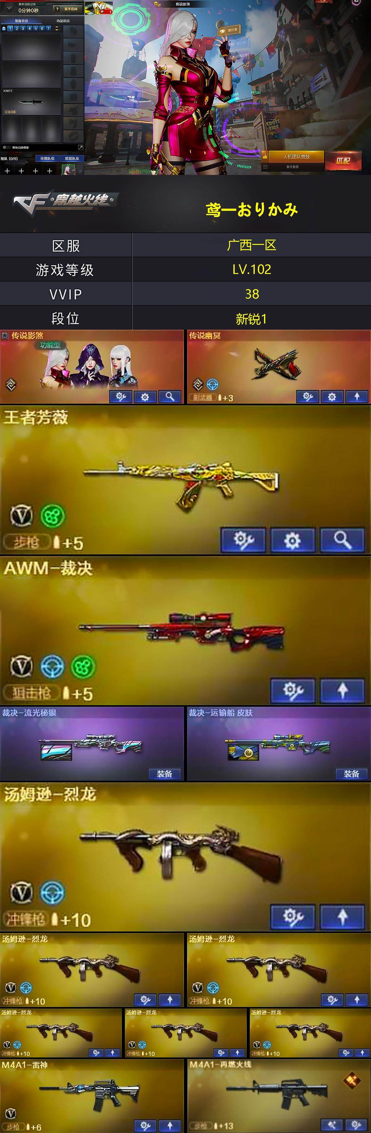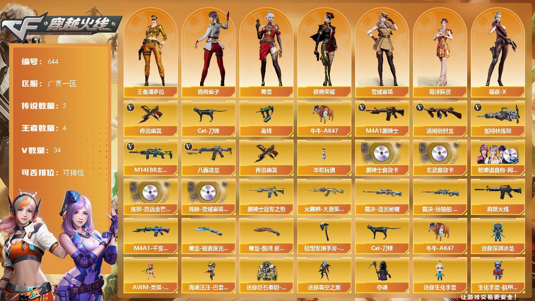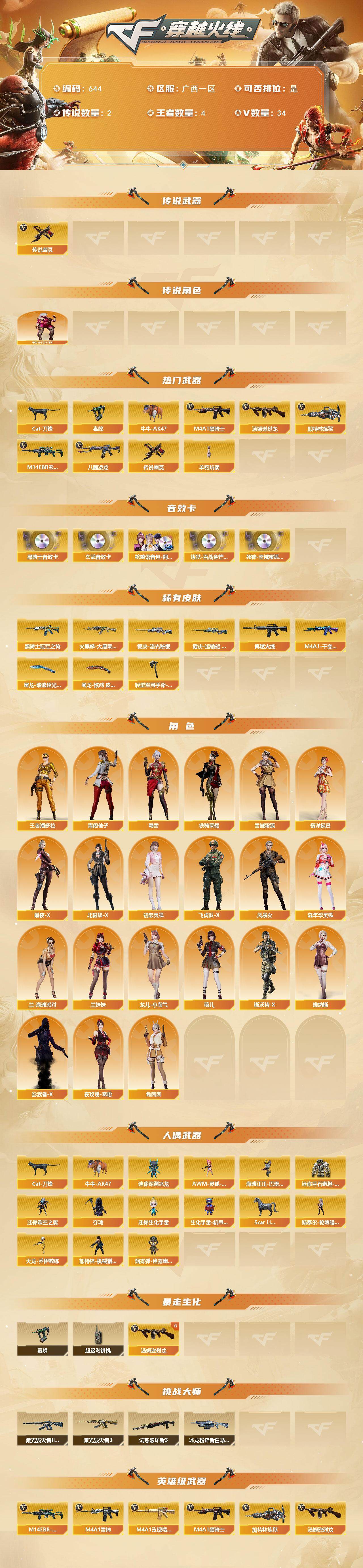[13654375]广西一区-34V-4王者-0炫金 【传说武器】:传说幽冥 【传说角色】:传说影煞 【热门武器】:传说幽冥,M14EBR-玄武,八面凌龙,Cat-刀锋,毒蜂,牛牛-AK47,M4A1-黑骑士,汤姆逊-烈龙*6,加特林-炼狱,羊驼玩偶 【音效卡】:M4A1-黑骑士音效卡,枪娘语音包-阿敏,M14EBR-玄武音效卡,炼狱-百战金芒-庆典舞曲音效卡,死神-雪域霜狐-怀旧音效卡 【皮肤】:裁决-流光秘银,裁决-运输船 皮肤,M4A1-再燃火线,火麒麟-大唐荣光,M4A1-千变-孔明皮肤*2,黑骑士-冠军之势,屠龙-破浪逐光 皮肤,屠龙-惊鸿 皮肤,轻型军用手斧-再燃火线 【角色】:王者潘多拉,雪域霜狐,奇洋探员,暗夜-X,北极狐-X,初恋灵狐,飞虎队-X,风暴女,嘉年华灵狐,兰-海滩派对,兰妹妹,龙儿-小淘气,萌儿,青霞仙子,斯沃特-X,蜀雪,铁骑荣耀,兔囡囡,维纳斯,夜玫瑰-宠粉,影武者-X 【人偶武器】:天龙-乔伊教练,Scar Light-马枪,斯泰尔-枪娘暗刃,加特林-机械猎手,AWM-灵狐-15周年嘉年华*2,海滩汪汪-巴雷特,Cat-刀锋,牛牛-AK47,迷你深渊冰龙,迷你裂空之翼,夺魂,迷你生化手雷,生化手雷-机甲核心*3,迷你巨石泰坦-魔花研究所,烟雾弹-迷雾幽灵 【暴走生化】:毒蜂,超级对讲机 【挑战大师】:冰龙粉碎者-白马银枪*3,激光毁灭者III-白马银枪,激光毁灭者III,试炼破坏者III 【英雄级武器】:AK47-火麒麟*2,M4A1-雷神,M4A1-黑骑士,AN94-超新星,M4A1-龙血,M14EBR-玄武,黑武士-锦绣游龙,八面凌龙,M4A1-玫瑰精灵,王者芳薇-觉醒版,Barrett-毁灭,AWM-裁决,王者之怒-觉醒版,加特林-炼狱,炼狱-百战金芒,汤姆逊-烈龙*6,沙鹰-天神,屠龙*3,龙啸,擎天,麒麟刺,麒麟刺-百战金芒,高爆手雷-幻灵,手雷-热带奇洋,M4A1-赤狱骑士 【道具】:BS战队炫彩背包,CFS限定背包,云山科技背包,云海游龙炫彩背包,奇洋探员-海龟背包,战舰背包,机械魔影背包-红色,炫彩背包-诺拉,百战金芒炫彩背包,老虎背包,背包-洛丽塔,超级背包,雪域霜狐炫彩背包,圣拳猎手-炽雪,虚空终结者-暗域熔岩,女皇终结者-魔龙之吻,救世主-黑桃战神,黄金生化钩,绿色巨人,灵魂忍者*2,变异宝贝,迷雾幽灵*2,生化弹匣,夺命之镰