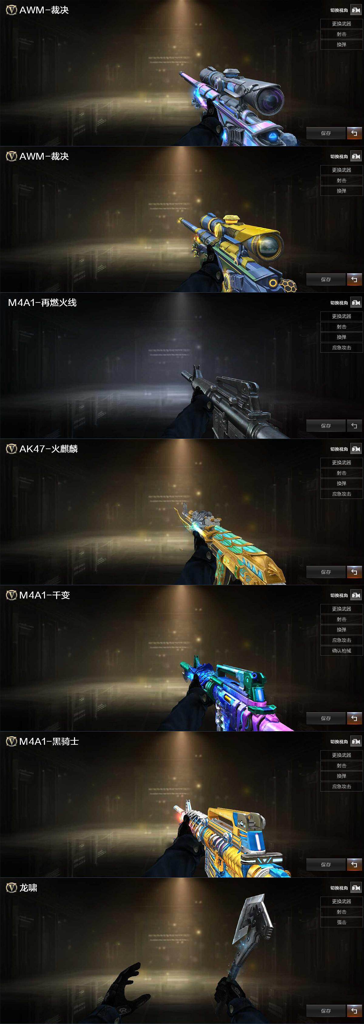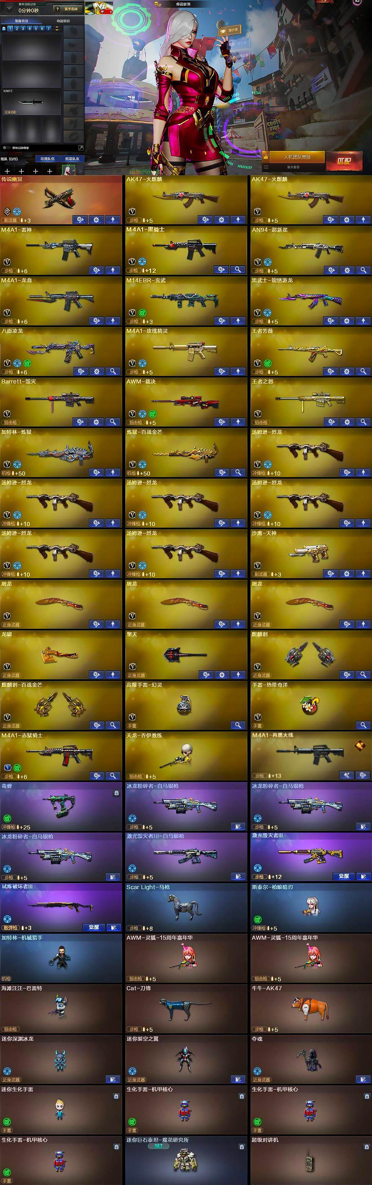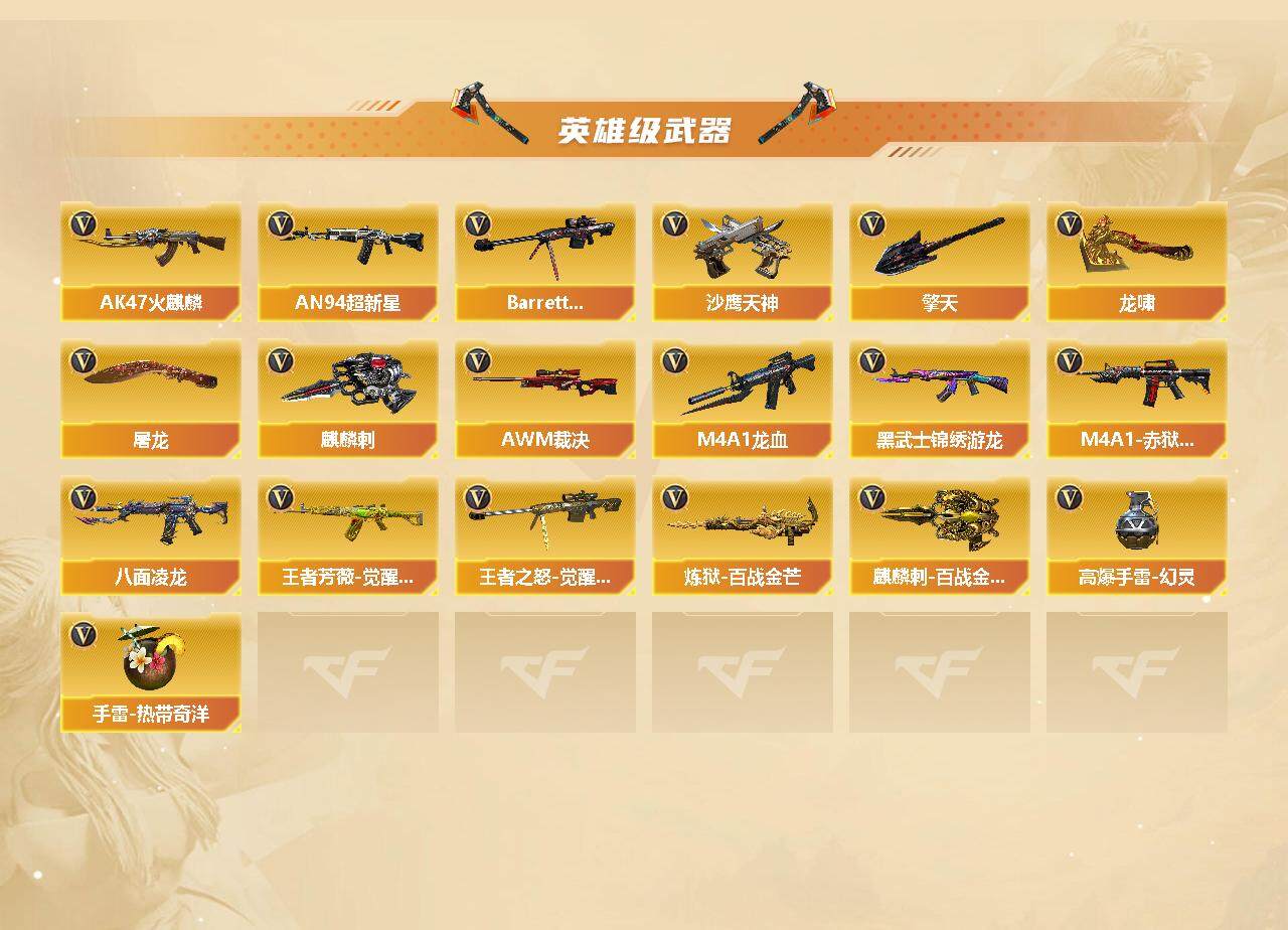 【英雄级武器】:AK47-火麒麟*2,M4A1-雷神,M4A1-黑骑士,AN94-超新星,M4A1-龙血,M14EBR-玄武,黑武士-锦绣游龙,八面凌龙,M4A1-玫瑰精灵,王者芳薇-觉醒版,Barrett-毁灭,AWM-裁决,王者之怒-觉醒版,加特林-炼狱,炼狱-百战金芒,汤姆逊-烈龙*6,沙鹰-天神,屠龙*3,龙啸,擎天,麒麟刺,麒麟刺-百战金芒,高爆手雷-幻灵,手雷-热带奇洋,M4A1-赤狱骑士